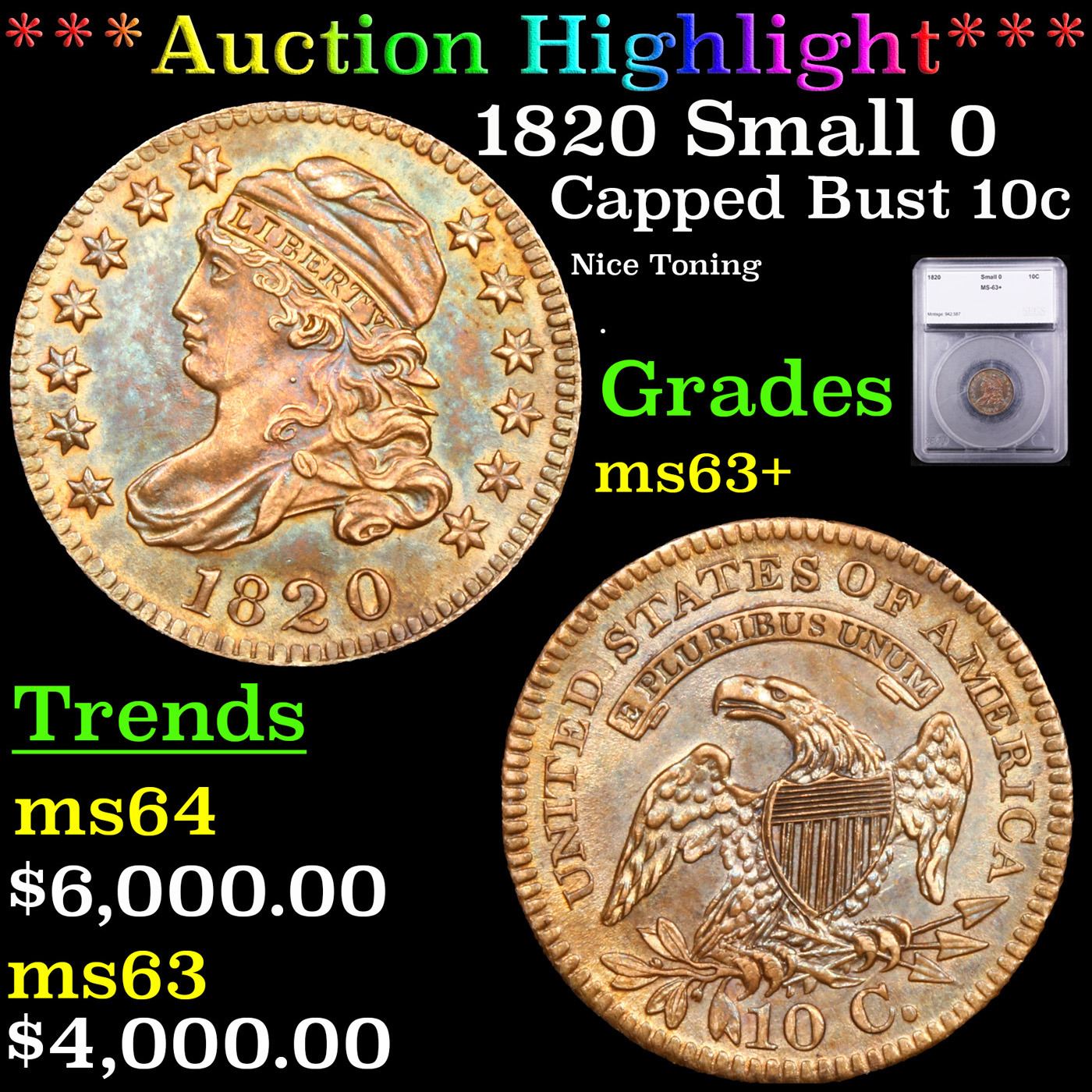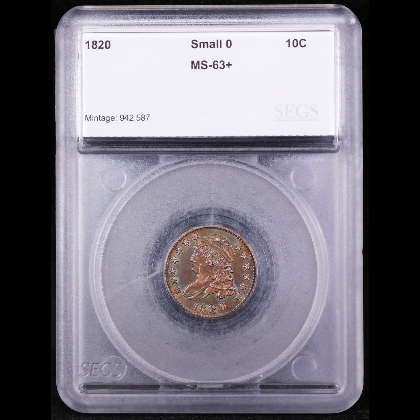 ***Auction Highlight*** 1820 Small 0 Capped Bust Dime 10c Graded ms63+ BY SEGS. A Key Date's Pick, Bid to Win, Don't let it get Away, you might not find its equal Coin