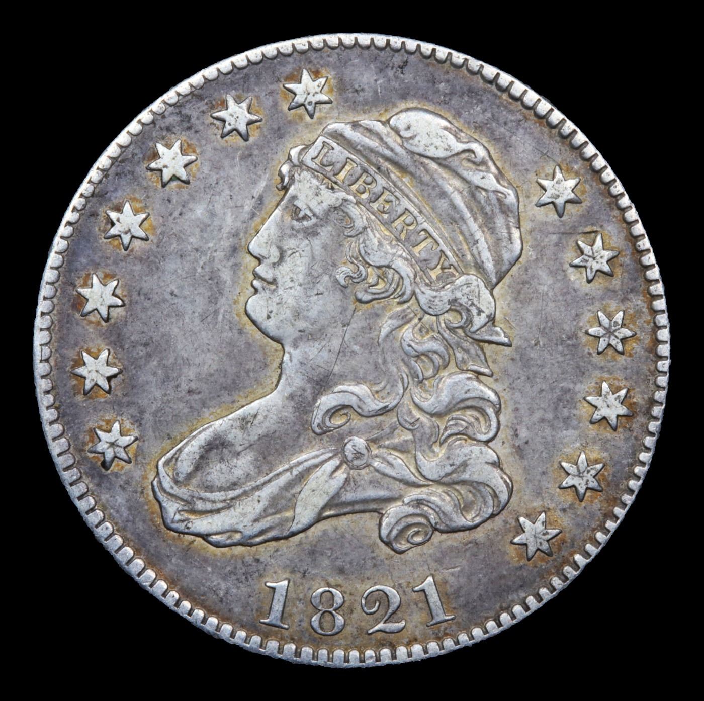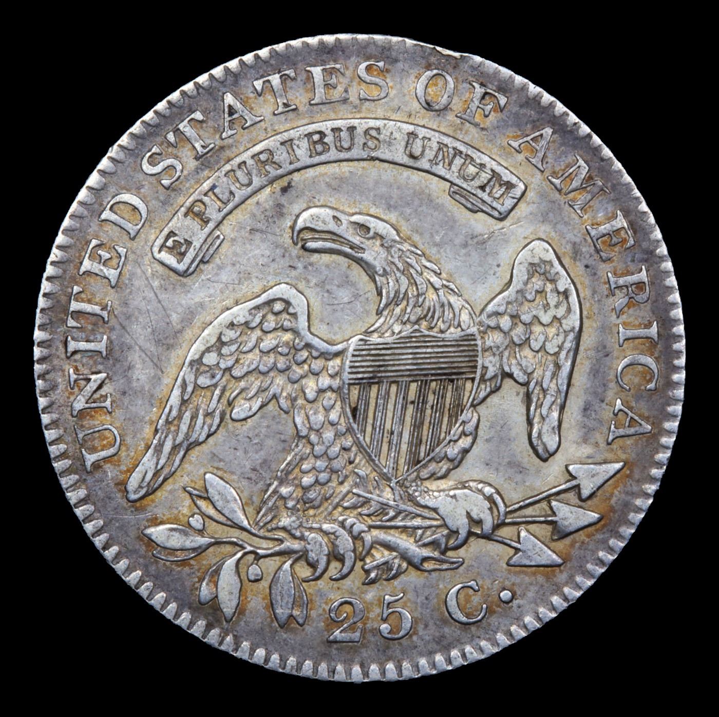 ***Auction Highlight*** 1821 Browning 3 Capped Bust Quarter 25c Graded xf+ By USCG. Tompkins Die State 5/1. Forest-green and lavender toning drapes this refreshingly unabraded Draped Bust quarter. The plumage exhibits nearly full detail, although the curls and claws show moderate wear. A charming type coin that will improve most specialized collections. A Corey's Pick, Bid to Win, Don't let it get Away Coin
