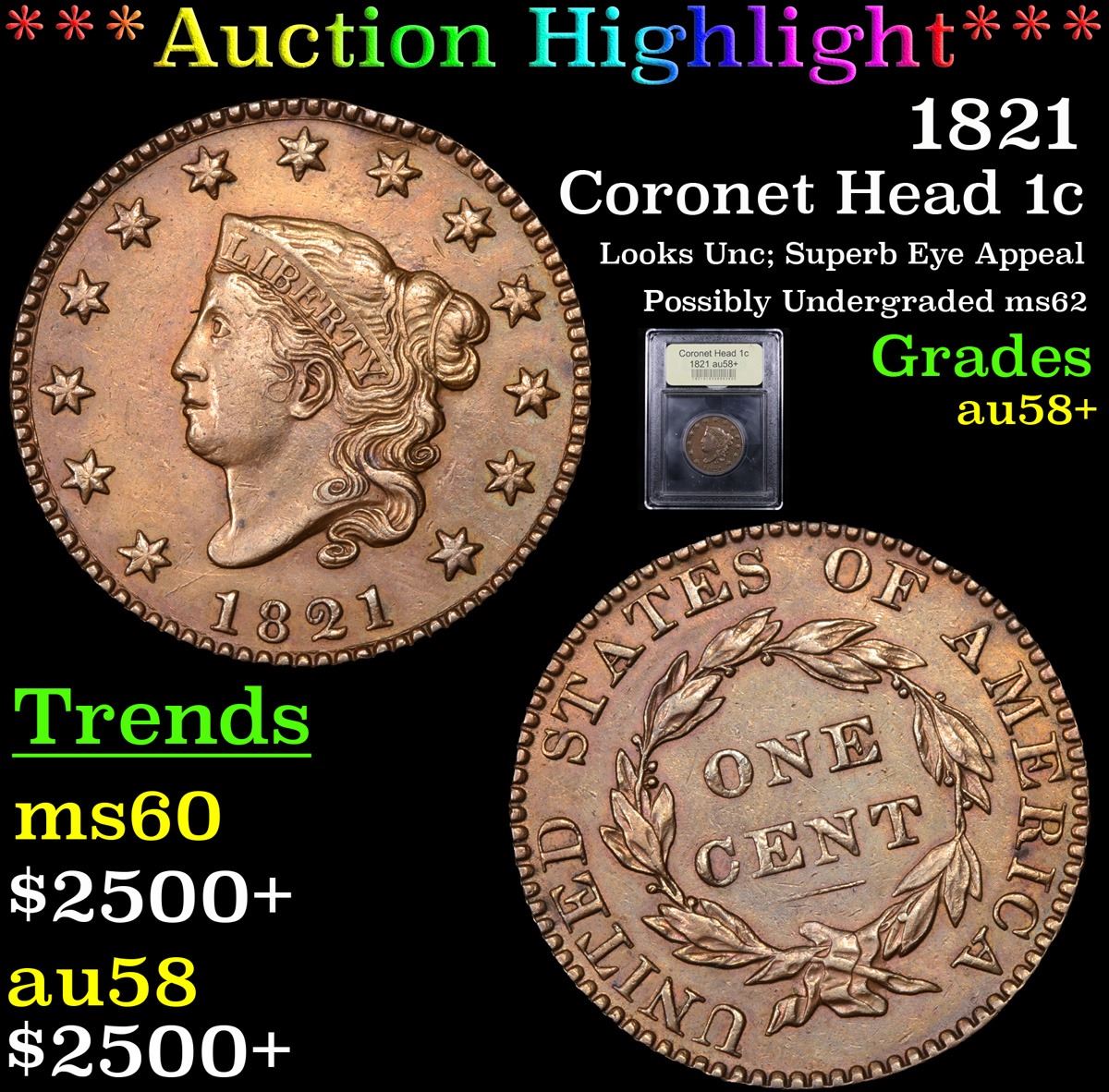 ***Auction Highlight*** 1821 Looks Unc; Superb Eye Appeal Possibly Undegraded ms62 Coronet Head Large Cent 1c Graded Choice AU/BU Slider+ By USCG. A Corey's Pick, Bid to Win, Don't let it get Away, you might not find its equal Coin