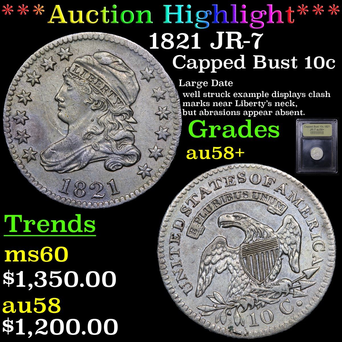 ***Auction Highlight*** 1821 JR-7 Capped Bust Dime 10c Graded Choice AU/BU Slider+ By USCG. A high second S in STATES is the primary pick-up point for JR-7. The obverse die coined only the present variety, and is distinguished by a low star 13. This well struck example displays clash marks near Liberty's neck, but abrasions appear absent. A Corey's Pick, Bid to Win, Don't let it get Away Coin