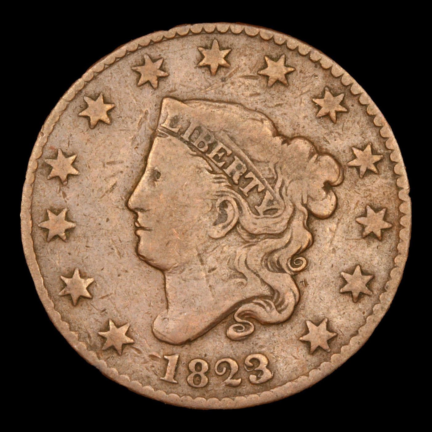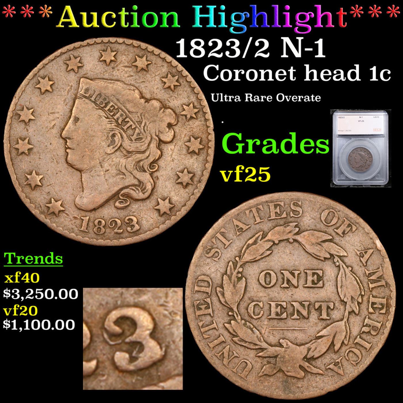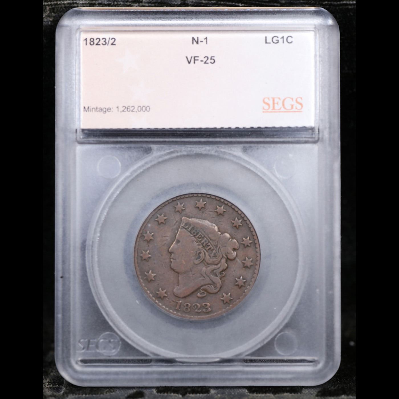 ***Auction Highlight*** 1823/2 N-1 Coronet Head Large Cent 1c Graded vf30 By SEGS. A Corey's Pick, Bid to Win Coin
