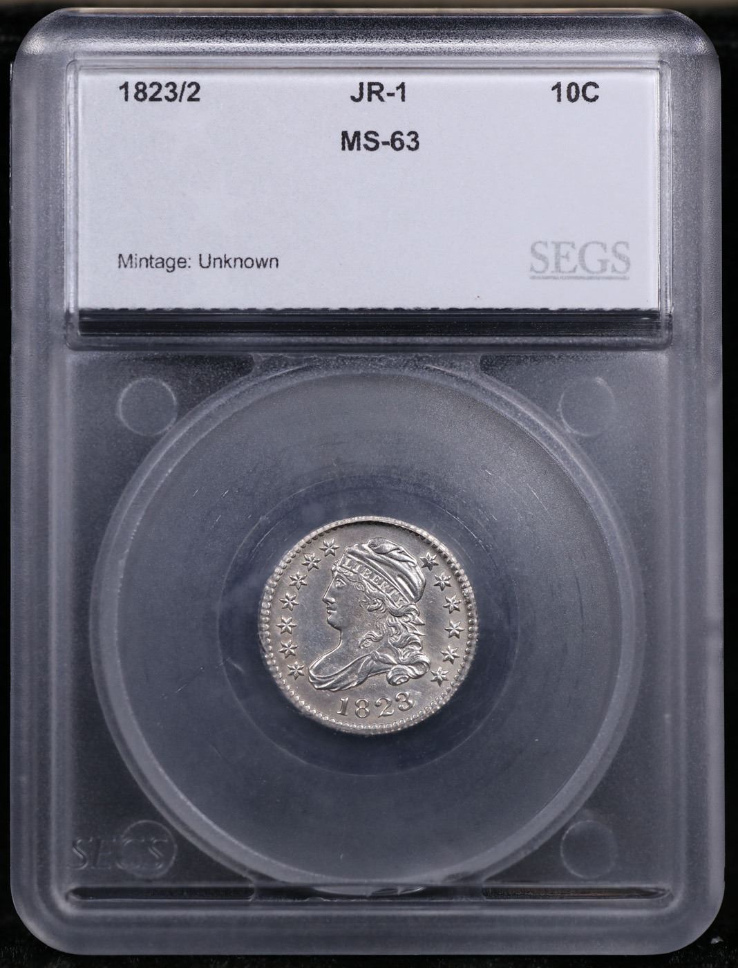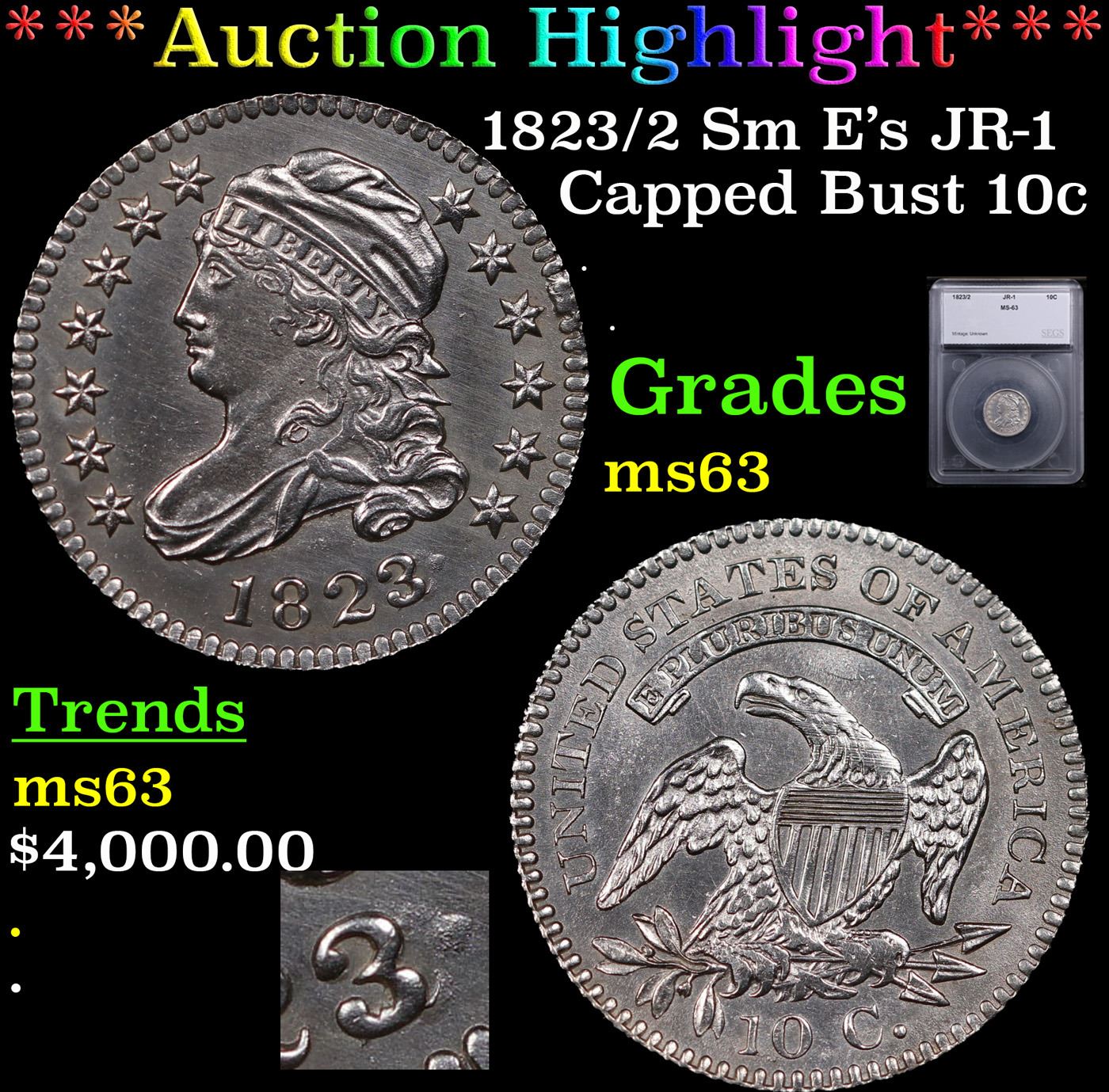 ***Auction Highlight*** 1823/2 Sm Es JR-1 Capped Bust Dime 10c Graded ms63 By SEGS. A Corey's Pick, Bid to Win, Don't let it get Away, you might not find its equal Coin