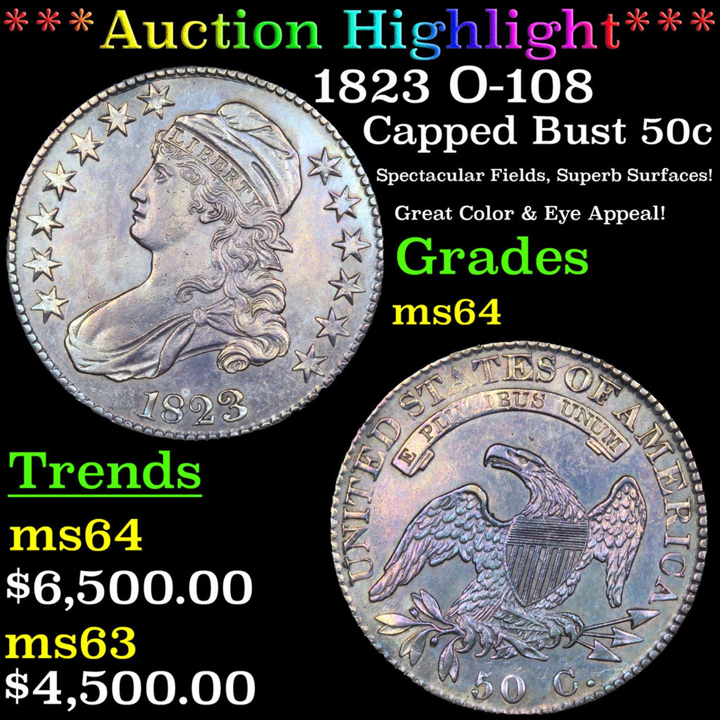 ***Auction Highlight*** 1823 O-108 Capped Bust Half Dollar 50c Graded Choice Unc BY USCG. A Key Date's Pick, Bid to Win Coin
