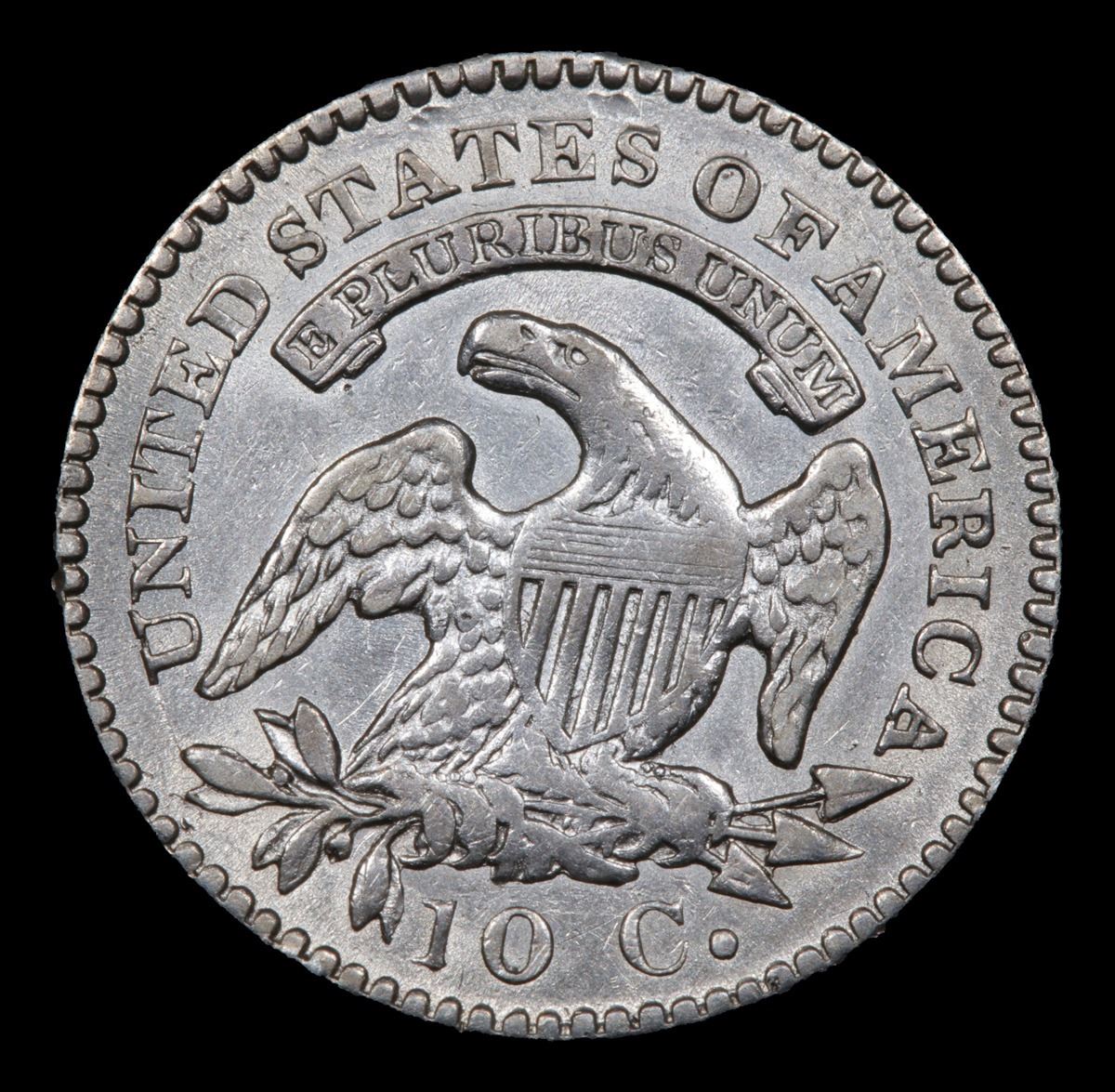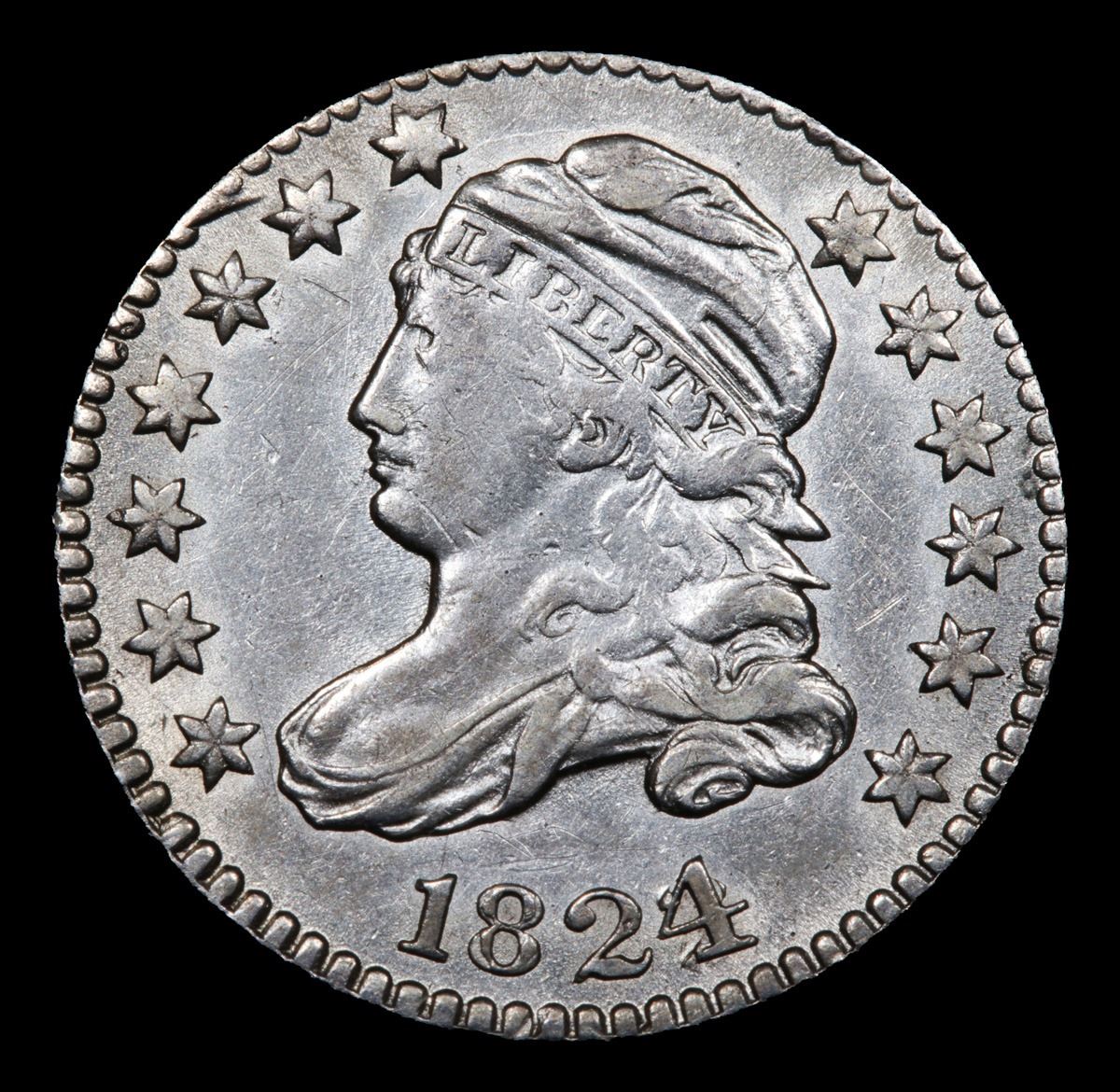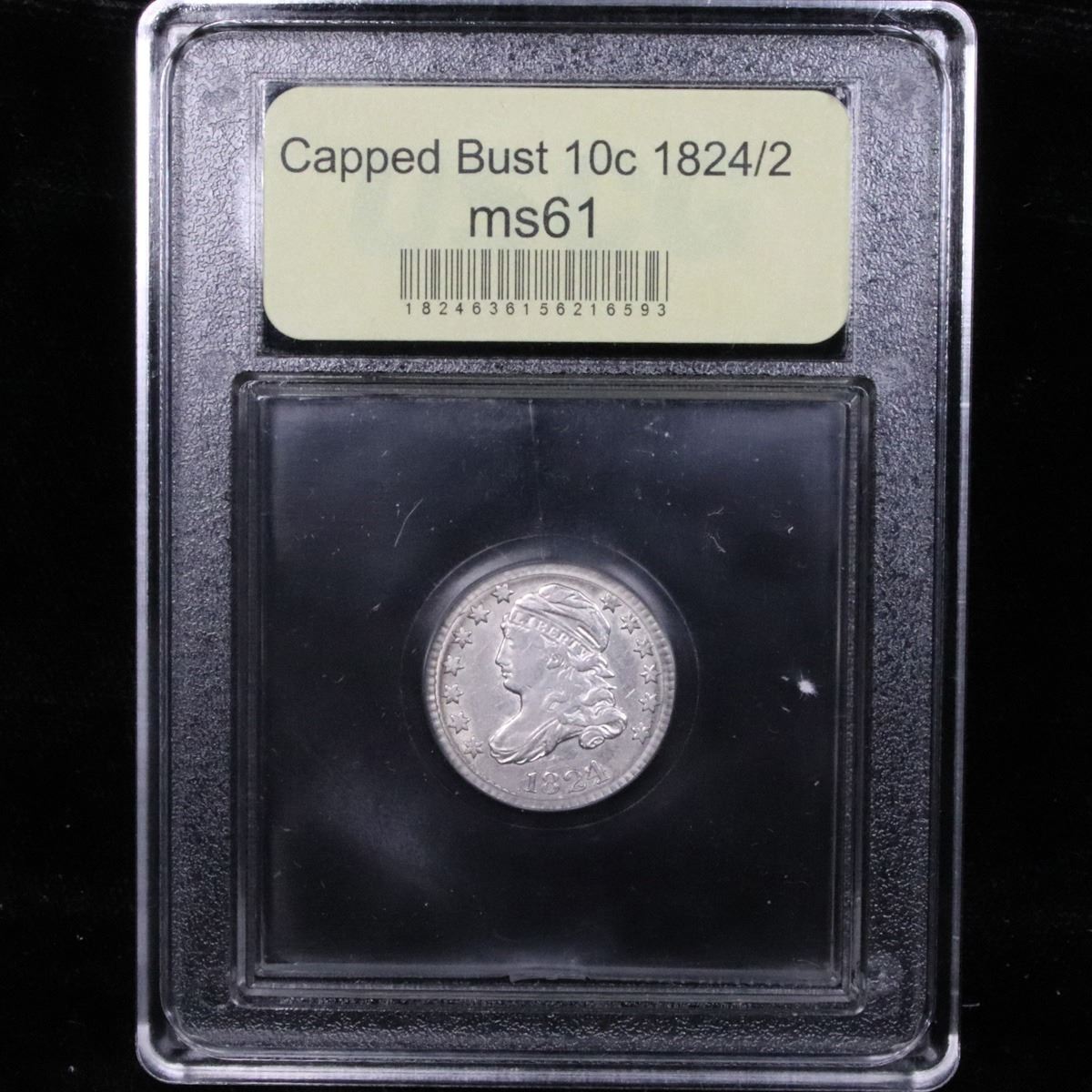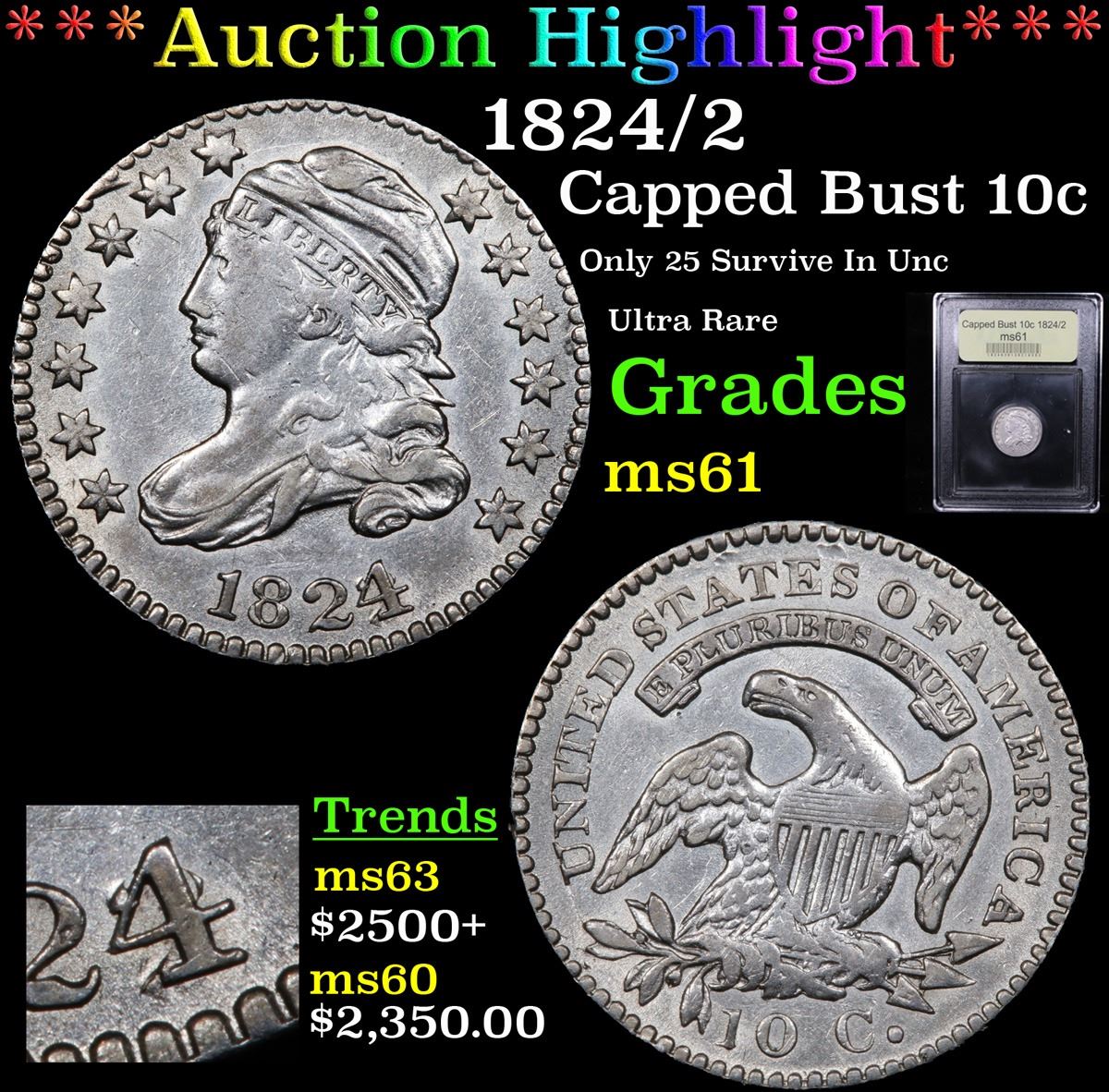 ***Auction Highlight*** 1824/2 Capped Bust Dime 10c Graded BU+ By USCG. Up for auction is an ultra rare 1824/2 Capped Bust Dime. PCGS estimates that only 250 examples survive in all grades with only 25 uncirculated pieces surviving. The exact number of 1824-dated dimes struck is unknown, the mintage was combined with that of the 1825 for a total of 510,000 pieces. As with the 1823 Dimes, all 1824 Dimes are overdate from old, unused 1822 dies. Mint employees utilized one obverse die and two different reverse dies to strike all of the 1824 Dimes. This example is the JR-1 which is attributable by a flat-top 1 in the denomination 10 C. The issue as a whole is conditionally challenging with Mint State survivors elusive and seldom offered in today's market. Here, then, is a rare Uncirculated example that would make an impressive addition to a high grade date set or advanced type collection. A Corey's Pick, Bid to Win, Don't let it get Away Coin