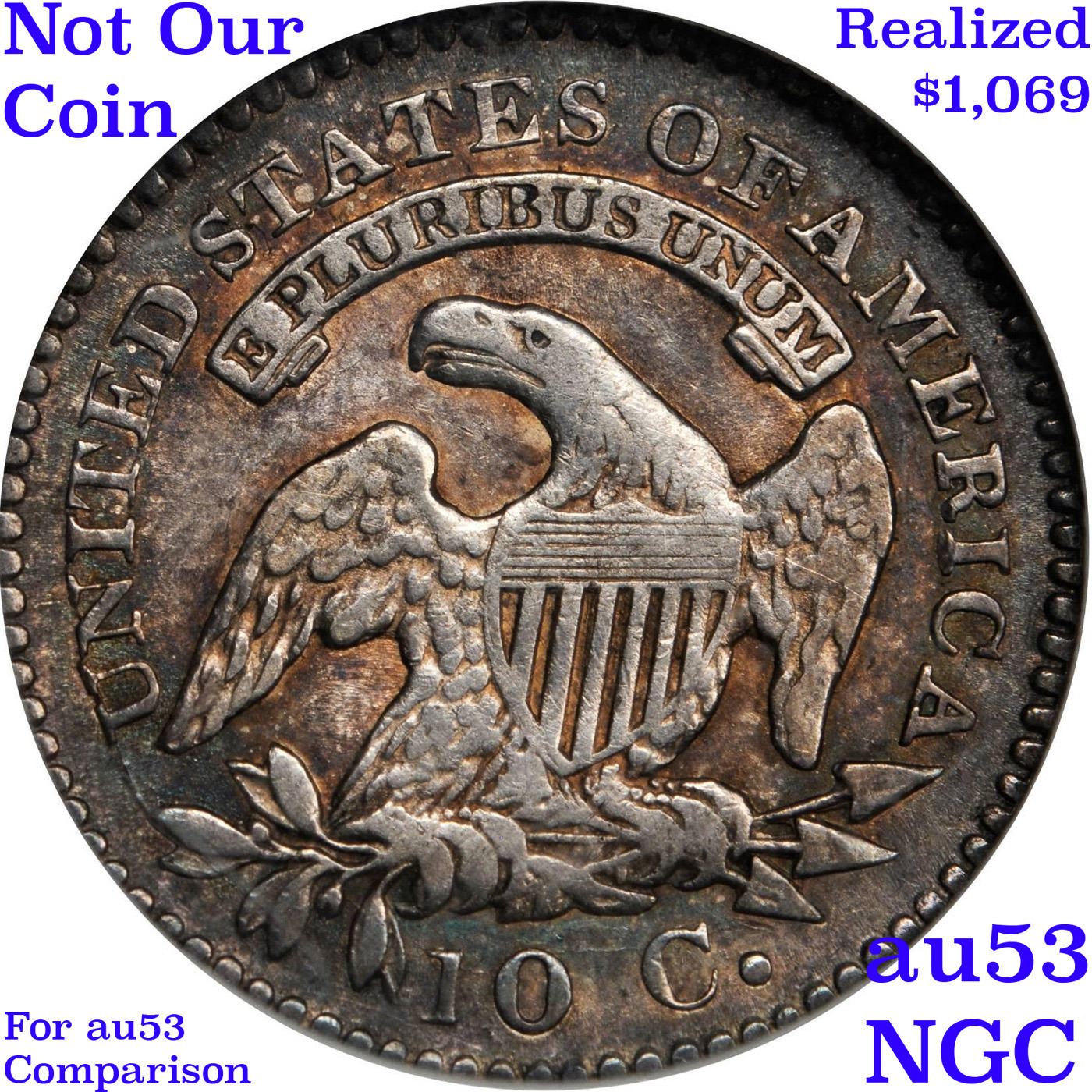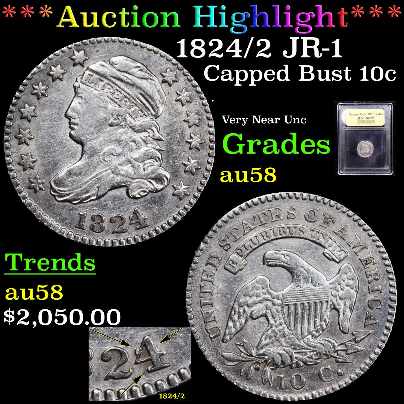 ***Auction Highlight*** 1824/2 JR-1 Capped Bust Dime 10c Graded Choice AU/BU Slider By USCG. Up for Auction is an ultra rare and lustrous 1824/2 Capped Bust Dime. Only 225 survive in all grades and only 25 in mint state. The coin at hand has just a bit of rub at the high points and virtually full luster. Plagued by weak strikes, the issue generally lacks full detail in the center devices. I have included 3 other examples to illustrate. Two au53 and one au58 example. The coin needs to be graded via the luster, which is virtually full. Even on the reverse where the luster is impeccable and unbroken, you will see the same weak strike on the eagles neck as on the three other examples provided. A Corey's Pick, Bid to Win, Don't let it get Away, you might not find its equal Coin
