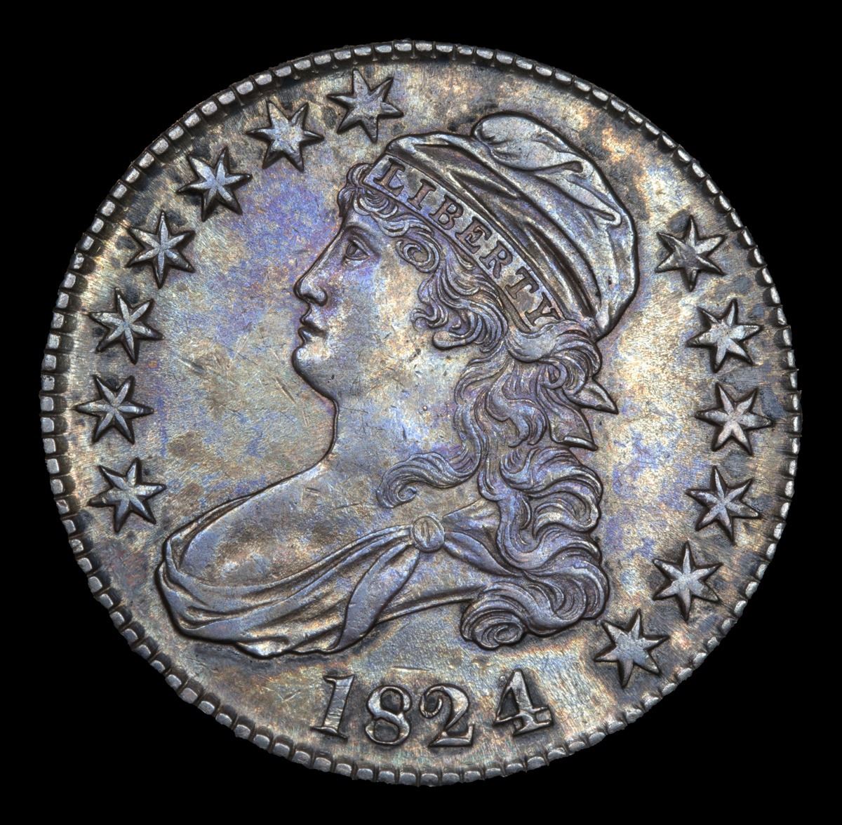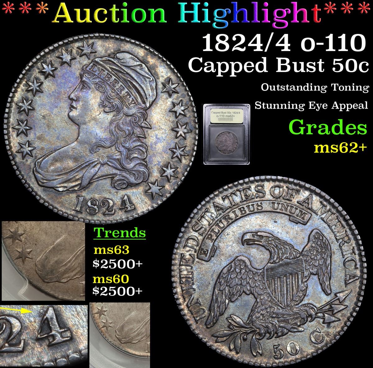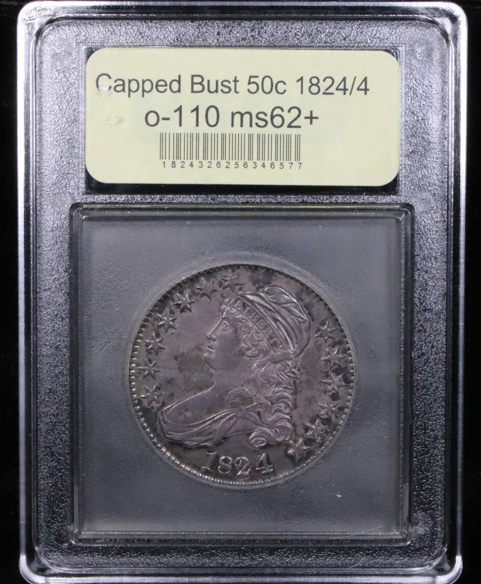 ***Auction Highlight*** 1824/4 o-110 Capped Bust Half Dollar 50c Graded Select Unc By USCG. Up for Auction is a dead on graded ms62+ 1824/4 Capped Bust Half Dollar. I have given a close up of an ms62 cac, ms63 & ms64 all in a PCGS holders, ours is heads and shoulders better. Stunning eye appeal, outstanding toning, dynamite full luster. By far the nicest 1824/4 we have ever brought to auction. PCGS estimates that only 50 survive in Uncirculated condition. ms63 $5000 and ms62 $3,750 A Corey's Pick, Bid to Win, Don't let it get Away, you might not find its equal Coin. I give this coin my highest recommendation