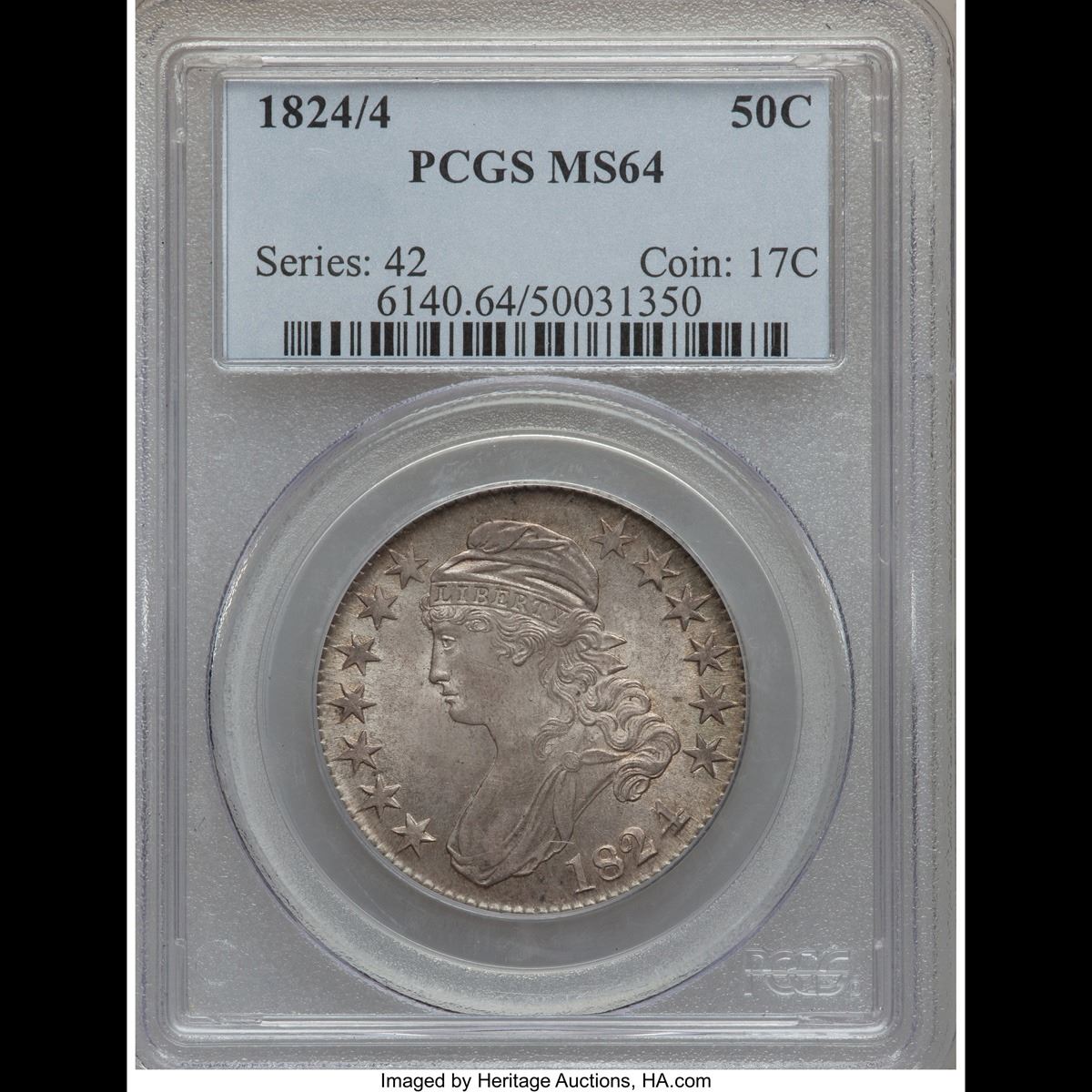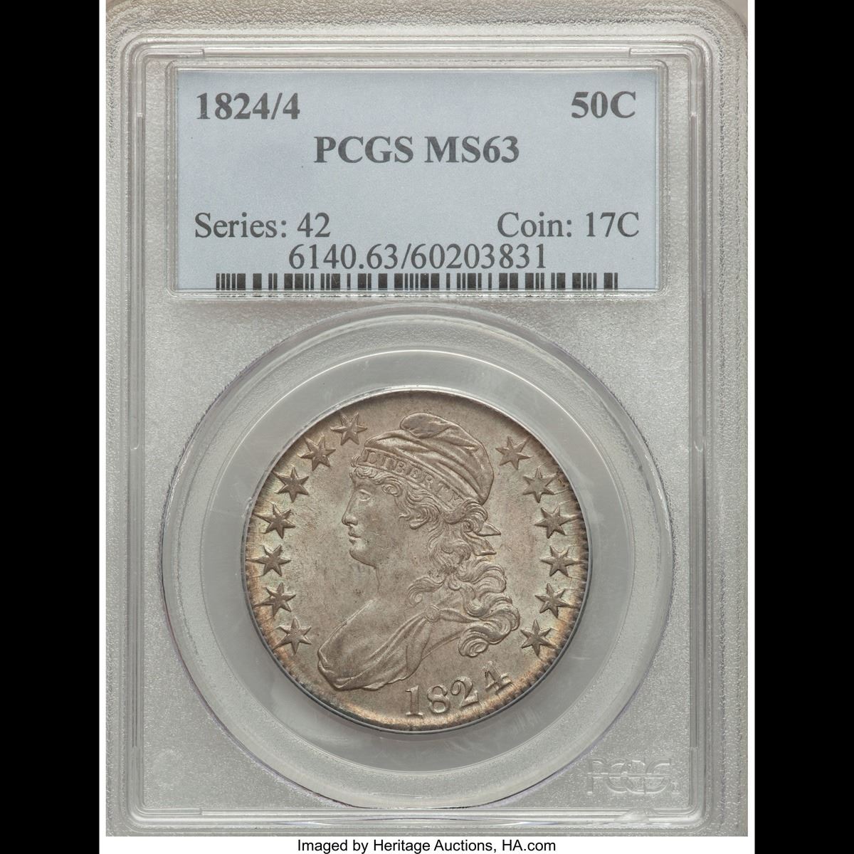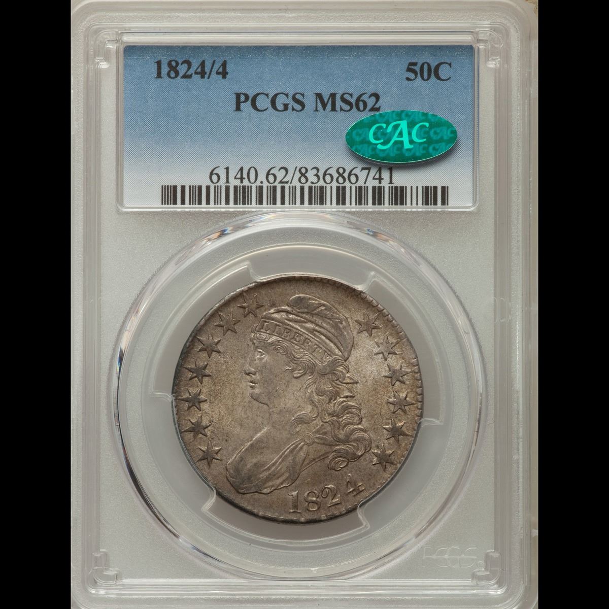 ***Auction Highlight*** 1824/4 o-110 Capped Bust Half Dollar 50c Graded Select Unc By USCG. Up for Auction is a dead on graded ms62+ 1824/4 Capped Bust Half Dollar. I have given a close up of an ms62 cac, ms63 & ms64 all in a PCGS holders, ours is heads and shoulders better. Stunning eye appeal, outstanding toning, dynamite full luster. By far the nicest 1824/4 we have ever brought to auction. PCGS estimates that only 50 survive in Uncirculated condition. ms63 $5000 and ms62 $3,750 A Corey's Pick, Bid to Win, Don't let it get Away, you might not find its equal Coin. I give this coin my highest recommendation