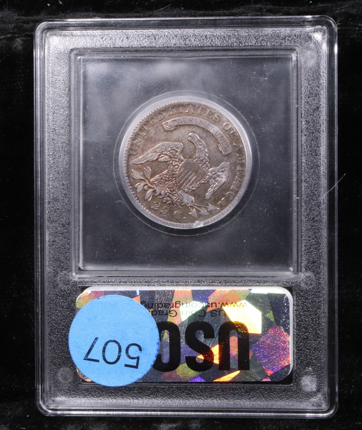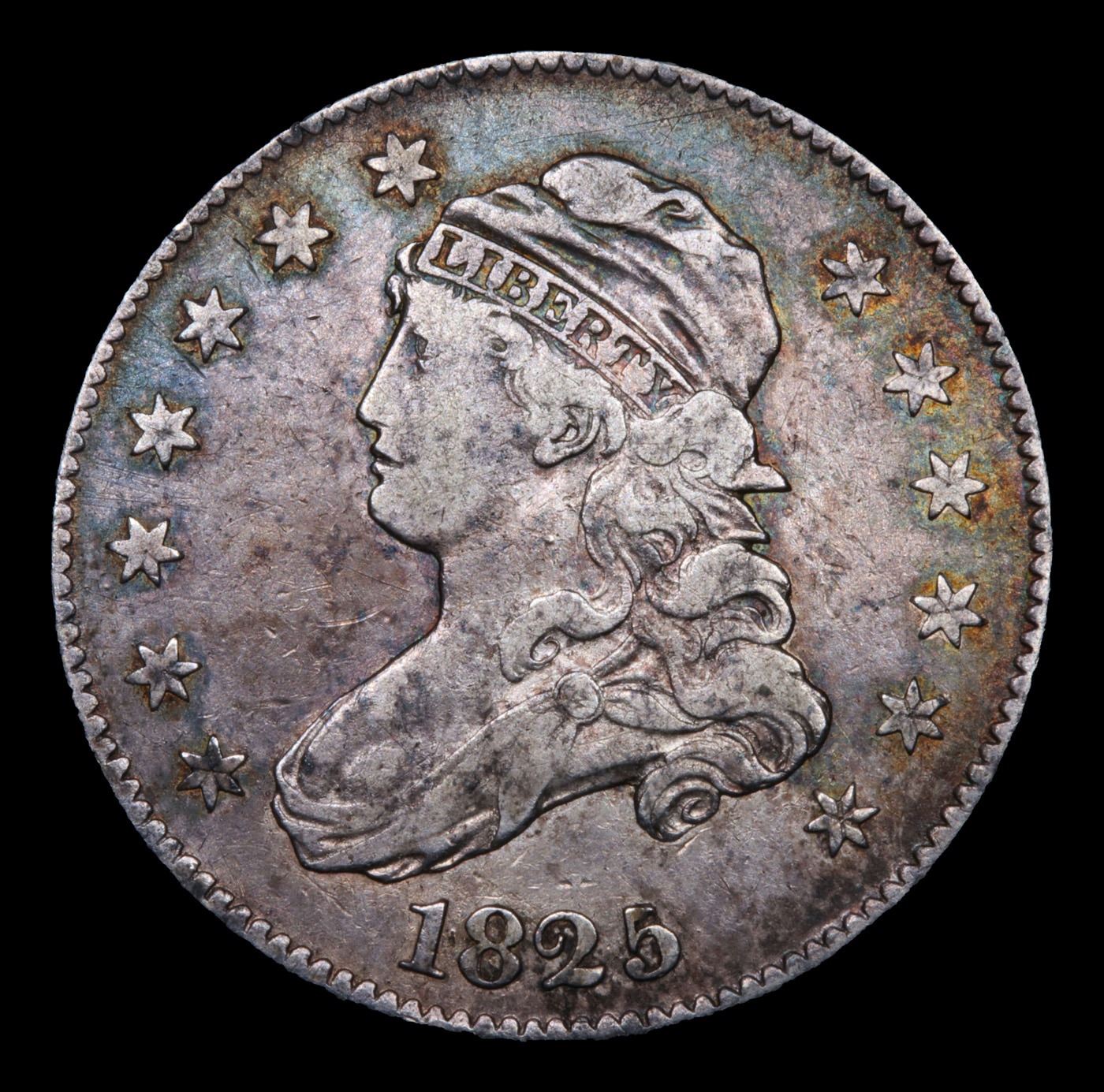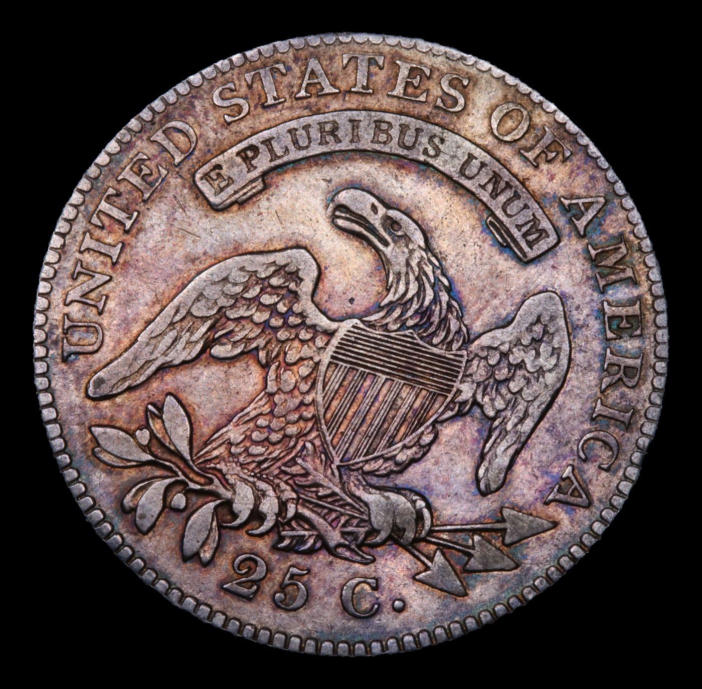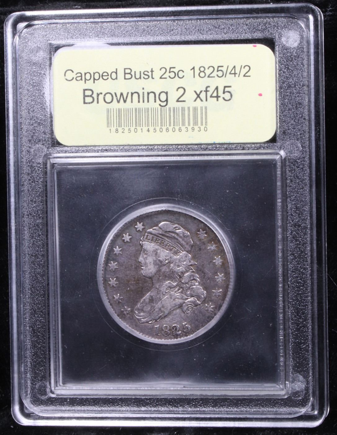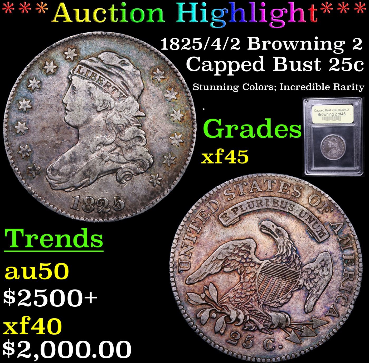 ***Auction Highlight*** 1825 /4/2 Browning 2 Capped Bust Quarter 25c Graded xf+ BY USCG. Dusky pewter and pearl gray patina adorns both sides of this overall sharply defined type candidate from the challenging Capped Bust quarter series. Warmer rose, apricot and lilac-blue undertones can also be seen under a light. A Corey's Pick, Bid to Win, Don't let it get Away Coin