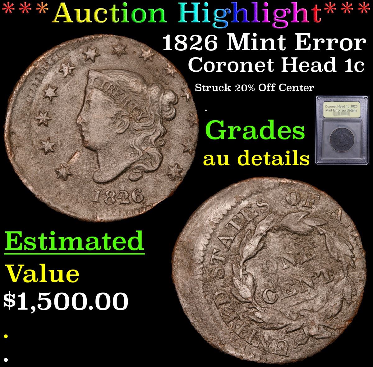 ***Auction Highlight*** 1826 Mint Error Coronet Head Large Cent 1c Graded AU Details By USCG (fc)