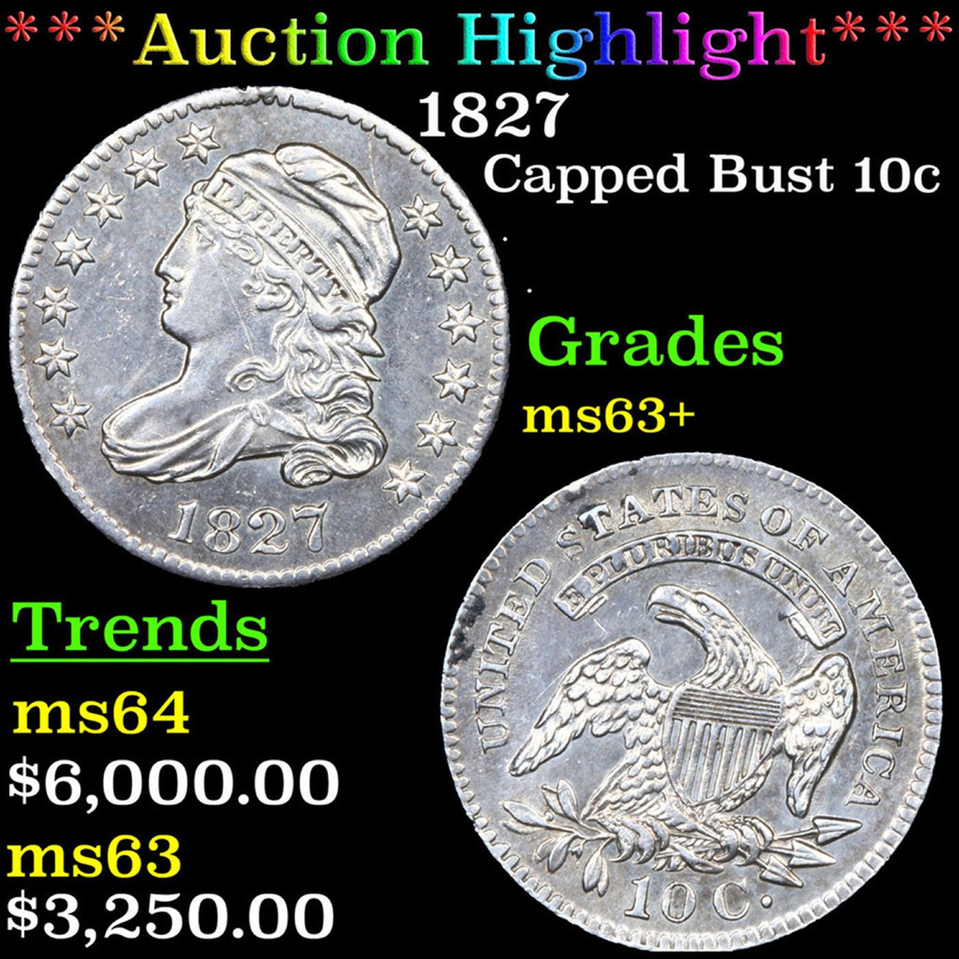 ***Auction Highlight*** 1827 Capped Bust Dime 10c Graded ms63+ BY SEGS. A Key Date's Pick, Bid to Win, Don't let it get Away Coin