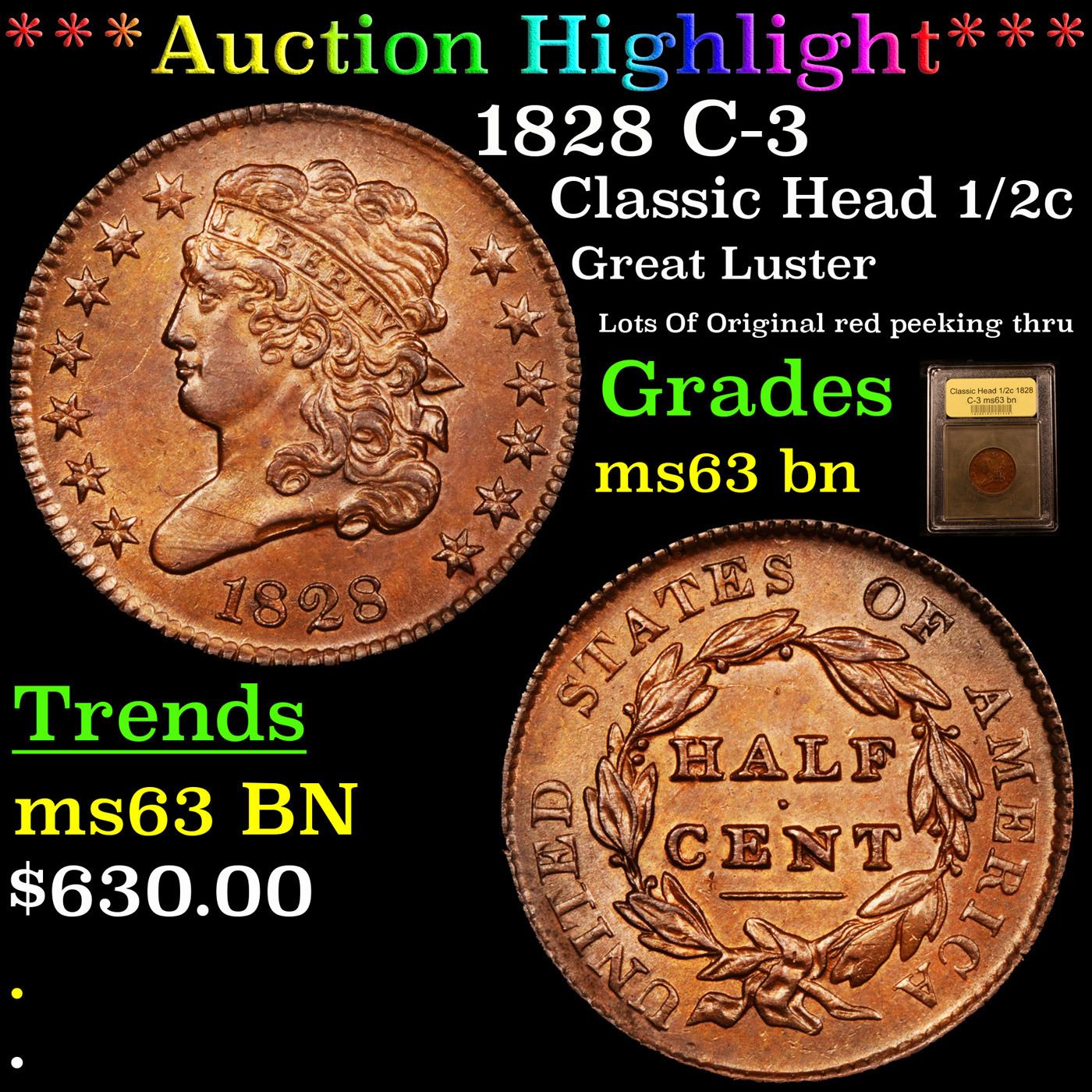 ***Auction Highlight*** 1828 C-3 Classic Head half cent 1/2c Graded Select Unc BN By USCG (fc)