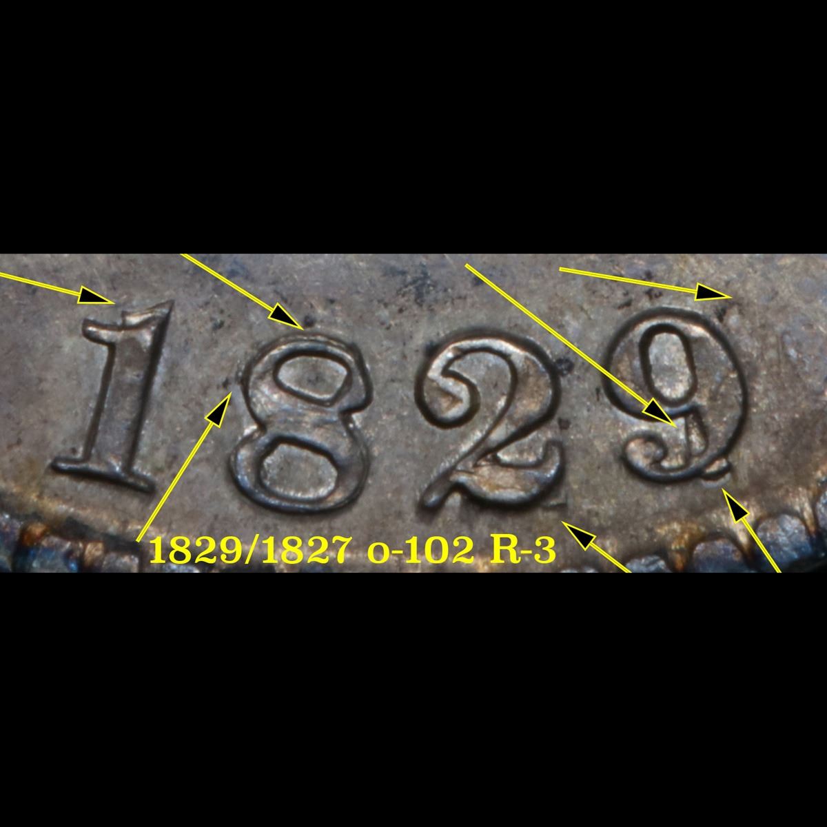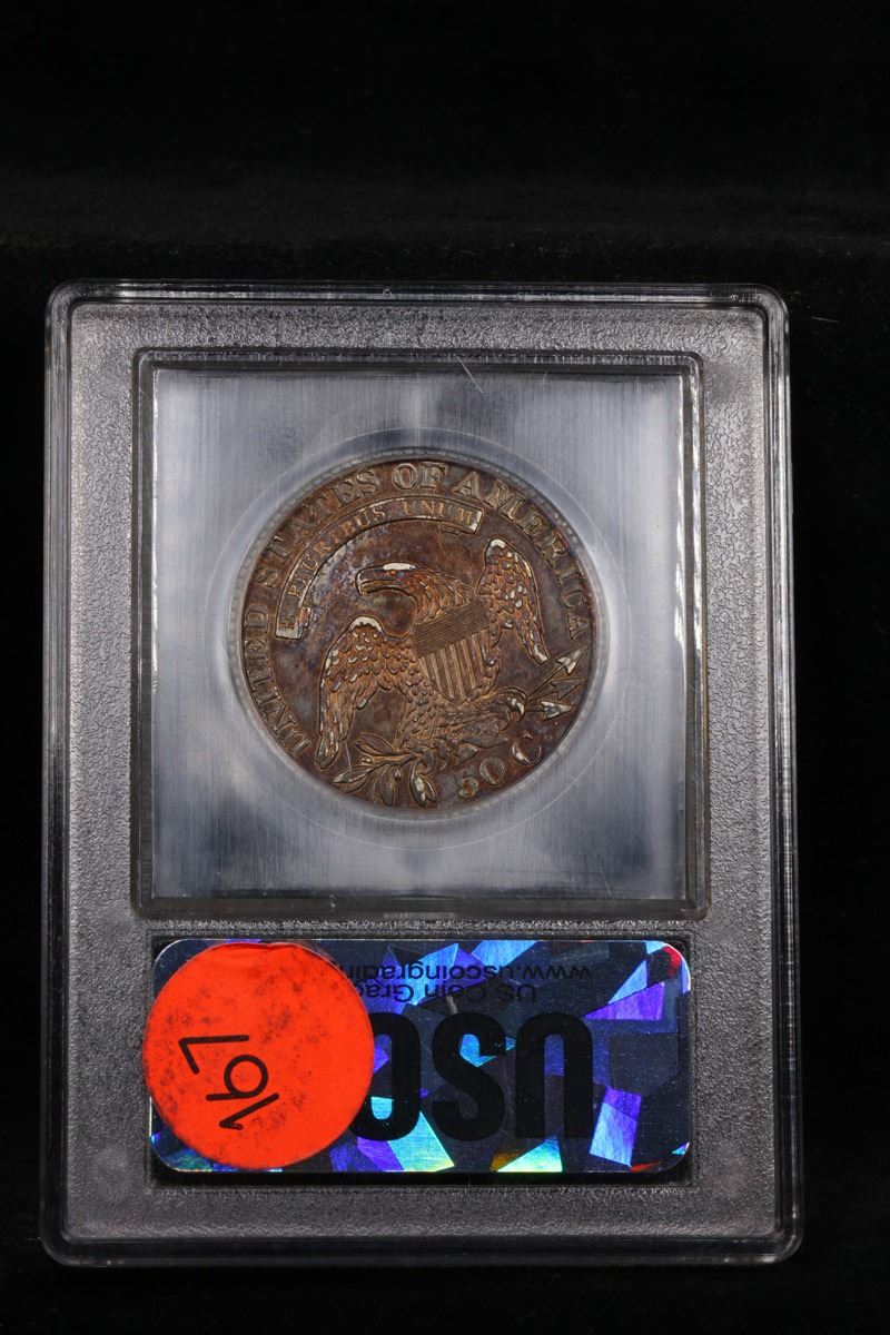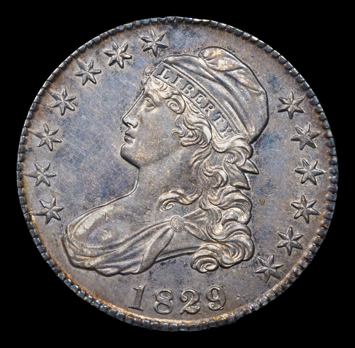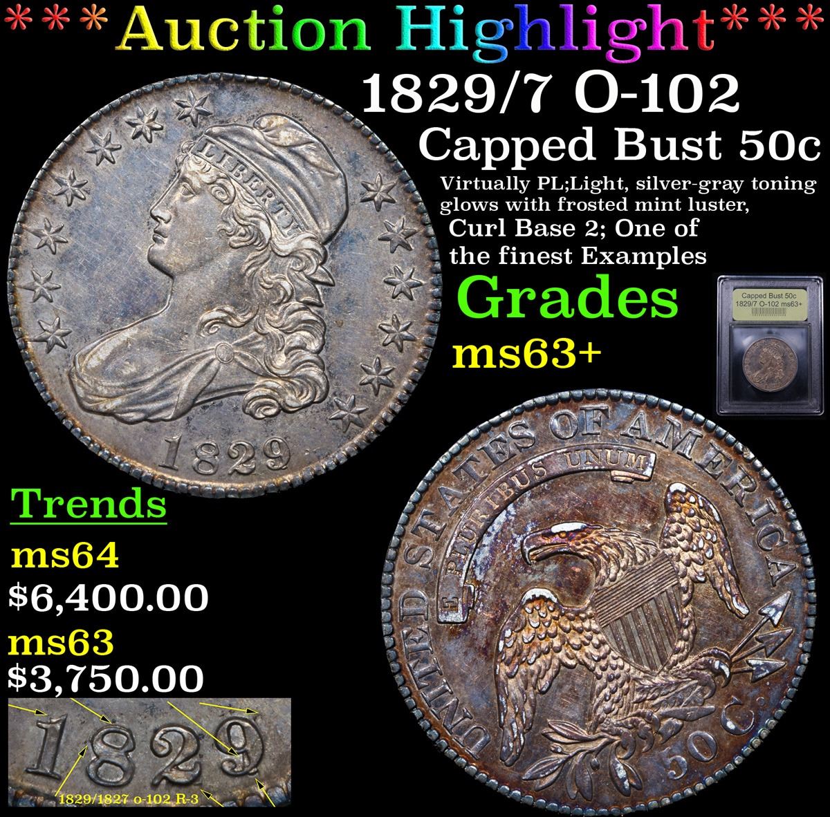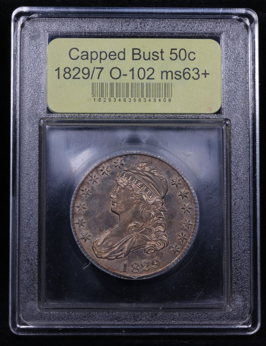 ***Auction Highlight*** 1829/7 O-102 Capped Bust Half Dollar 50c Graded Select+ Unc By USCG. Up for Auction is a Virtually Proof Like 1829/7 Capped Bust Half Dollar o-102 Graded ms63+. The entire date is repunched, with obvious repunching on 1 and 8, while the Curl Base 2 is punched over a previous 2 (possibly Square Base), and the 9 shows clear remnants of an under digit 7 -- both at the base and with "ears" showing above the loop of 9. The reverse die confirms Overton-102, with a small 5 that has a "stair step" defect on the underside of the flag. This is one of the finest-known examples of an important, late-series overdate. Among the scarcer O-102 variety, it is the third finest known of the 0-102 variety and in the top group of all 1829/7 bust halves. Light, silver-gray toning glows with frosted mint luster, accented by pale rose-gold, blue, and subtle iridescent shades. Sharply struck, the exceptionally reflective surfaces are essentially proof Like and a wonder to behold. I wish you good Luck in obtaining this terrific Proof Like coin. A Corey's Pick, Bid to Win, Don't let it get Away, you might not find its equal Coin. I give this coin my highest recommendation