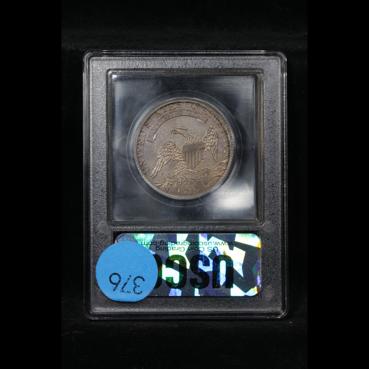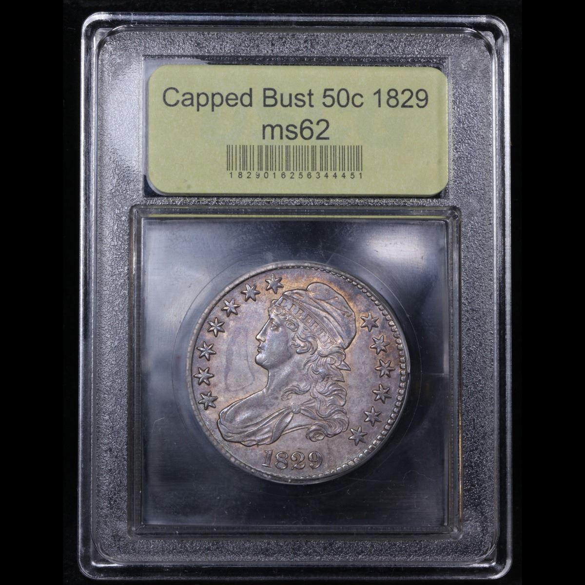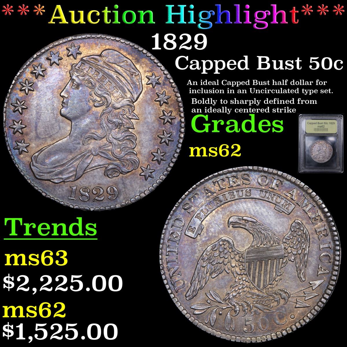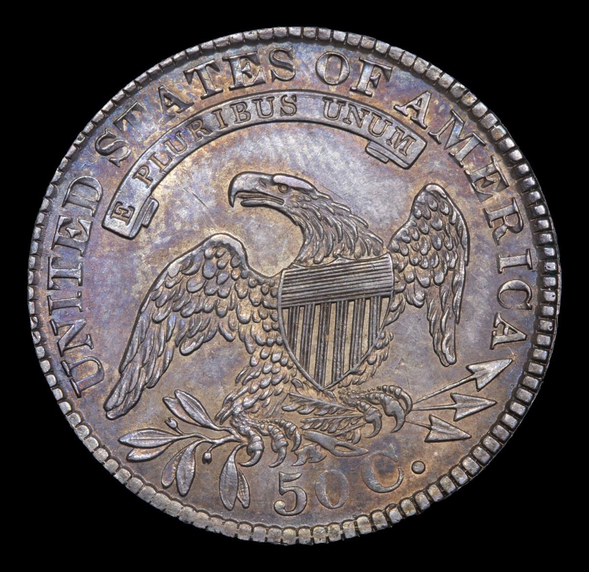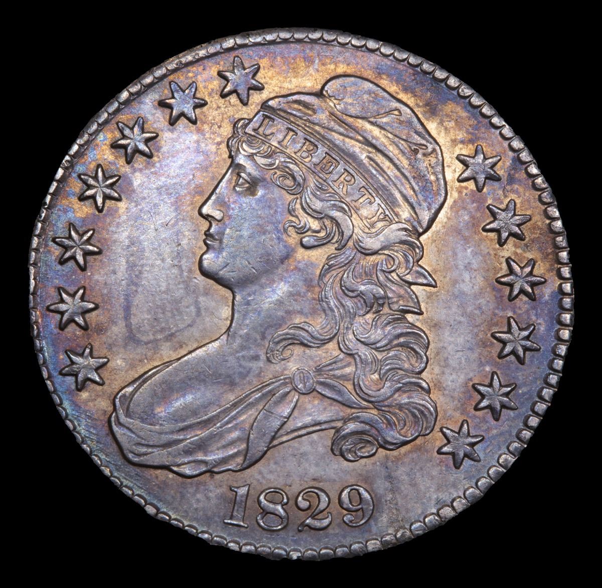 ***Auction Highlight*** 1829 Capped Bust Half Dollar 50c Graded Select Unc By USCG. A wholly original example, both sides are splashed with rich blue gray patina, with many areas around the peripheral devices exhibiting lighter antique gold iridescence. Boldly to sharply defined from an ideally centered strike, this lustrous and predominantly smooth example is temptingly close to a Choice Mint State grade. An ideal Capped Bust half dollar for inclusion in an Uncirculated type set. A Corey's Pick, Bid to Win, Don't let it get Away, you might not find its equal Coin