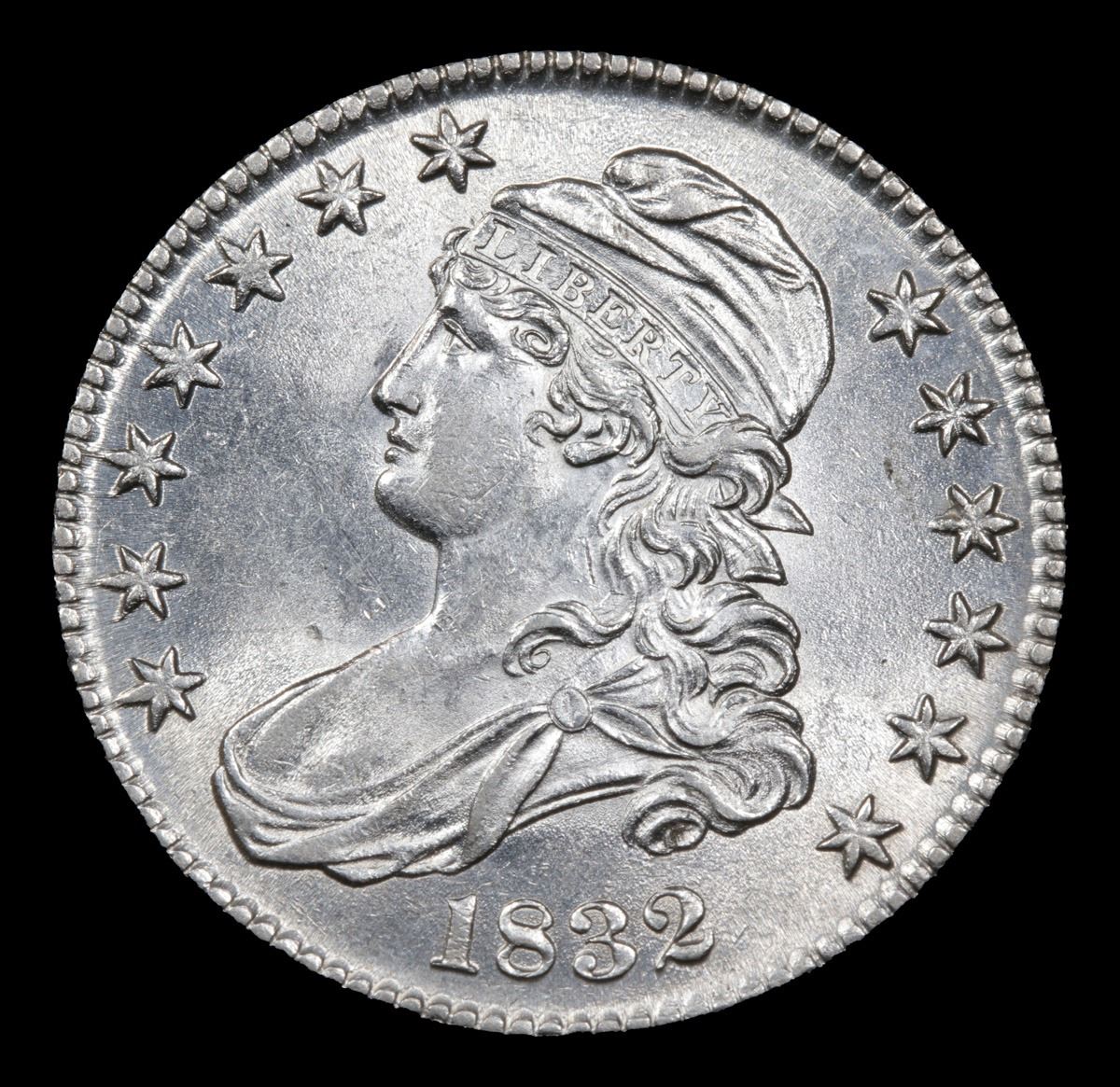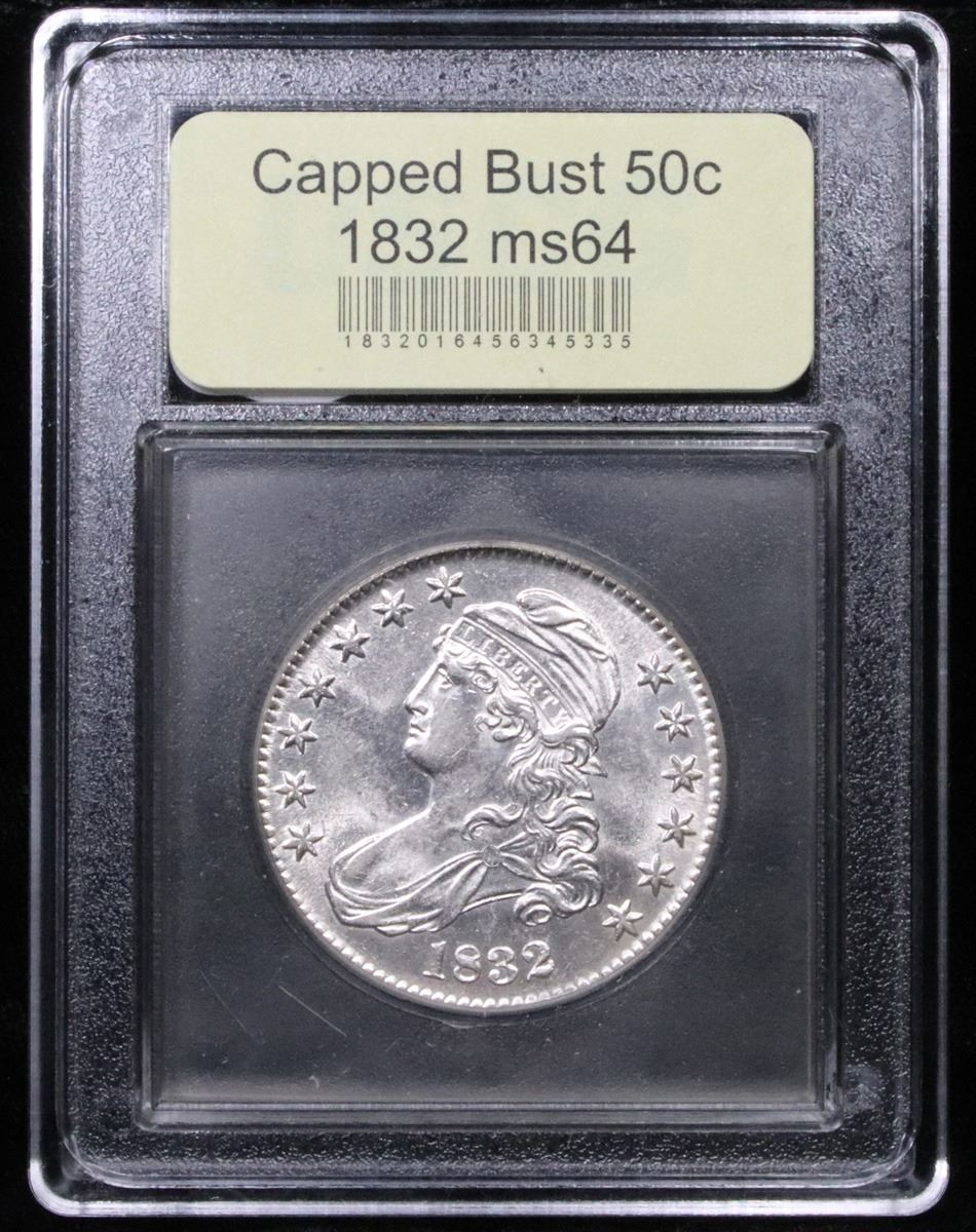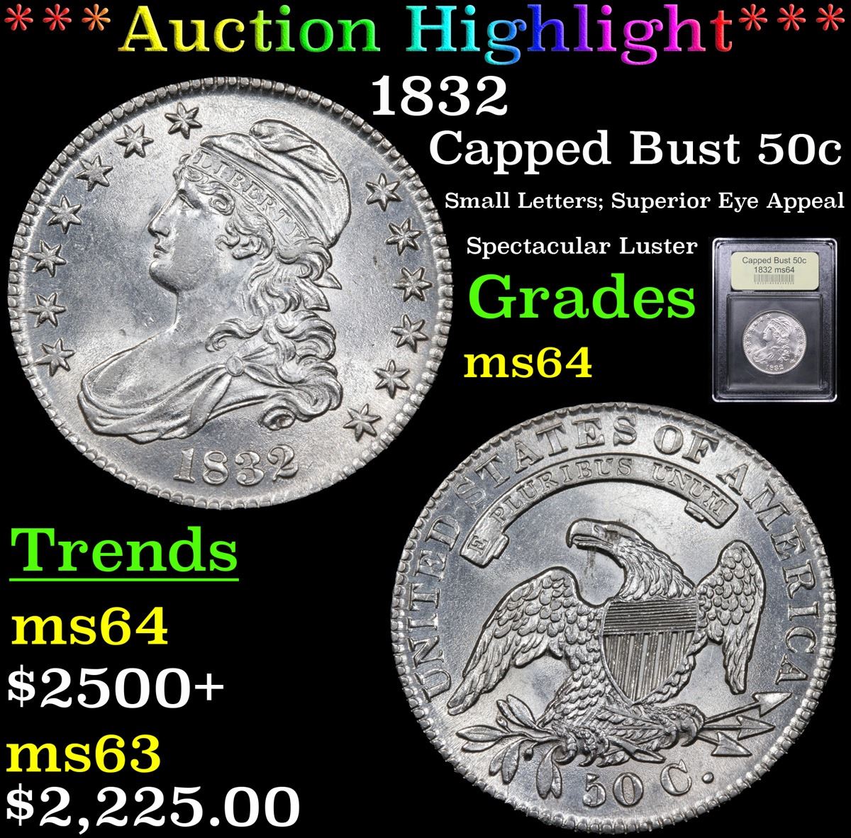 ***Auction Highlight*** 1832 Small Letters; Superior Eye Appeal Spectacular Luster Capped Bust Half Dollar 50c Graded Choice Unc By USCG. One of the Most Lustrous and stunning Capped Busts we have ever brought to auction of any date. Superior eye appeal, spectacular luster, strong strike. Looks Gem. A Corey's Pick, Bid to Win, Don't let it get Away, you might not find its equal Coin. I give this coin my highest recommendation