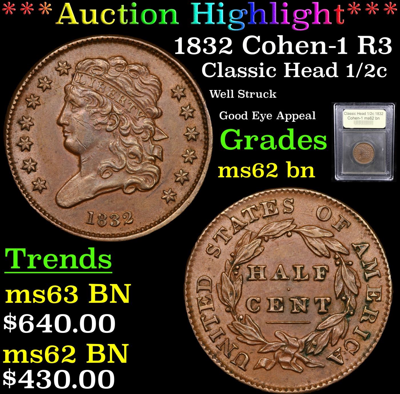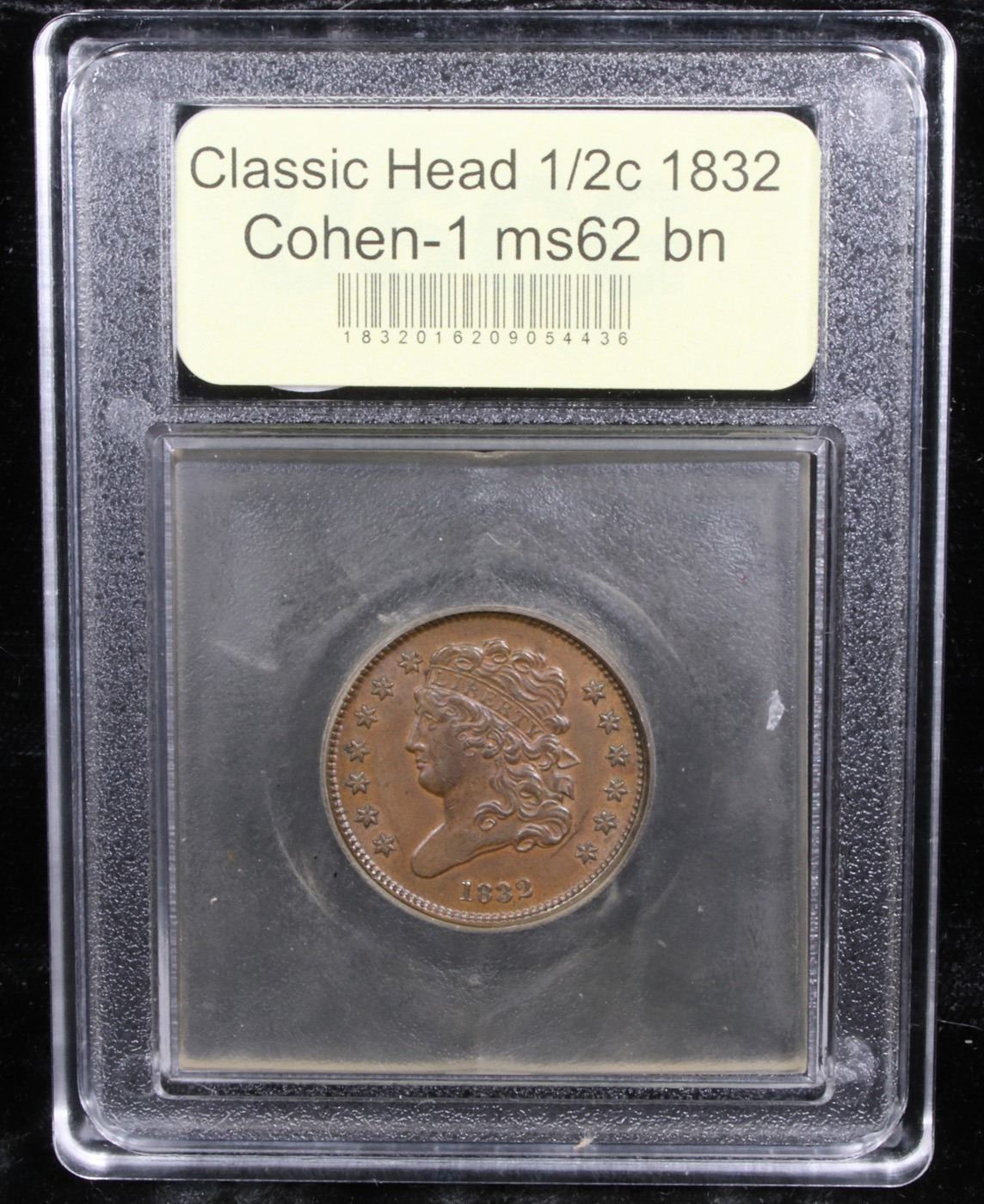 ***Auction Highlight*** 1832 Cohen-1 R3 Classic Head half cent 1/2c Graded Select Unc BN By USCG (fc
