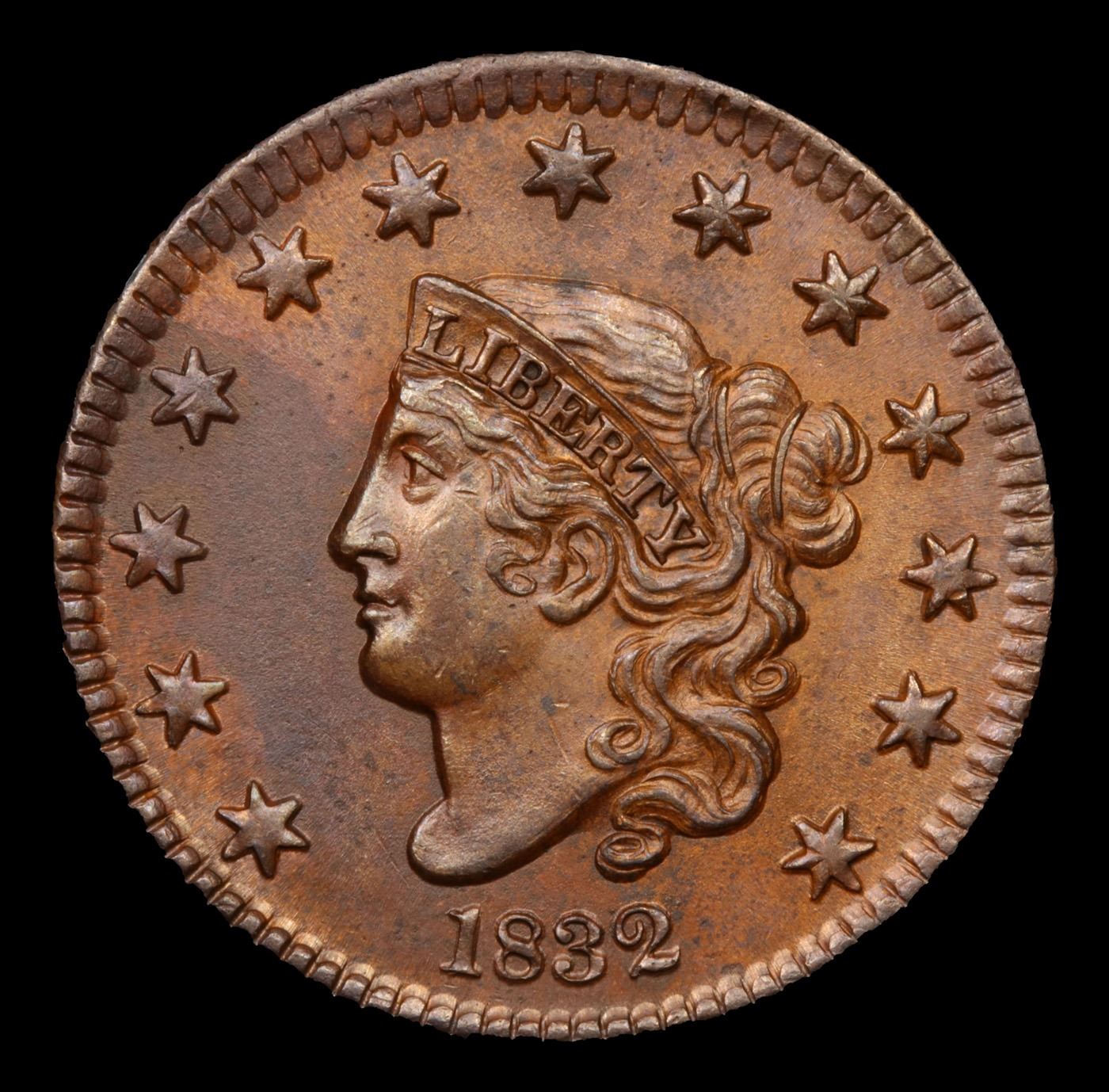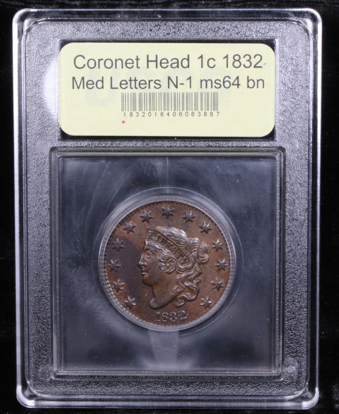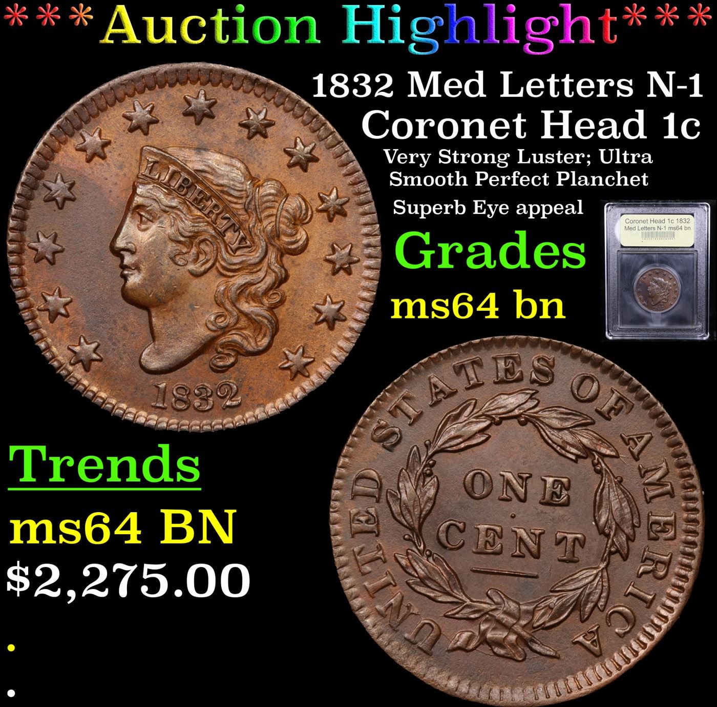 ***Auction Highlight*** 1832 Med Letters N-1 Coronet Head Large Cent 1c Graded Choice Unc BN BY USCG. This beautiful 1832 cent variety is frequently seen with subdued luster, but the coin at hand has vibrant full cartwheel luster. The surface of this piece is impeccable and incredibly smooth with attractive medium to dark brown color. A Corey's Pick, Bid to Win, Don't let it get Away Coin