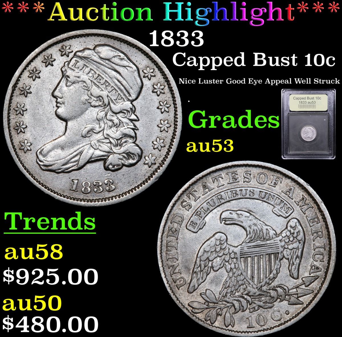 ***Auction Highlight*** 1833 Nice Luster Good Eye Appeal Well Struck . Capped Bust Dime 10c Graded Select AU By USCG. A Corey's Pick, Bid to Win Coin