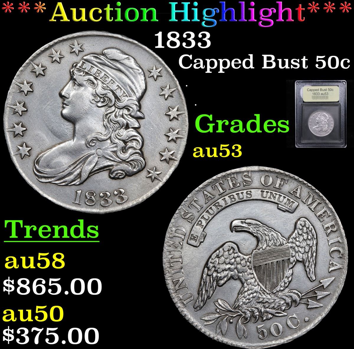 ***Auction Highlight*** 1833 . . Capped Bust Half Dollar 50c Graded Select AU By USCG. A Corey's Pick, Bid to Win Coin