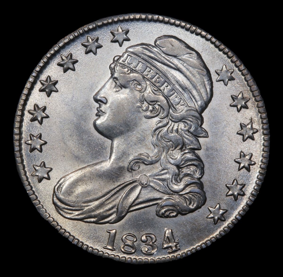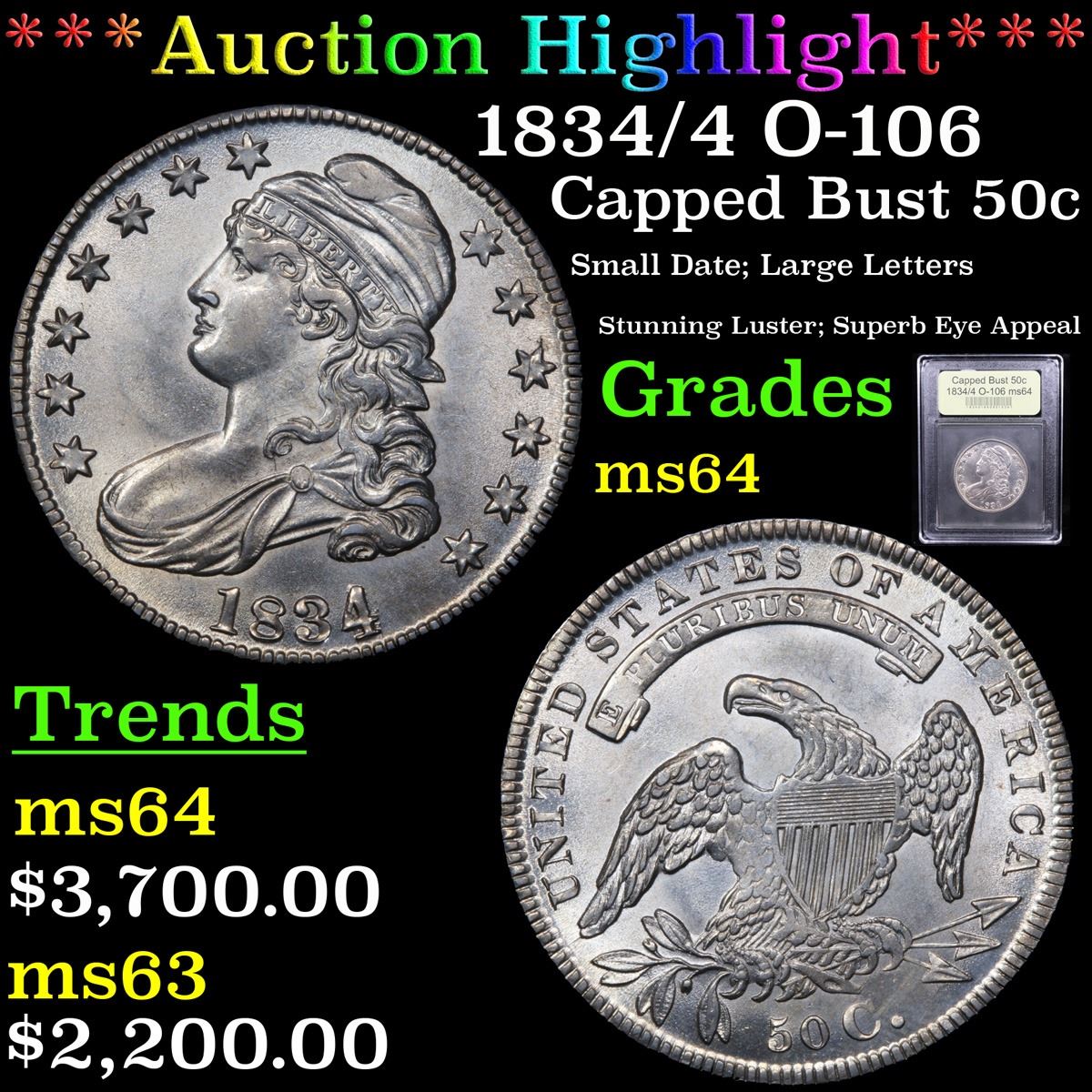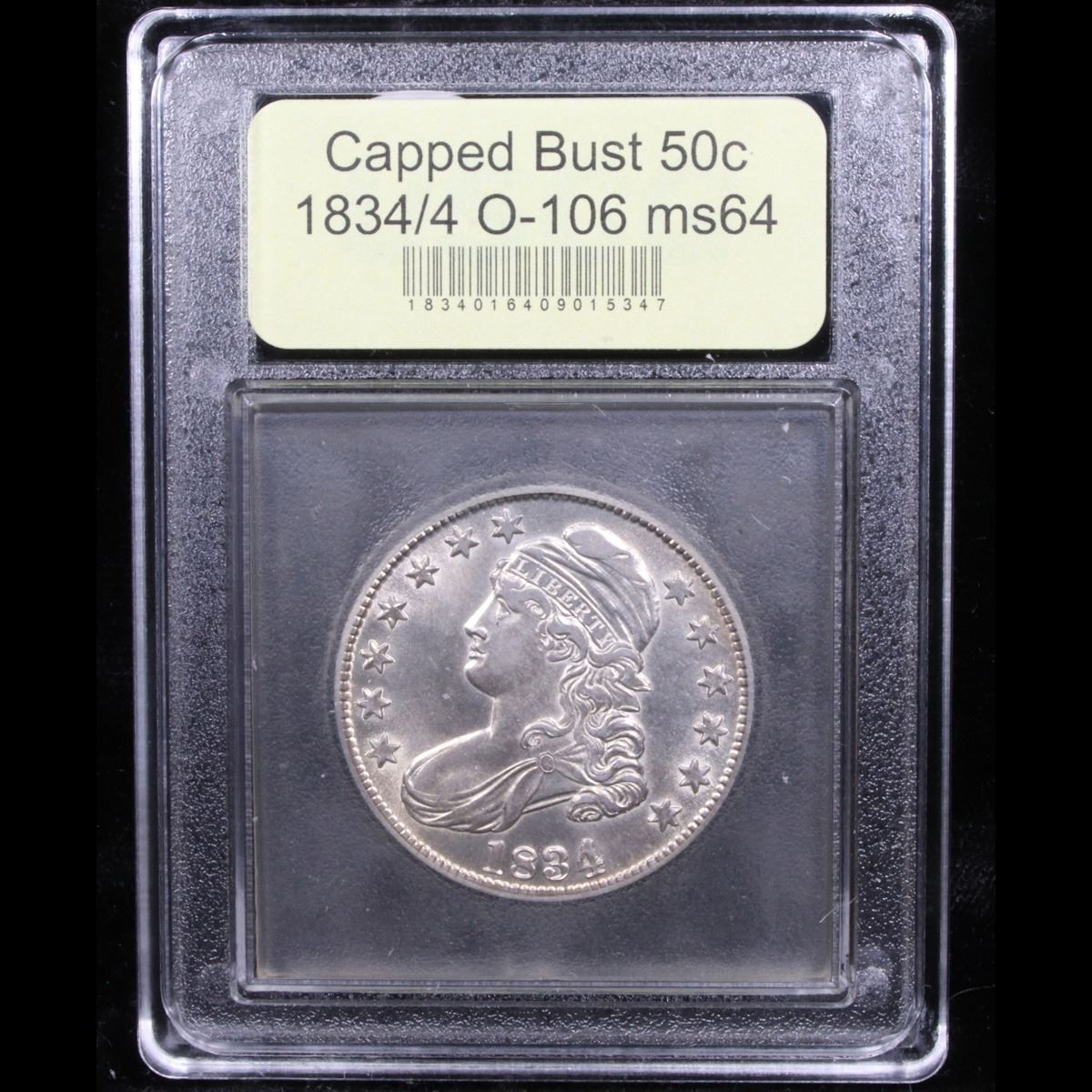 ***Auction Highlight*** 1834 /4 O-106 Capped Bust Half Dollar 50c Graded Choice Unc By USCG. Diagnostic markers for the available O-106 variety include the Large 4 cut over a Small 4, and the curved left leg of the M in AMERICA over a straight M. Definition is bold on the central elements of the Obverse with some striking weakness on the reverse.. Mint luster is radiant over each brilliant side. A Corey's Pick, Bid to Win, Don't let it get Away Coin