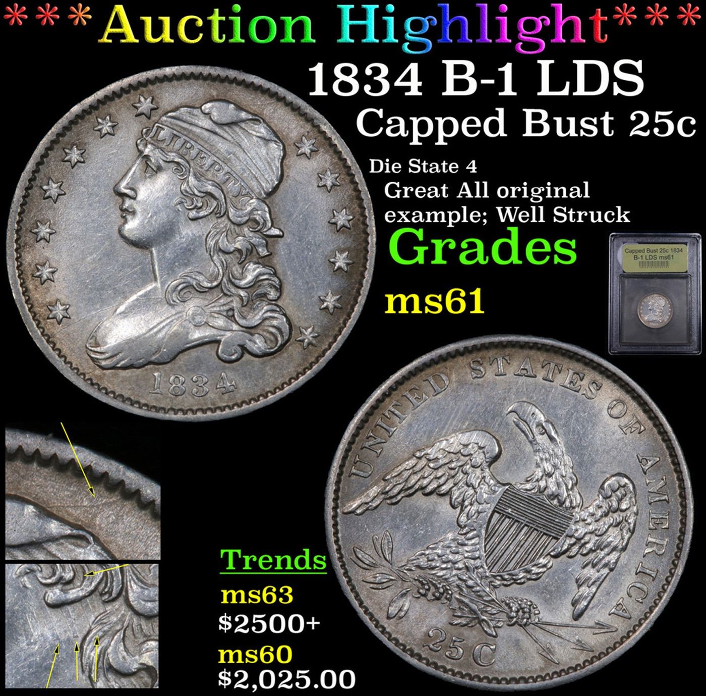***Auction Highlight*** 1834 B-1 LDS Capped Bust Quarter 25c Graded BU+ By USCG. A Corey's Pick, Bid to Win Coin