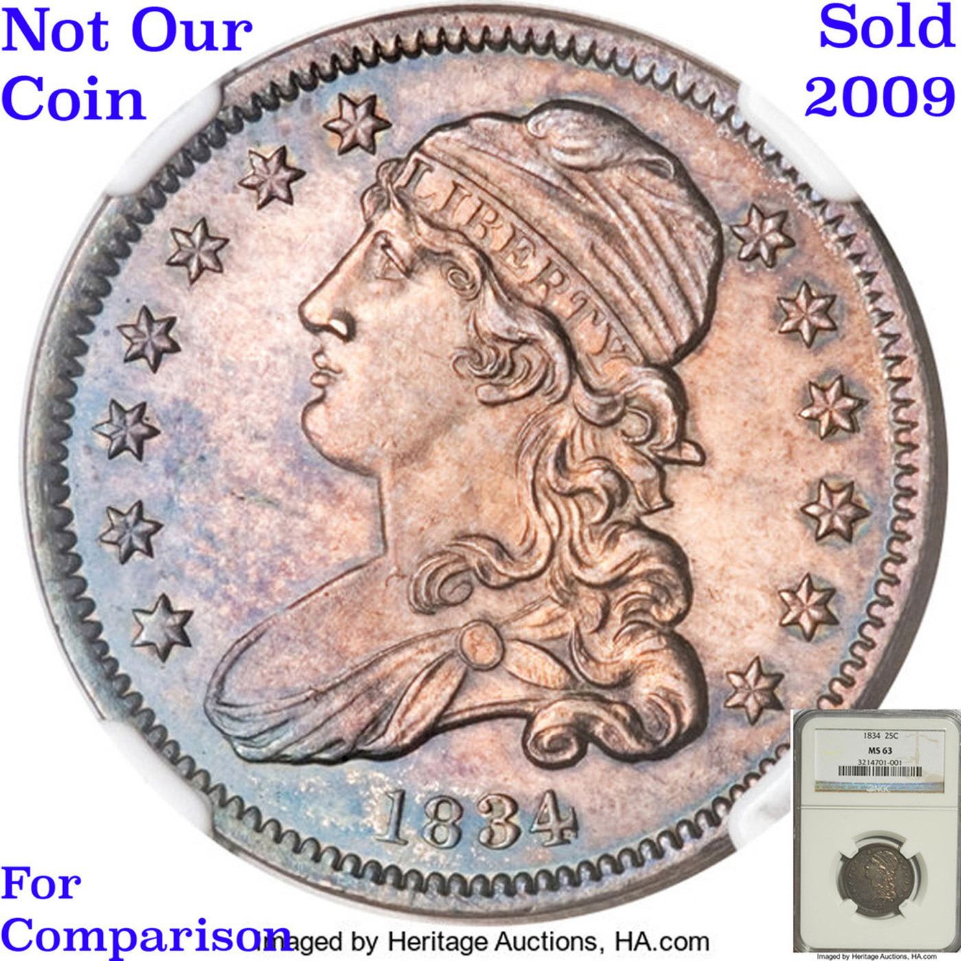 ***Auction Highlight*** 1834 B-4 Capped Bust Quarter 25c Graded Select Unc By USCG. Star 10 is repunched and the reverse shows an extensive network of die cracks, identifying the popular B-4 die variety. This attractive Select specimen is sharply detailed in most areas, with just a touch of softness on some star centers. The lightly marked proof like surfaces show a stunning blue, steel grey and light russet toning. I have included two other ms63 examples. You will note the same right wing tip weakness. A Corey's Pick, Bid to Win, Don't let it get Away, you might not find its equal Coin