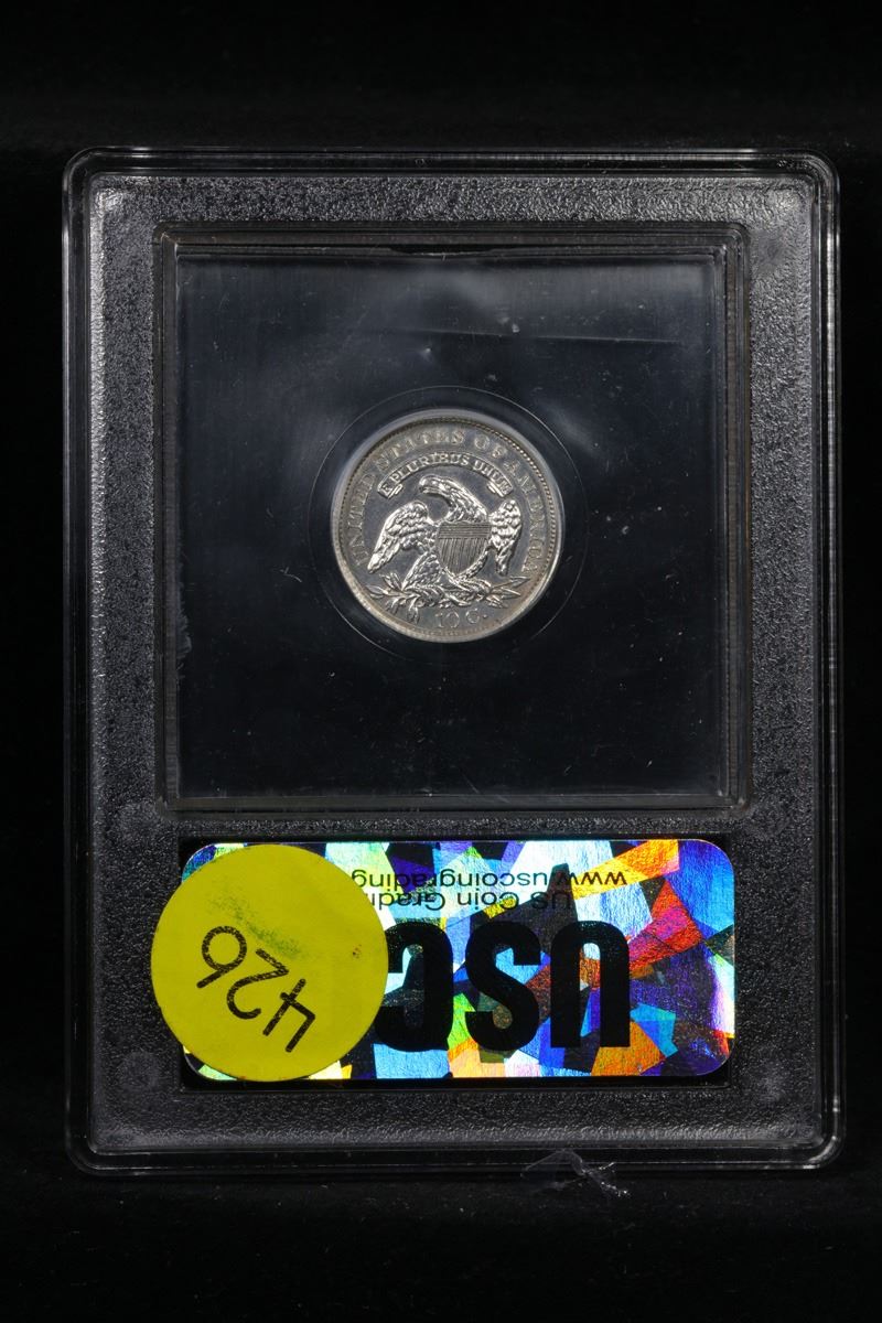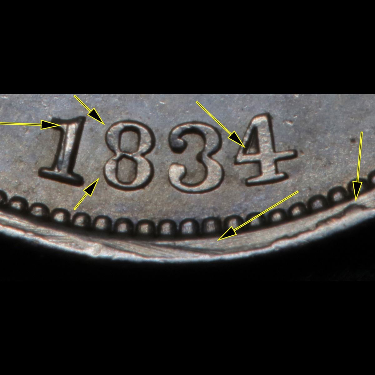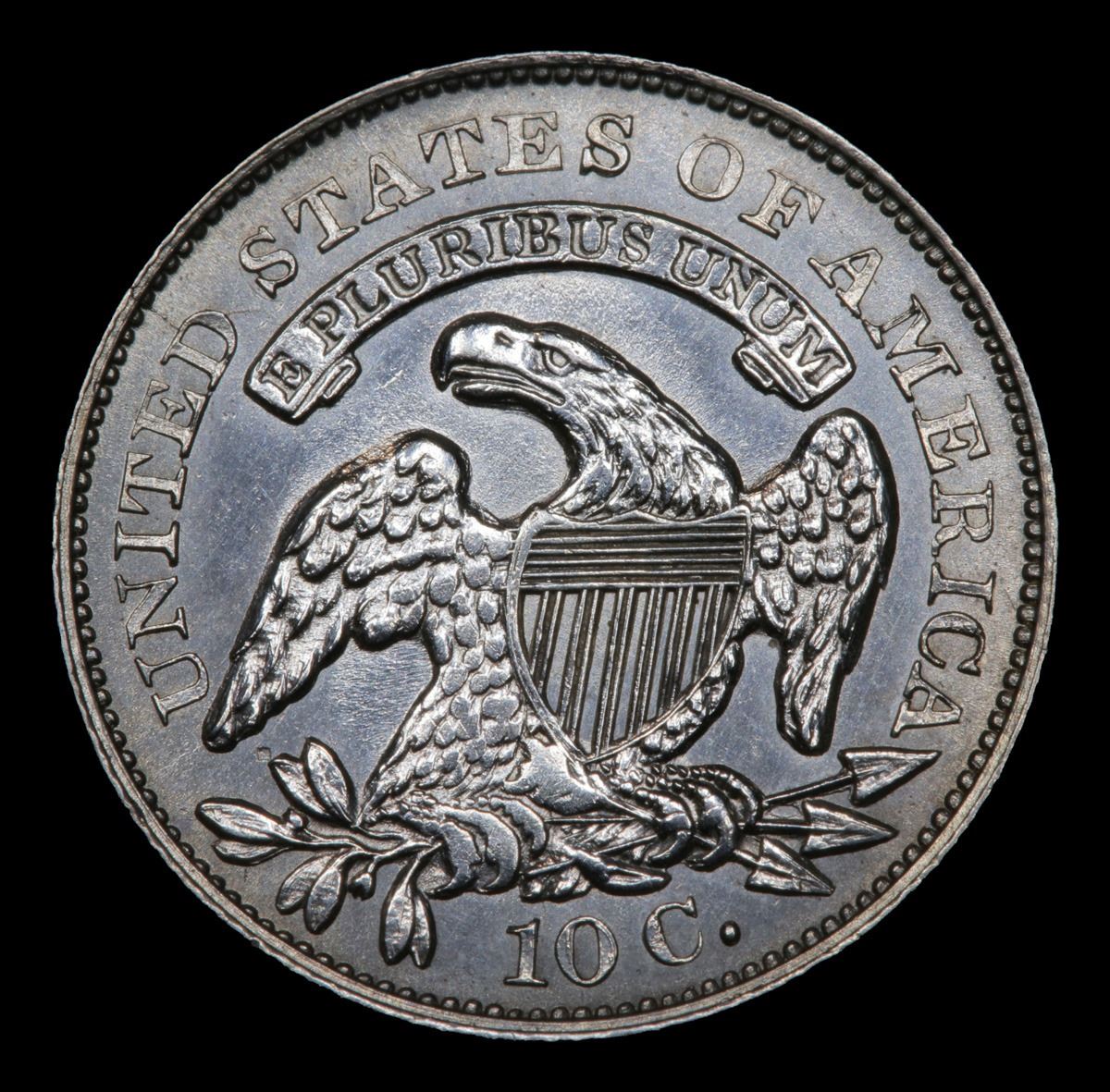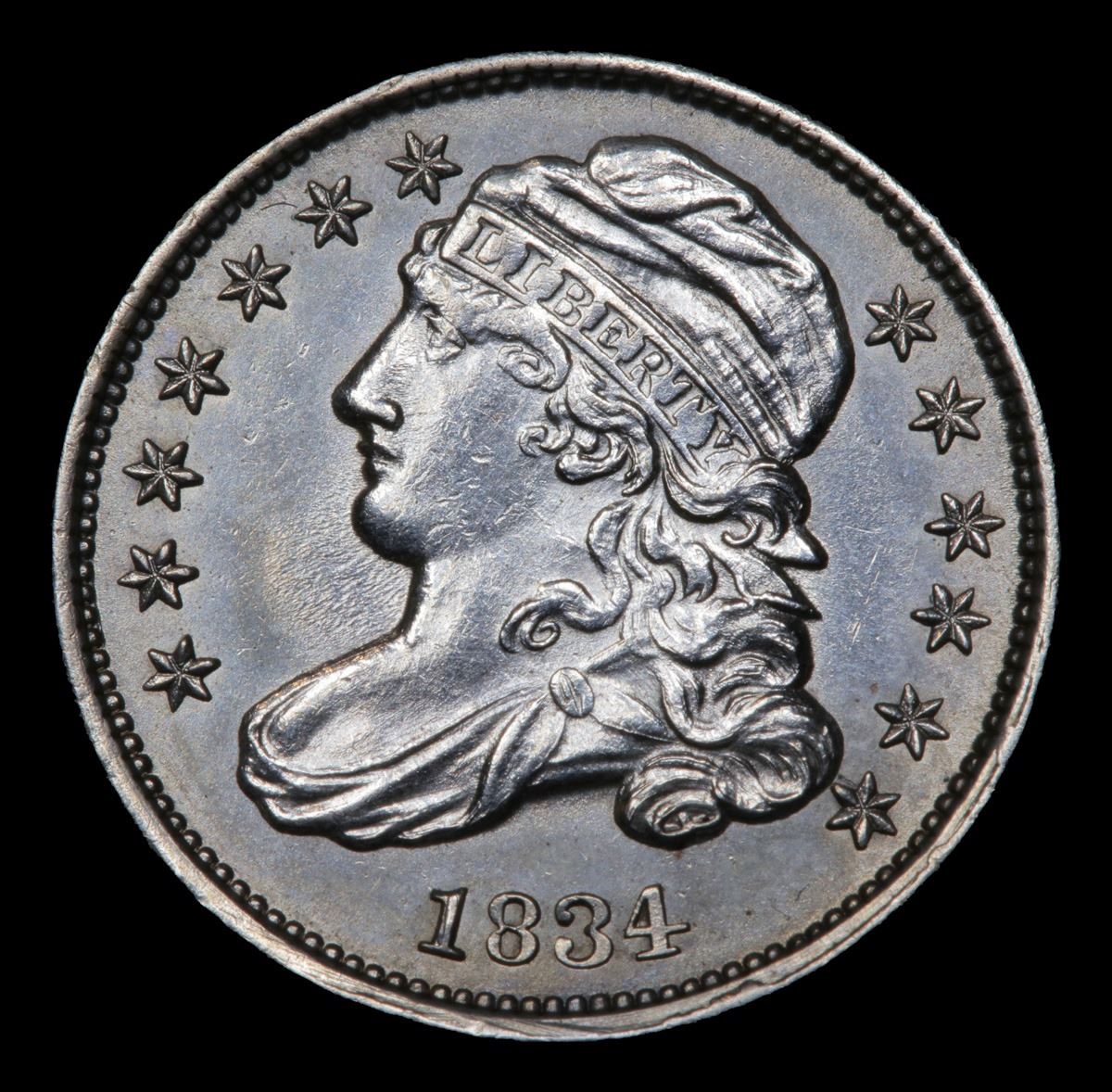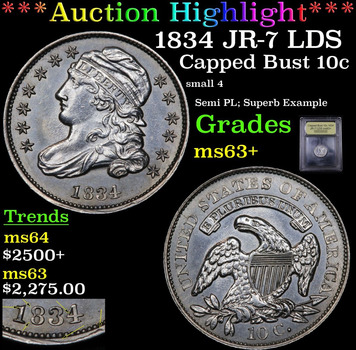 ***Auction Highlight*** 1834 JR-7 LDS Capped Bust Dime 10c Graded Select+ Unc By USCG. Up for Auction is the 1834, Small 4, Capped Bust Dime, JR-7. The JR7 is the only die variety known for the Small 4. Although, only one die variety is known, there are several known die states of the JR7, this is the late die state with the lapped and broad rim, the recut 4 in the date and the die chip on the 1, additionally, although not noted in any reference guide, I do believe the 8 is punched upside down, as the lower circle is smaller than the upper. Very interesting die state. The coin at hand is semi PL with reflective fields. Superb example. A Corey's Pick, Bid to Win, Don't let it get Away, you might not find its equal Coin