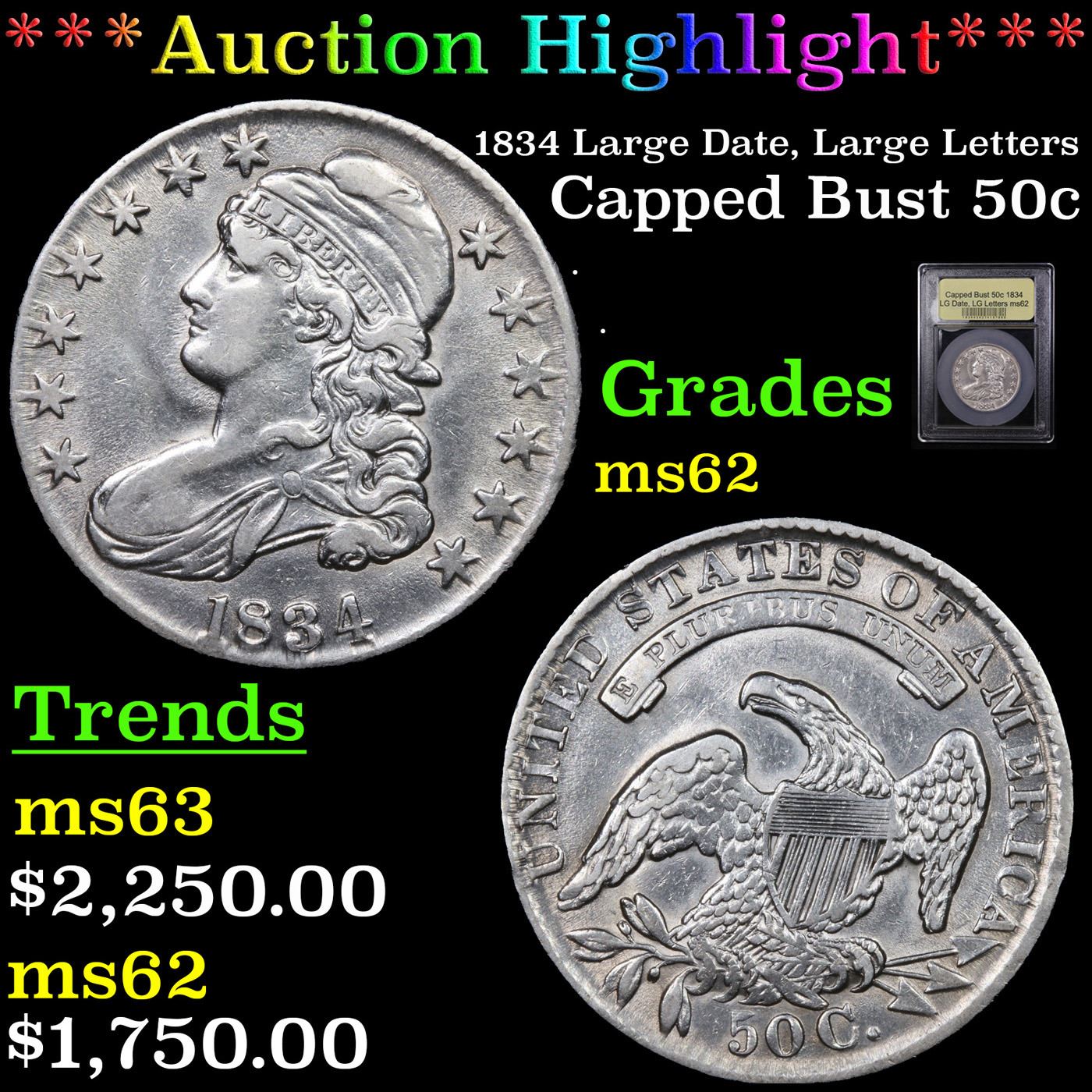 ***Auction Highlight*** 1834 Large Date, Large Letters Capped Bust Half Dollar 50c Graded Select Unc