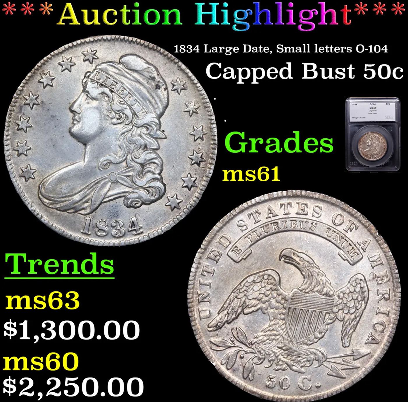 ***Auction Highlight*** 1834 Large Date, Small letters Capped Bust Half Dollar O-104 50c Graded ms61
