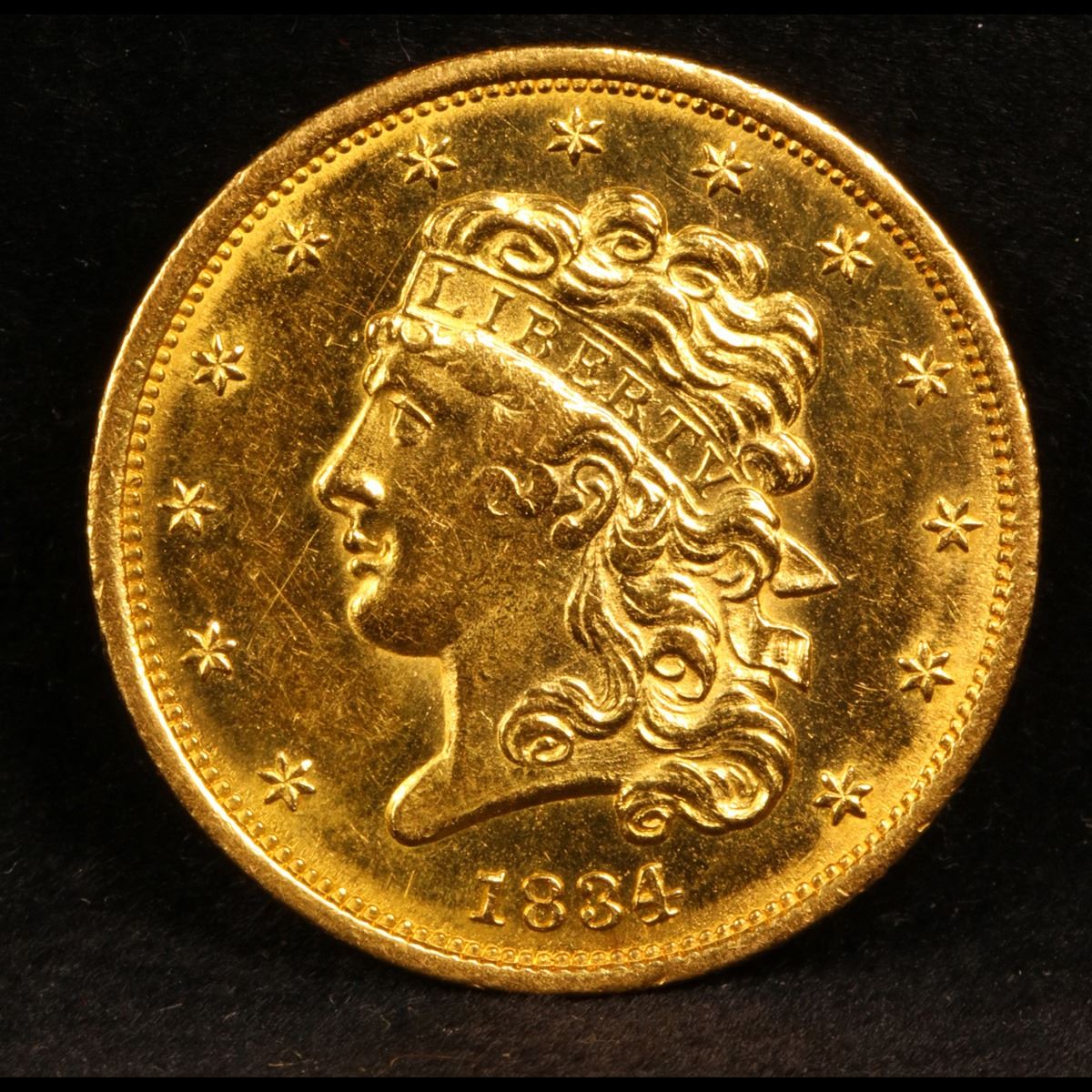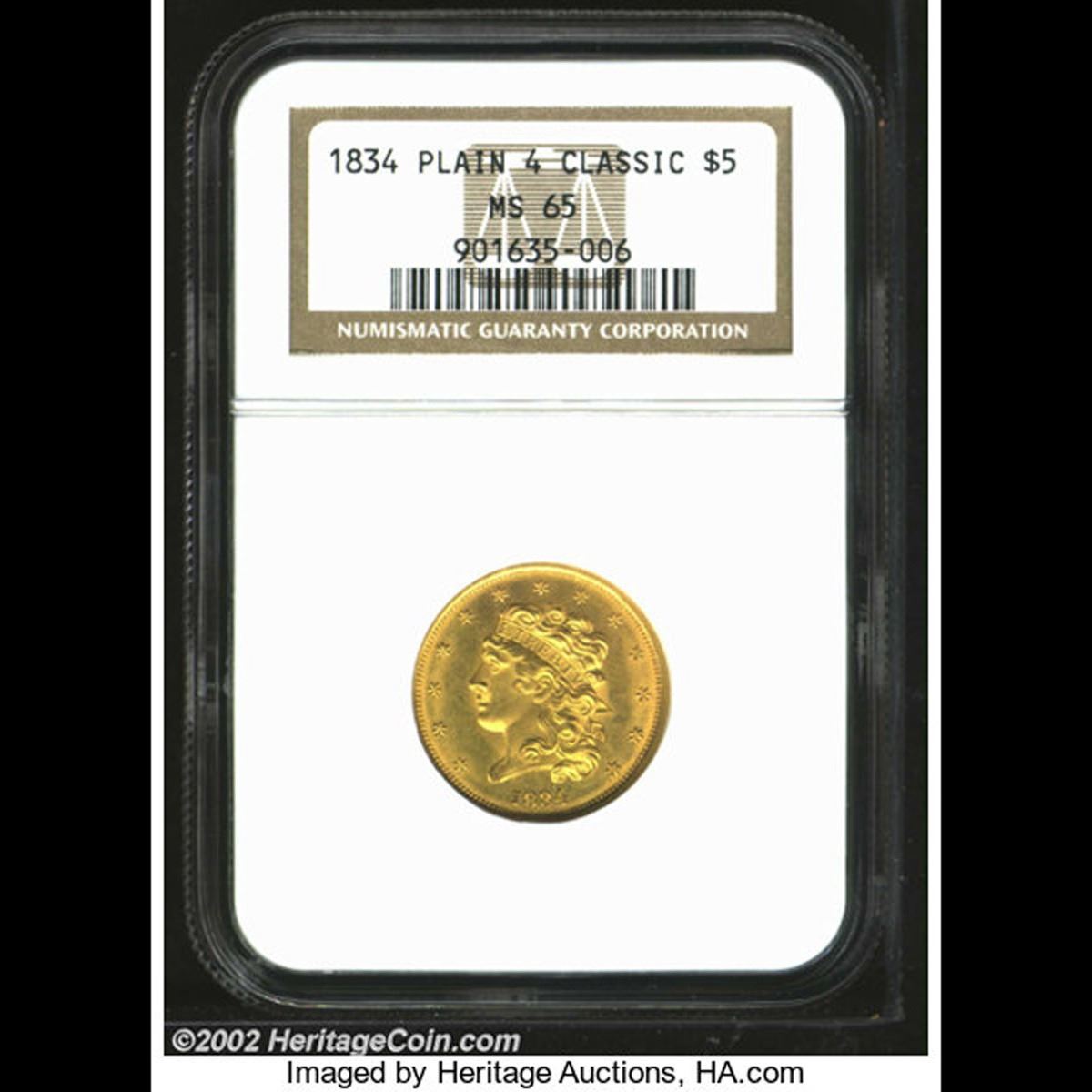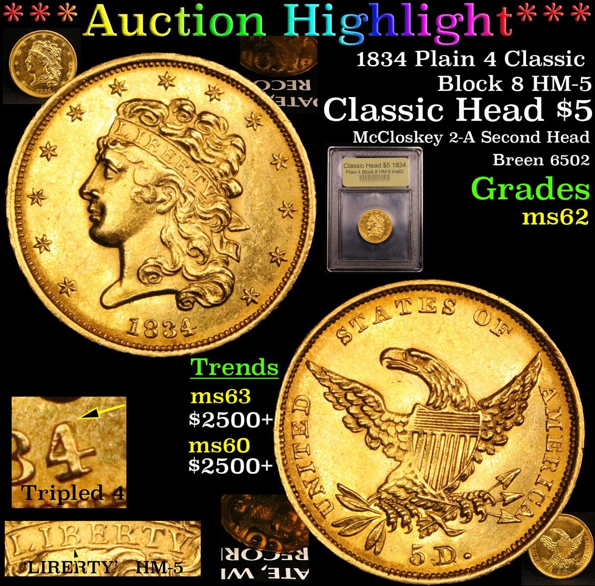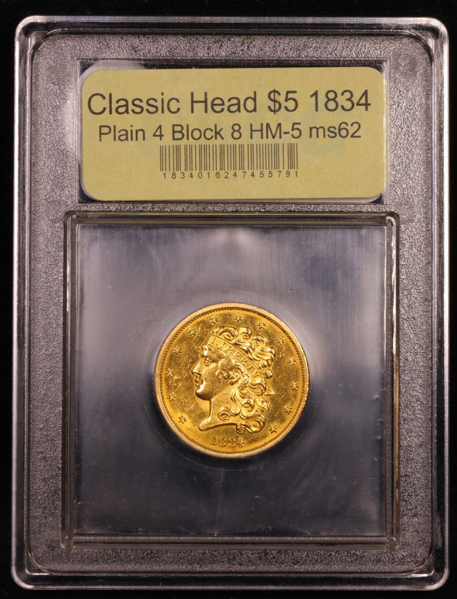 ***Auction Highlight*** 1834 Plain 4 Classic Block 8 HM-5 Classic Head Gold 5 Graded Select Unc BY USCG.
