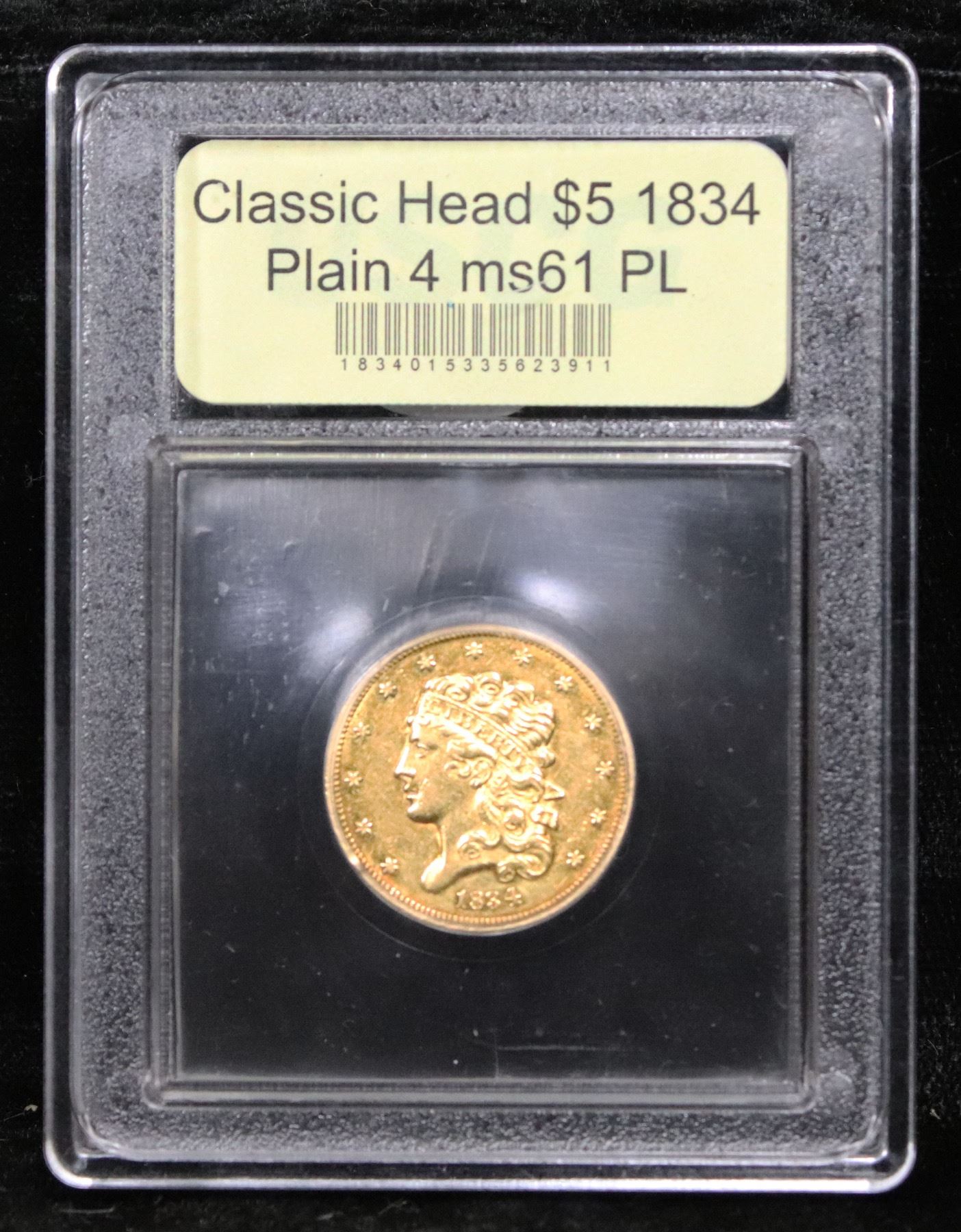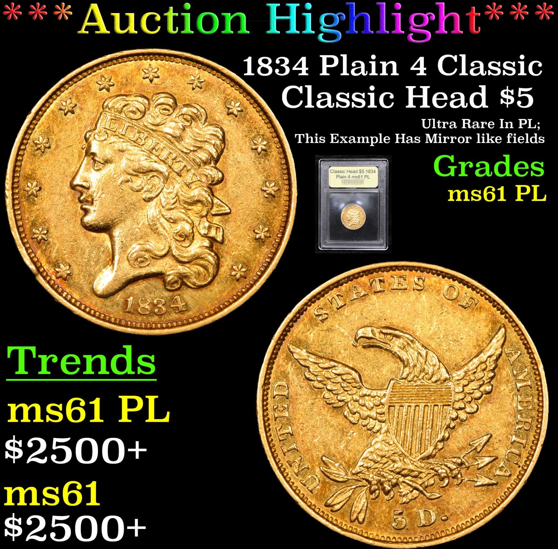 ***Auction Highlight*** 1834 Plain 4 Classic Ultra Rare In PL; This Example Has Mirror like fields . Classic Head 5 Graded Unc+ PL By USCG. NGC Has Graded 7 PL. PCGS Has Graded None A Corey's Pick, Bid to Win, Don't let it get Away Coin
