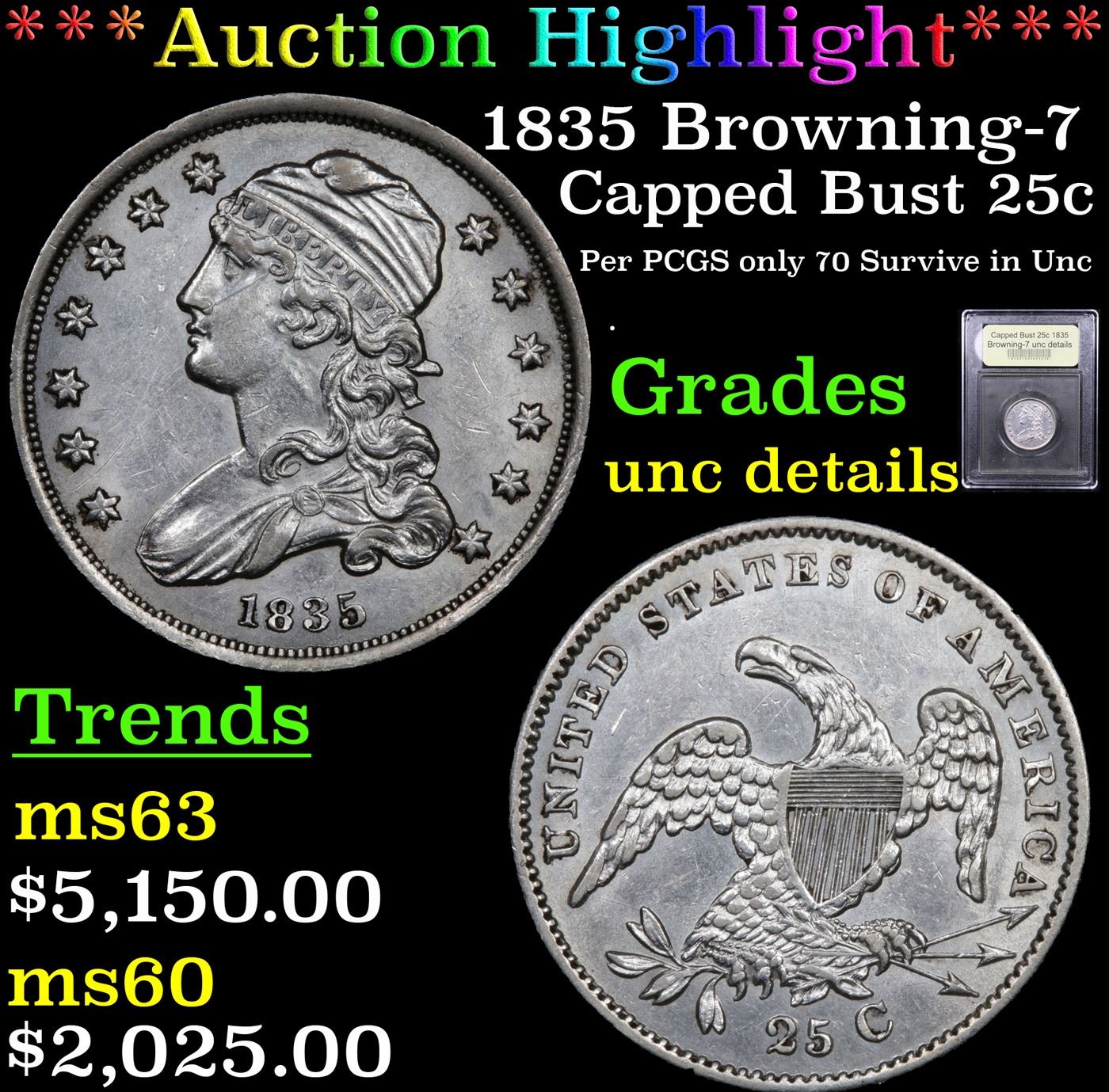 ***Auction Highlight*** 1835 Browning-7 Capped Bust Quarter 25c Graded Unc Details By USCG. A lightly toned steel-gray example with a bold to sharp strike throughout. Satiny luster is suitably vibrant and, given the only reason to details being one stray mark on the obverse, which is not distracting, the assigned grade seems somewhat conservative in my opinion. Ms62 seems more appropriate.