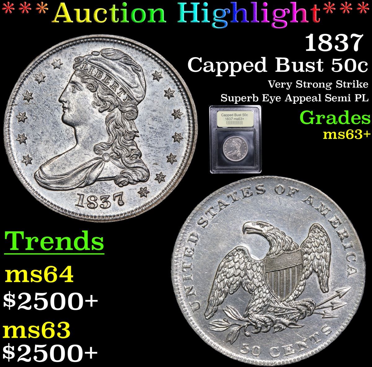 ***Auction Highlight*** 1835 Very Strong Strike Superb Eye Appeal Semi PL Capped Bust Half Dollar 50c Graded Select+ Unc By USCG. A Corey's Pick, Bid to Win, Don't let it get Away, you might not find its equal Coin