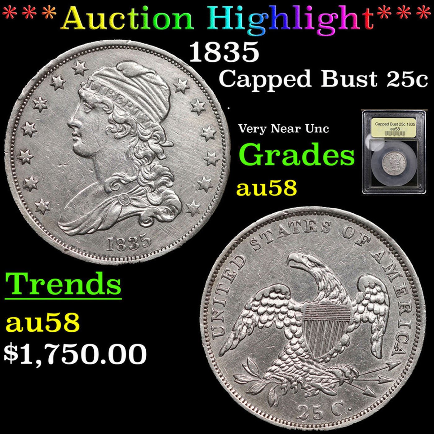 ***Auction Highlight*** 1835 Capped Bust Quarter 25c Graded Choice AU/BU Slider By USCG (fc)