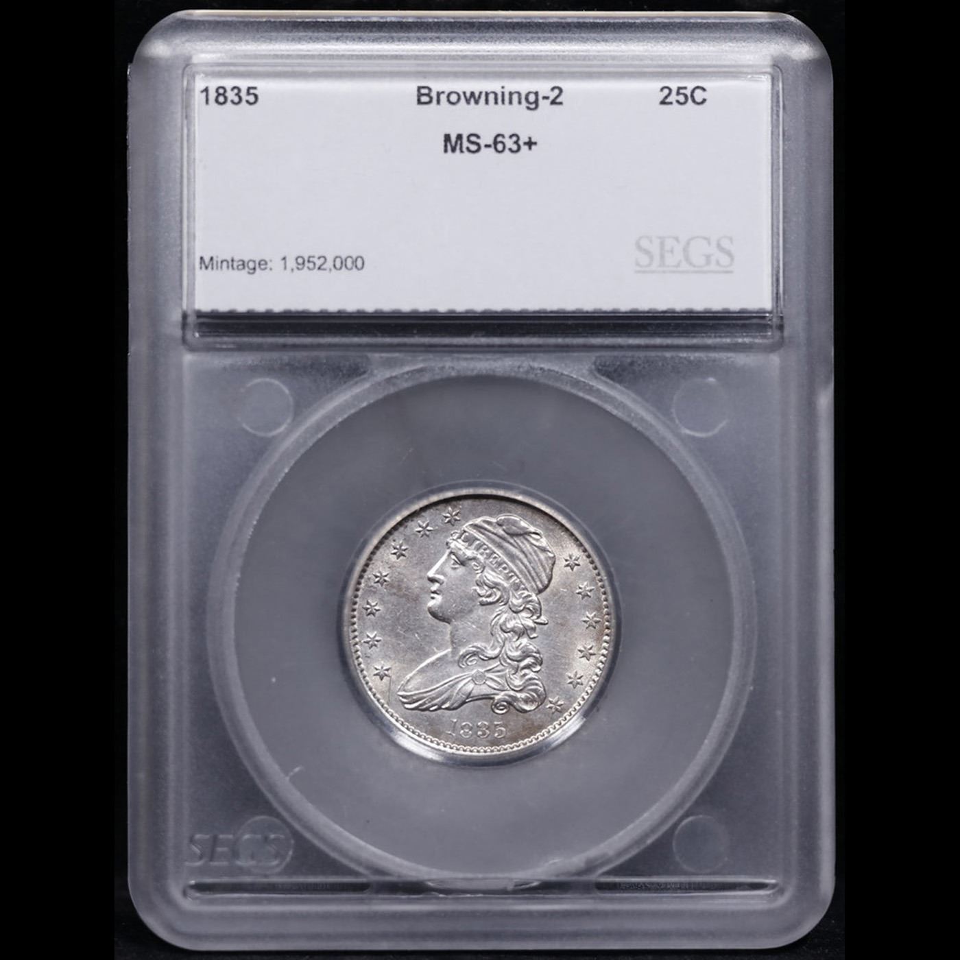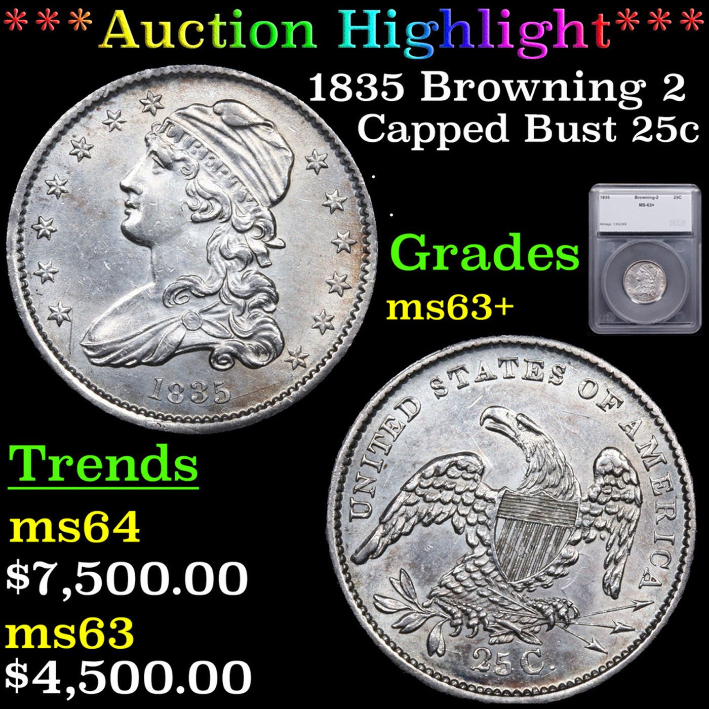 ***Auction Highlight*** 1835 Browning 2 Capped Bust Quarter 25c Graded ms63+ BY SEGS.