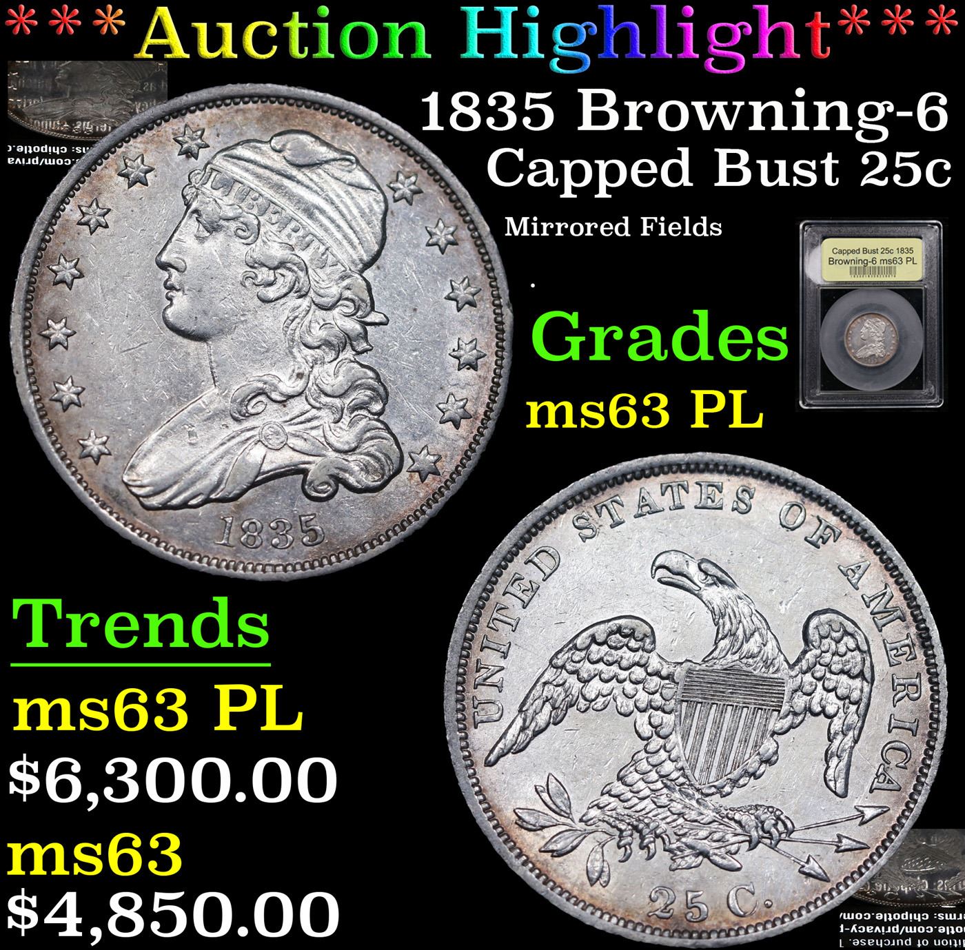***Auction Highlight*** 1835 Capped Bust Quarter Browning-6 25c Graded Select Unc PL BY USCG (fc)