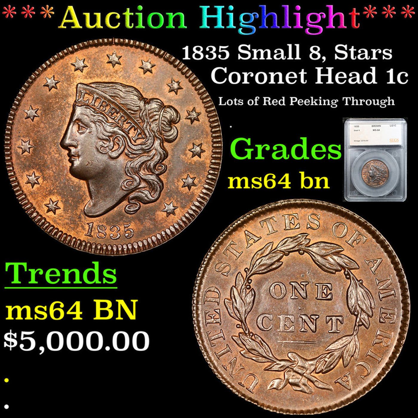 ***Auction Highlight*** 1835 Small 8, Stars Coronet Head Large Cent 1c Graded ms64 bn By SEGS. A Corey's Pick, Bid to Win, Don't let it get Away Coin