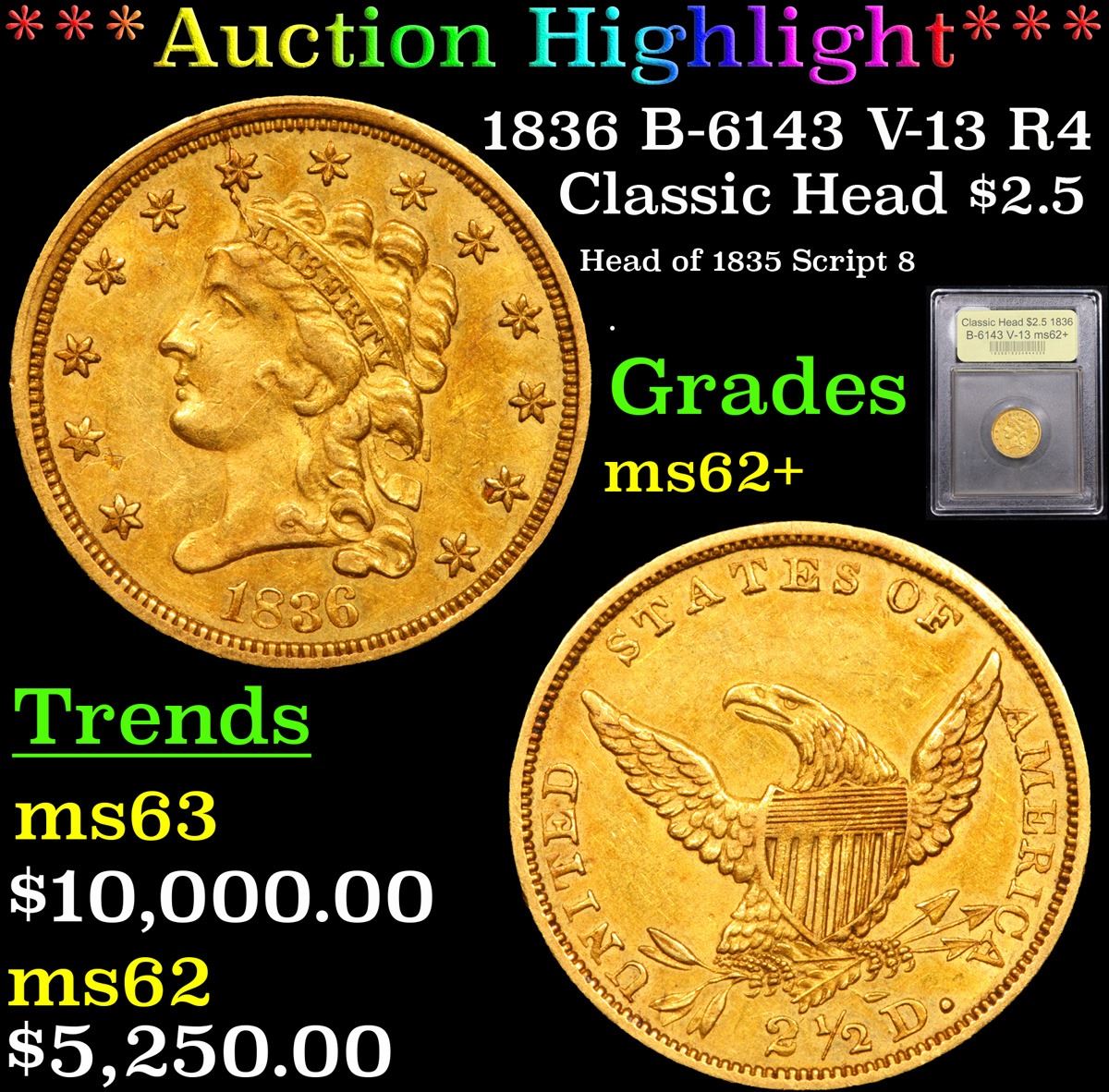 ***Auction Highlight*** 1836 B-6143 V-13 R4 Classic Head $2 1/2 Gold Graded Select Unc By USCG. 0 A substantial mintage of 547,986 Classic Head quarter eagles was accomplished in 1836, split between the Script 8 and Block 8 types. There are five die varieties known for the Script 8 type, and three different die marriages for the Block 8. This attractive Choice example represents the Script 8, Head of 1835, Variety 13, with a berry in the cluster of leaves on the olive branch. The design elements are well-detailed, with a touch of the usual softness on the central devices. A prominent die crack travels from the edge near star 6, through the field and hair, down to Liberty's jaw. The lightly marked orange-gold surfaces retain much of their original mint luster intact. Trends ms62 $5,250 ms63 $10,000