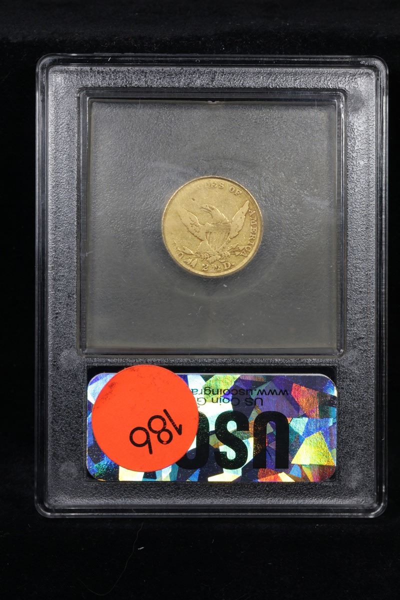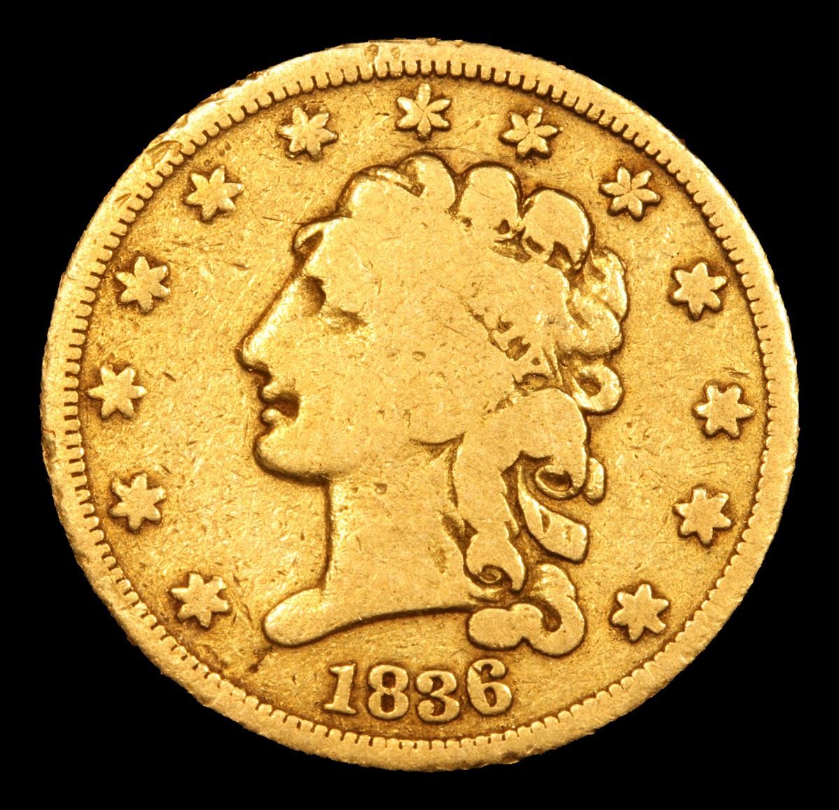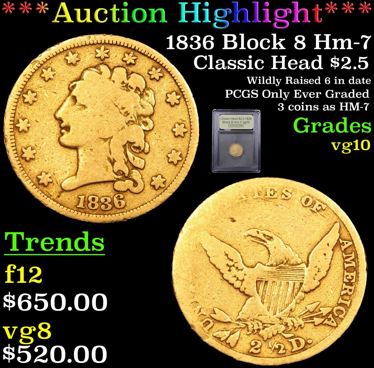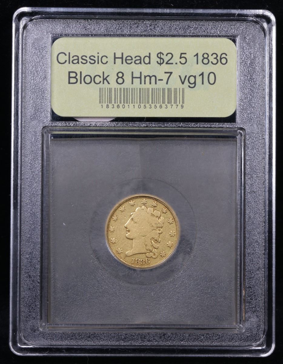 ***Auction Highlight*** 1836 Block 8 Hm-7 Classic Head Gold 2.5 Graded vg+ By USCG. Per PCGS: 1250 Survive in script 8 and 475 survive in block 8. 3 Times Rarer then script 8 A Corey's Pick, Bid to Win Coin