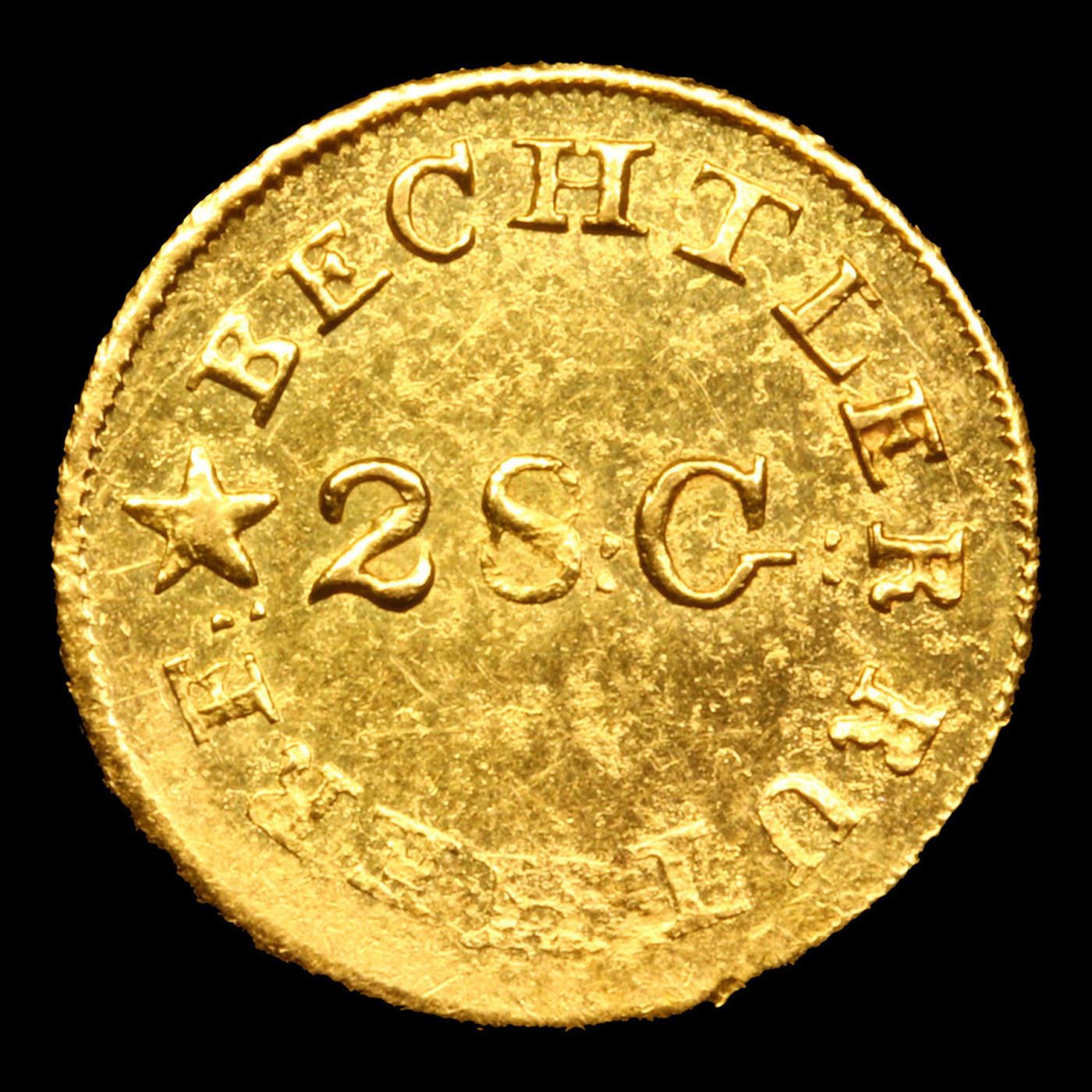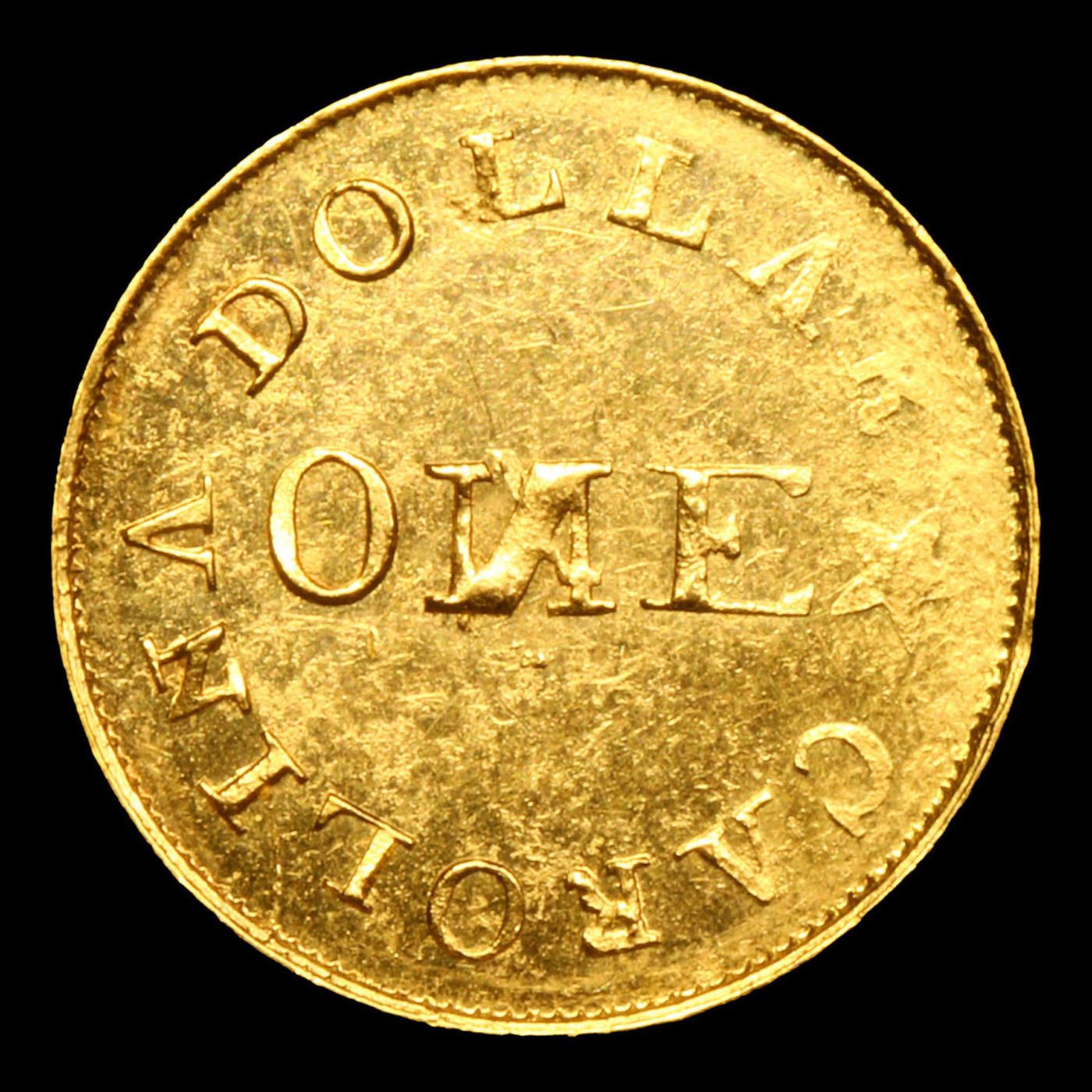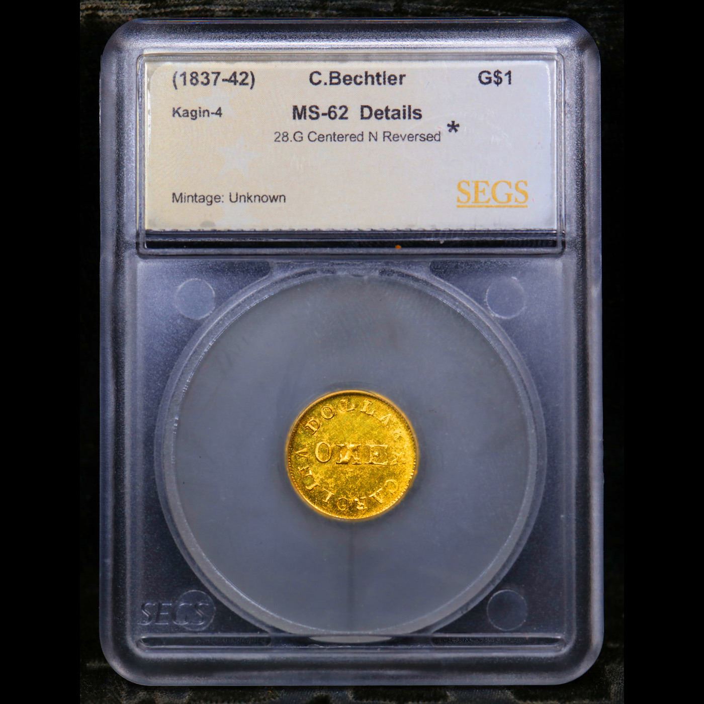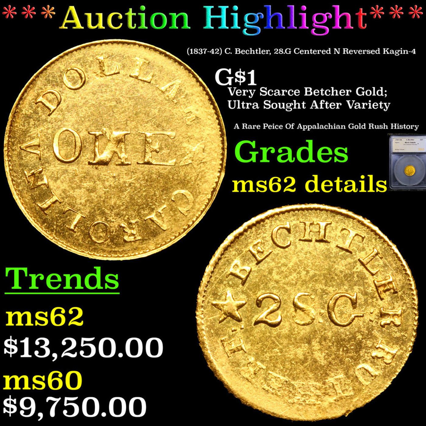 ***Auction Highlight*** (1837-42) C. Bechtler, 28.G Centered N Reversed Kagin-4 Gold Dollar $1 Graded ms62 details BY SEGS. The Bechtler family of North Carolina (later Georgia) struck gold coins using local ore in the 1830s and 1840s. They struck gold Dollar coins well before the U.S. Mint did, and the Mint may have looked to these coins for inspiration -- nhot so much for their simple design but as the model for a new, unanticipated denomination.This variety shows the N of ONE engraved backwards. The engraver may have made an attempt to correct the error, as a faint diagonal of a proper N can be seen beneath the incorrectly engraved N. While this variety is popular, it is among the most common of the Bechtler $1 varieties. This variety (K-4) with the N in ONE reversed is classified as part of the seventh series of Christopher Bechtler gold coinage, struck between 1837 and 1842. The Bechtlers' products enjoyed tremendous respect, as evidenced by the $2 million in coinage they struck over a nearly 20-year period during the Appalachian Gold RushOnly one die variety (Kagin 4) features the reversed N. A Corey's Pick, Bid to Win, Don't let it get Away, you might not find its equal Coin. I give this coin my highest recommendation