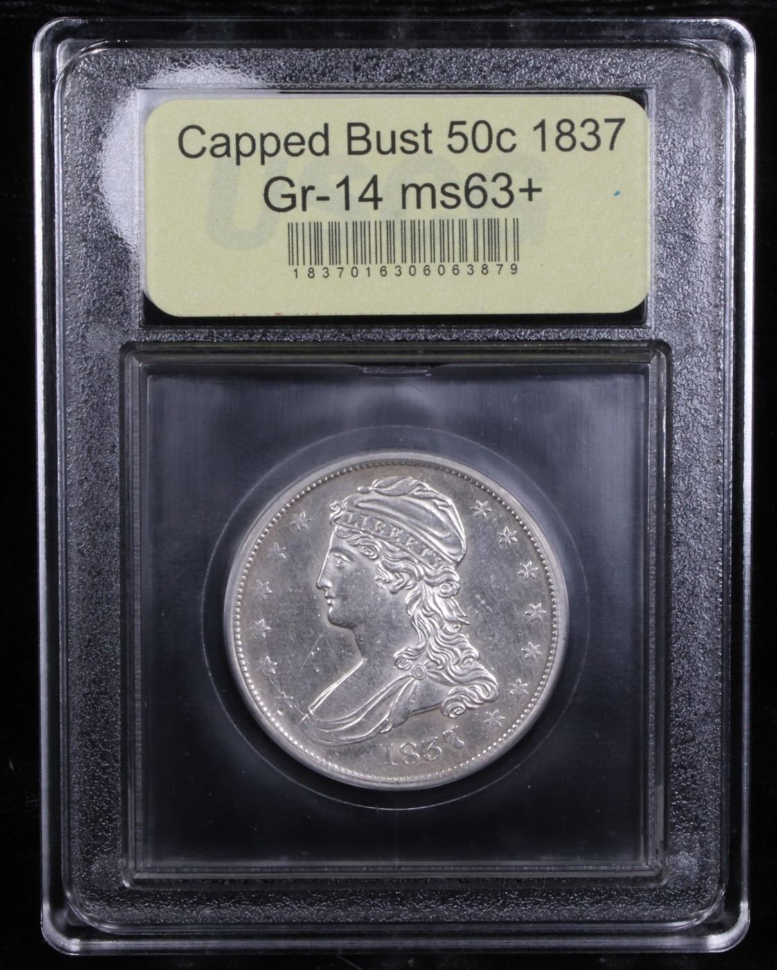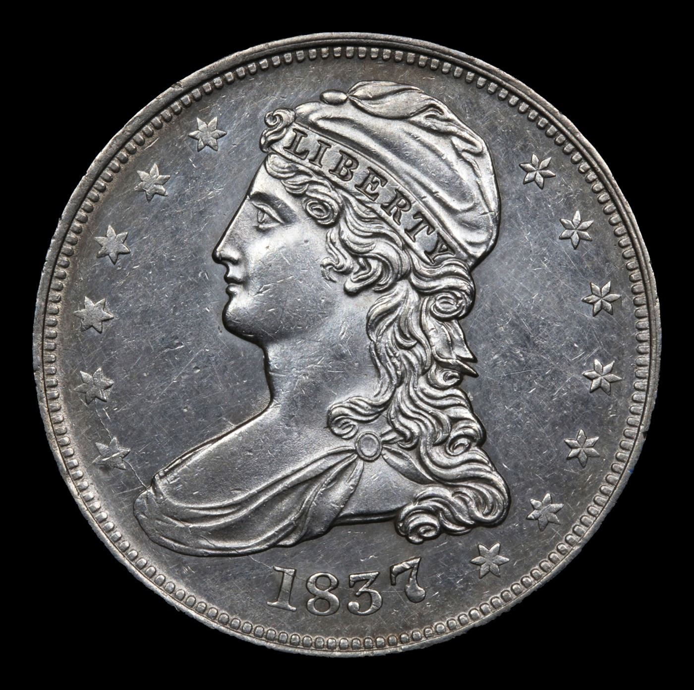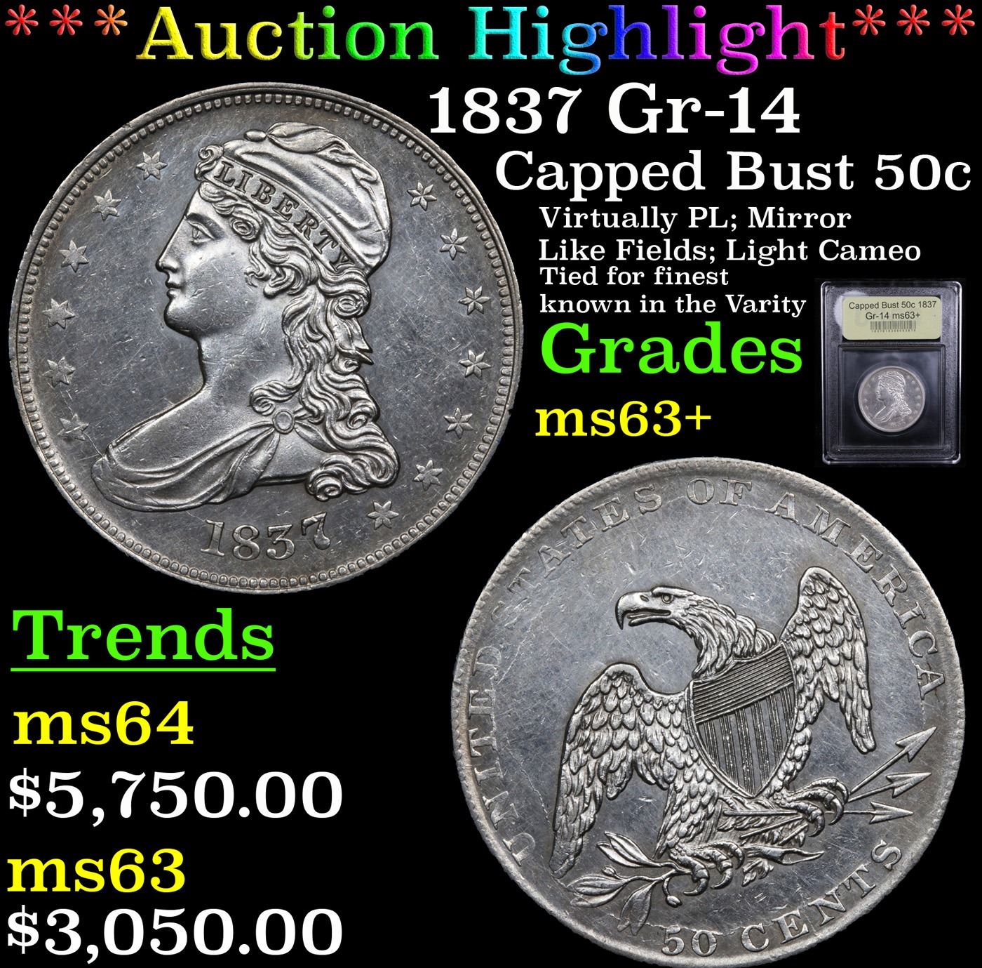 ***Auction Highlight*** 1837 Gr-14 Capped Bust Half Dollar 50c Graded Select+ Unc BY USCG. This Premium Select Unc example is tied for finest known in the variety. The GR-14 is one of the more readily identifiable die varieties of the 1837 Reeded Edge half dollar due in large part to peripheral die cracks on each side. This high-end Select example Is Virtually Proof Like with reflective fields on both sides and a very light cameo effect. The strike is sharp and grade-limiting abrasions are only noticed under a loupe. A Corey's Pick, Bid to Win, Don't let it get Away, you might not find its equal Coin. I give this coin my highest recommendation