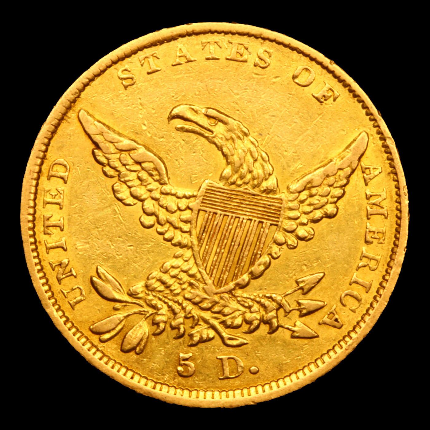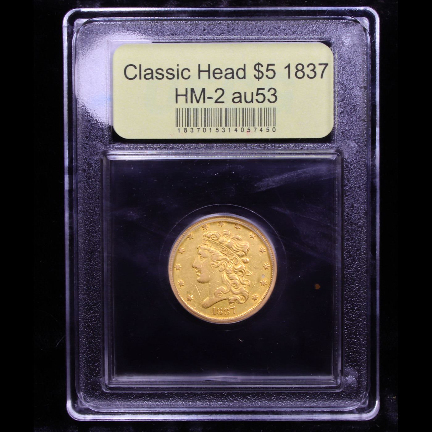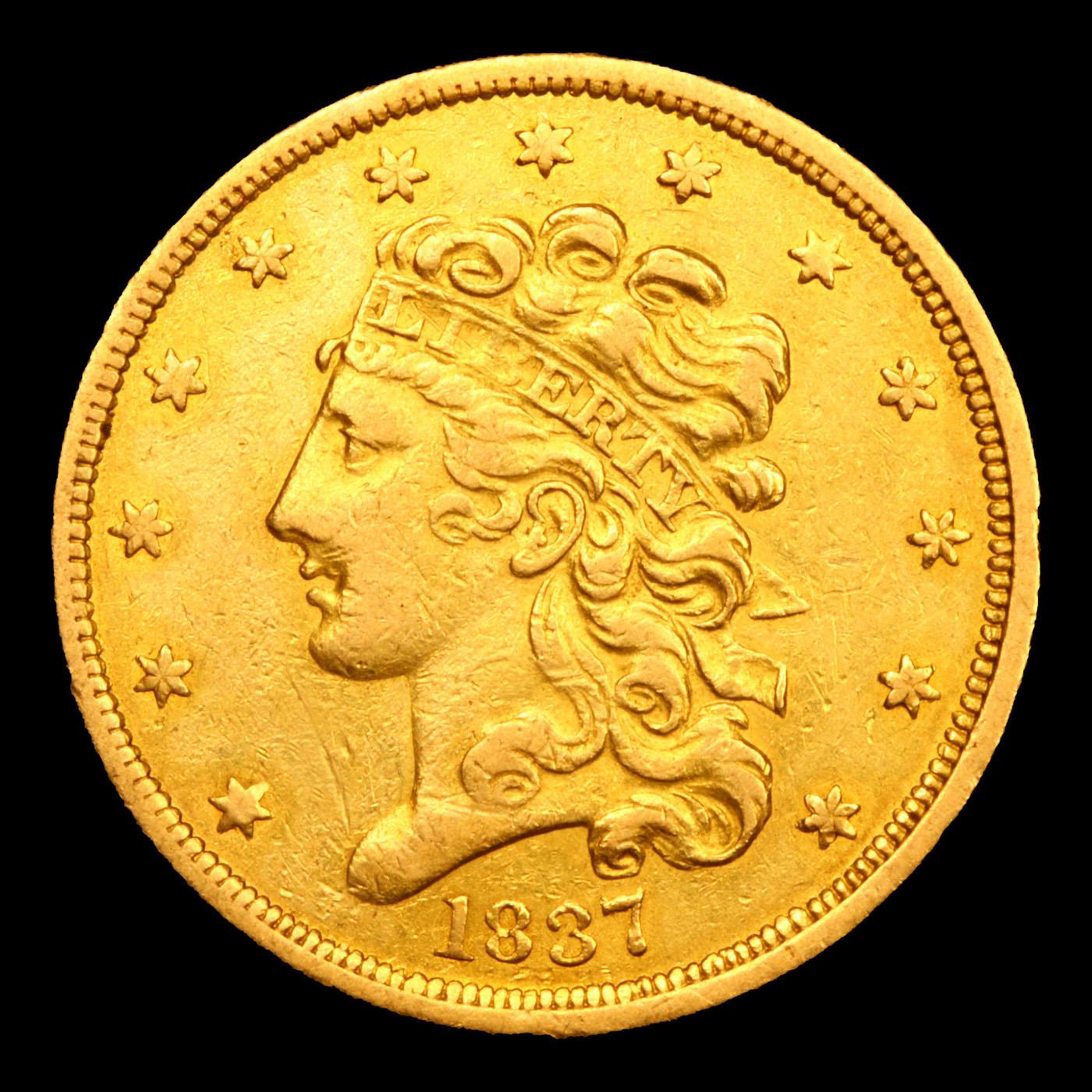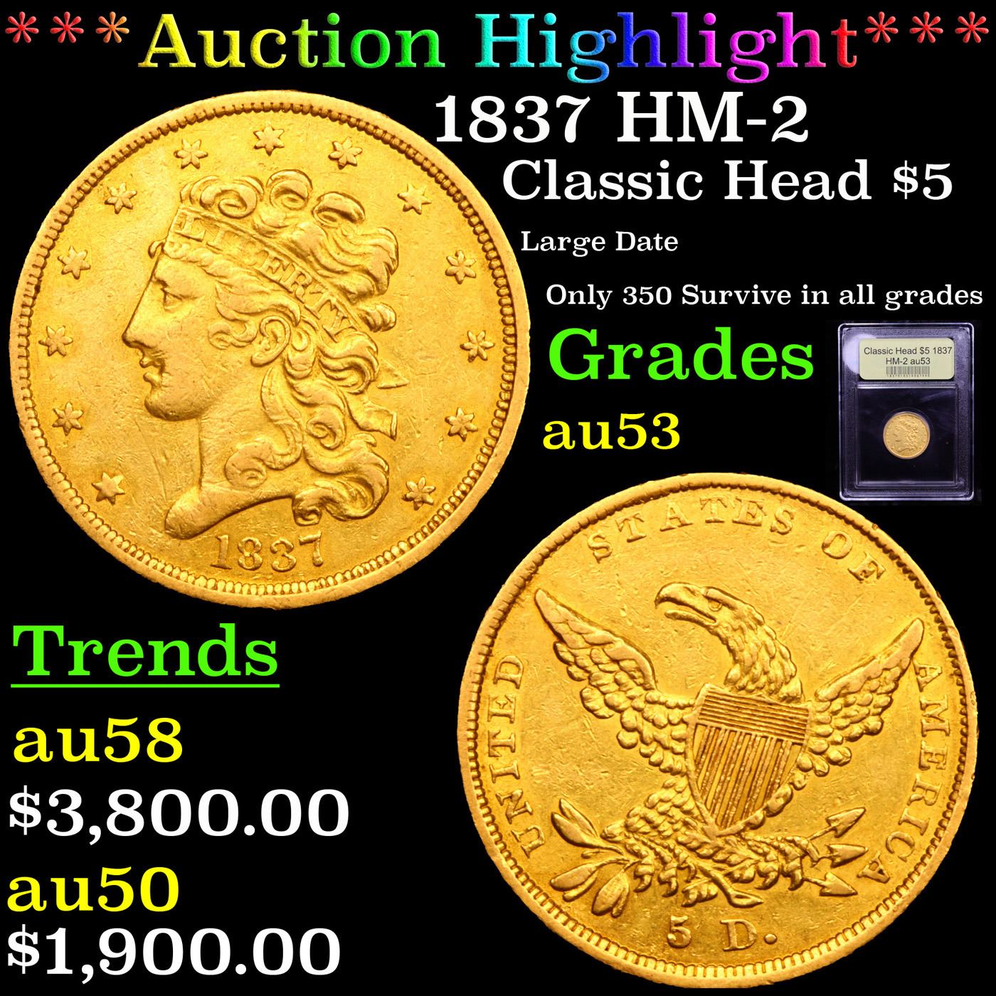 ***Auction Highlight*** 1837 HM-2 Gold Classic Head Half Eagle 5 Graded Select AU By USCG. Large Date, Block 8. A charming peach-gold Classic half eagle. The obverse field displays distributed minor abrasions but the reverse is only lightly marked. The strike is bold, and luster illuminates design recesses. Only 350 survive in all grades, and less than 150 in au and higher. A Corey's Pick, Bid to Win, Don't let it get Away Coin