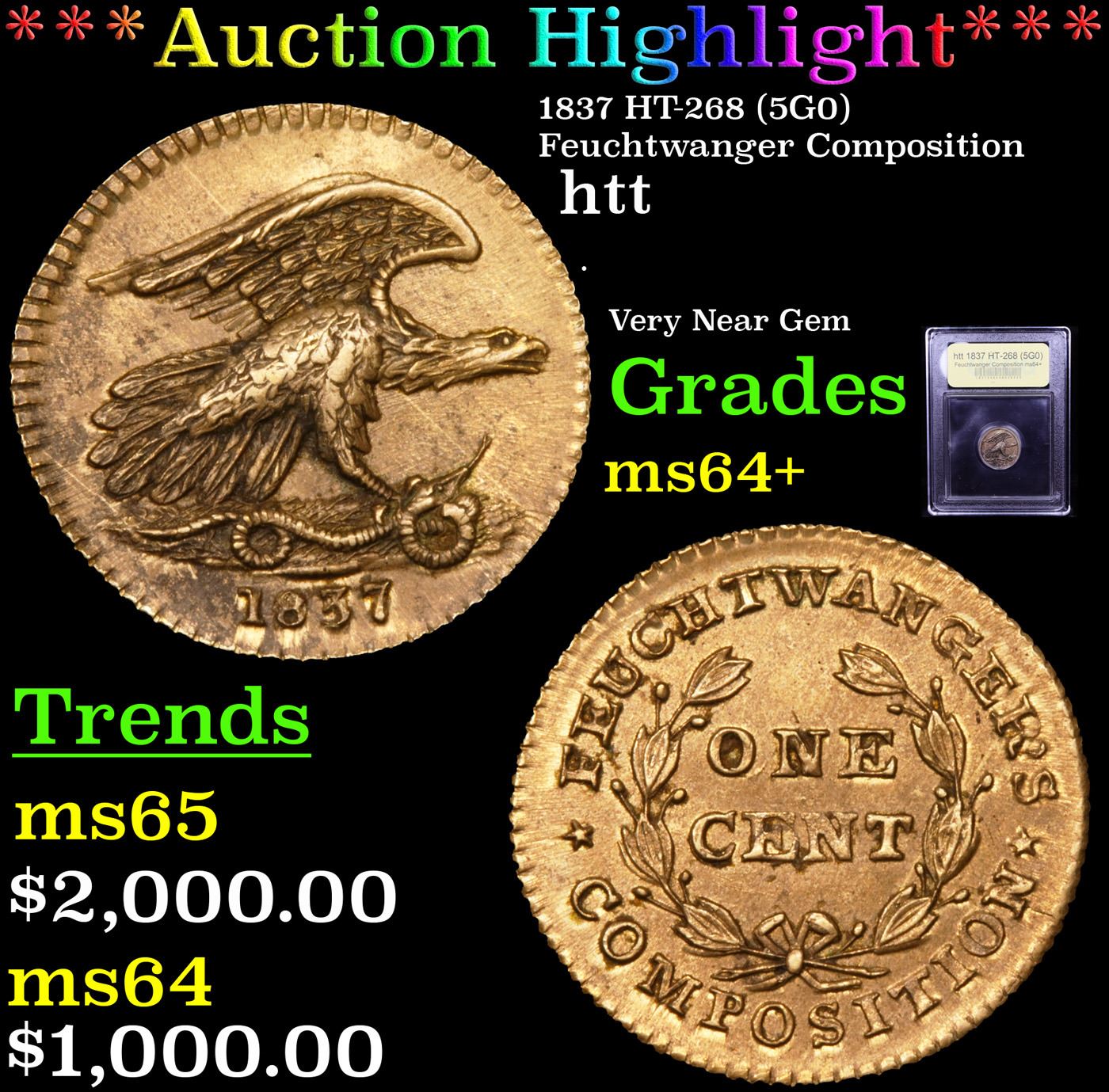***Auction Highlight*** 1837 HT-268 (5G0) Feuchtwanger Composition Hard Times Token 1c Graded Choice