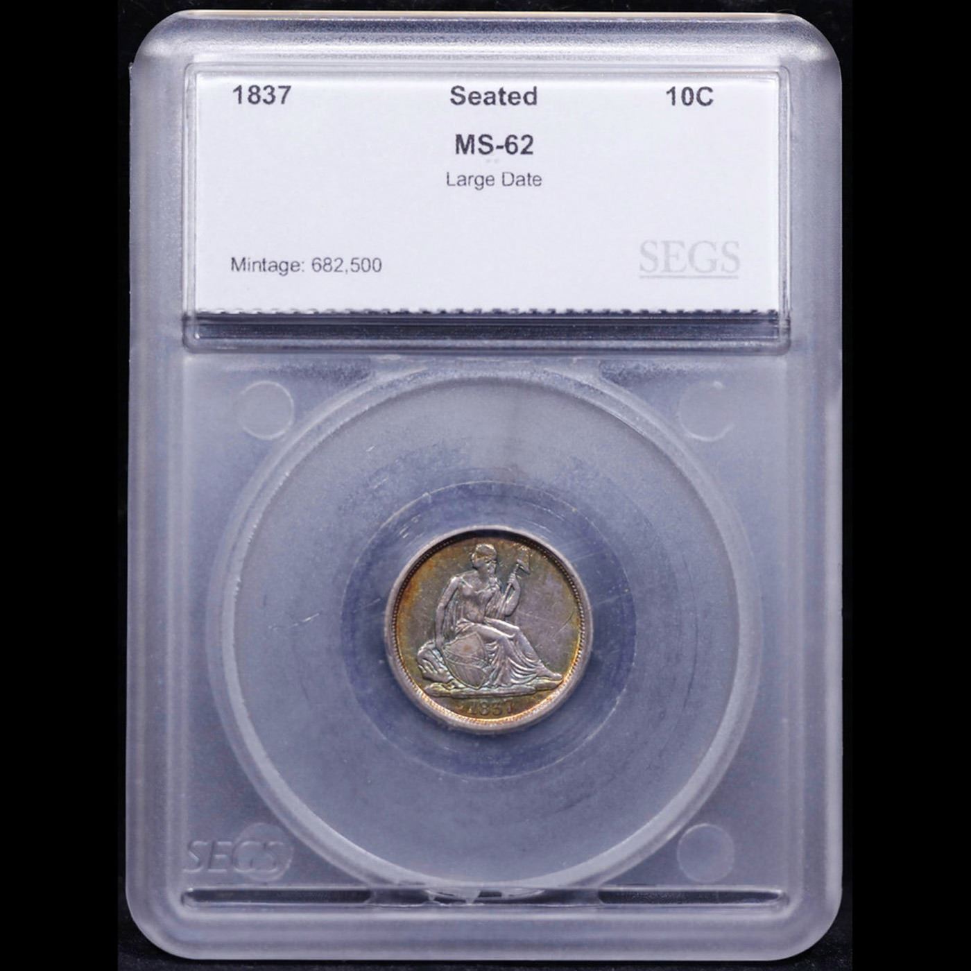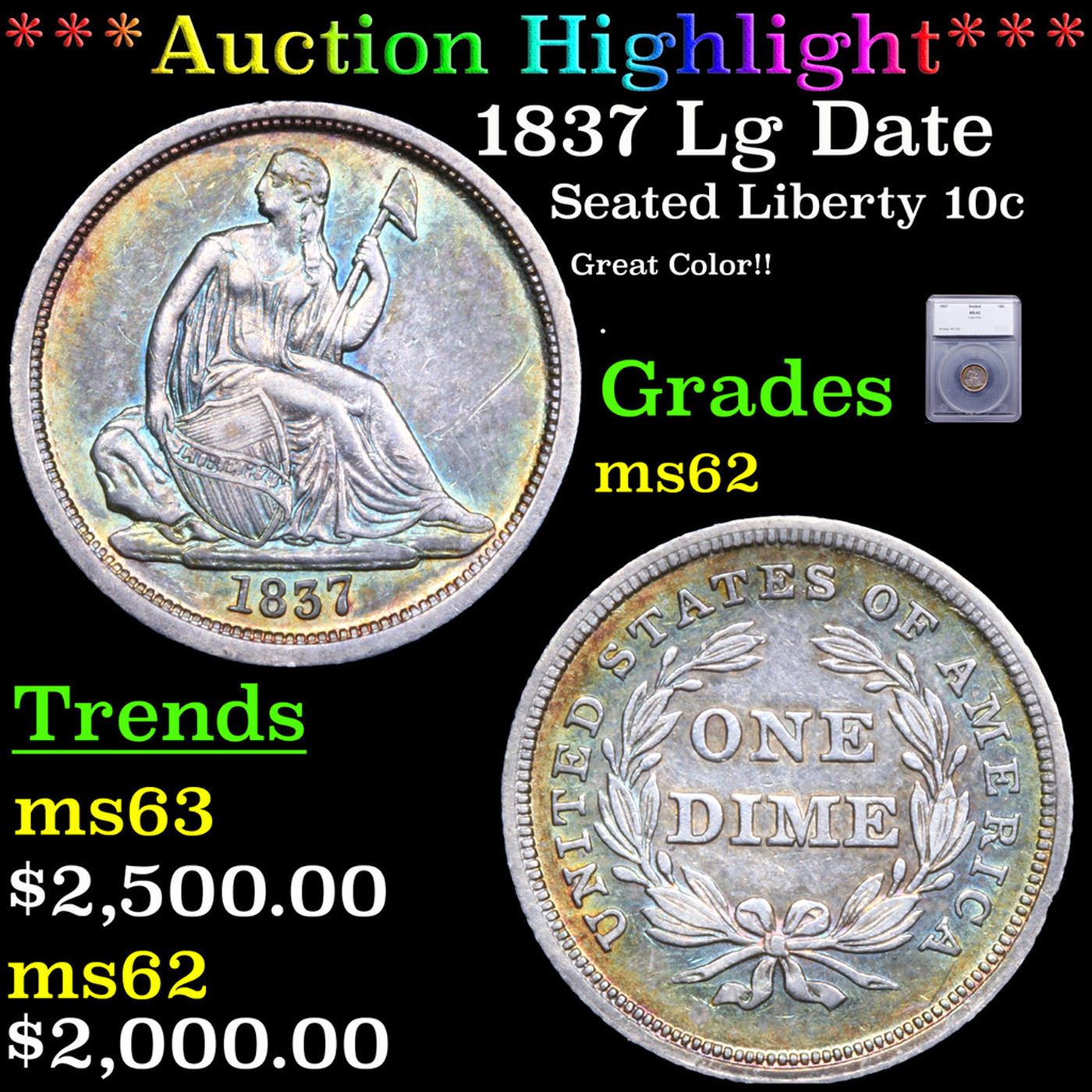 ***Auction Highlight*** 1837 Lg Date Seated Liberty Dime 10c Graded ms62 BY SEGS. A Key Date's Pick, Bid to Win, Don't let it get Away Coin