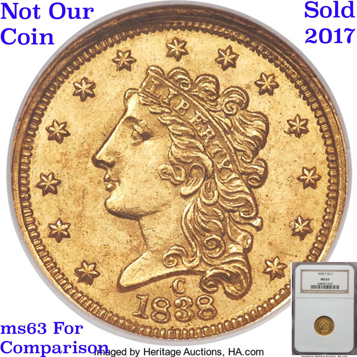 ***Auction Highlight*** 1838 C HM-1 Charlotte Classic Head Quarter Eagle $2 1/2 Graded Select Unc By USCG. A mere 7,880 pieces were struck of the 1838-C quarter eagle. Under 150 pieces are believed to exist in all grades today. The surfaces are bright with medium reddish-gold color. It has sharply defined centers but several of the peripheral stars show slightly weak centrals. A few scattered marks are mostly confined to the obverse, these being responsible for the assigned grade. The devices show light satiny luster. I have included 2 other examples for your comparison. I think our example far surpasses the ms62 and is at least equal to the ms63. A Corey's Pick, Bid to Win, Don't let it get Away, you might not find its equal Coin. I give this coin my highest recommendation