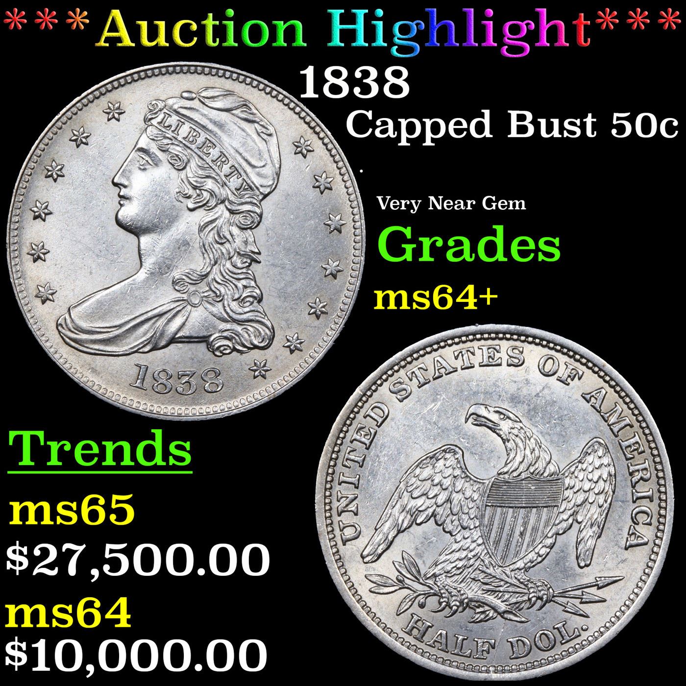 ***Auction Highlight*** 1838 Capped Bust Half Dollar 50c Graded ms64+ BY SEGS. A Corey's Pick, Bid to Win, Don't let it get Away, you might not find its equal Coin. I give this coin my highest recommendation