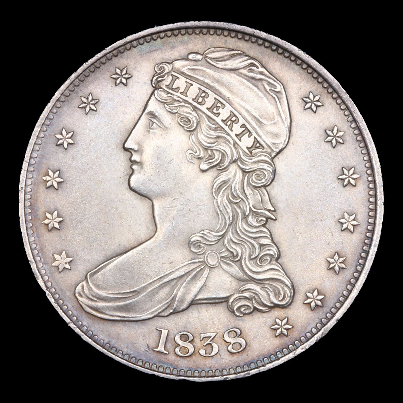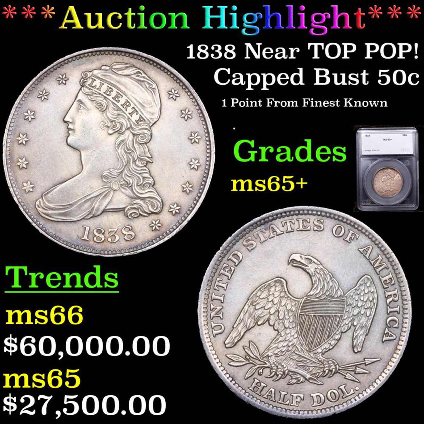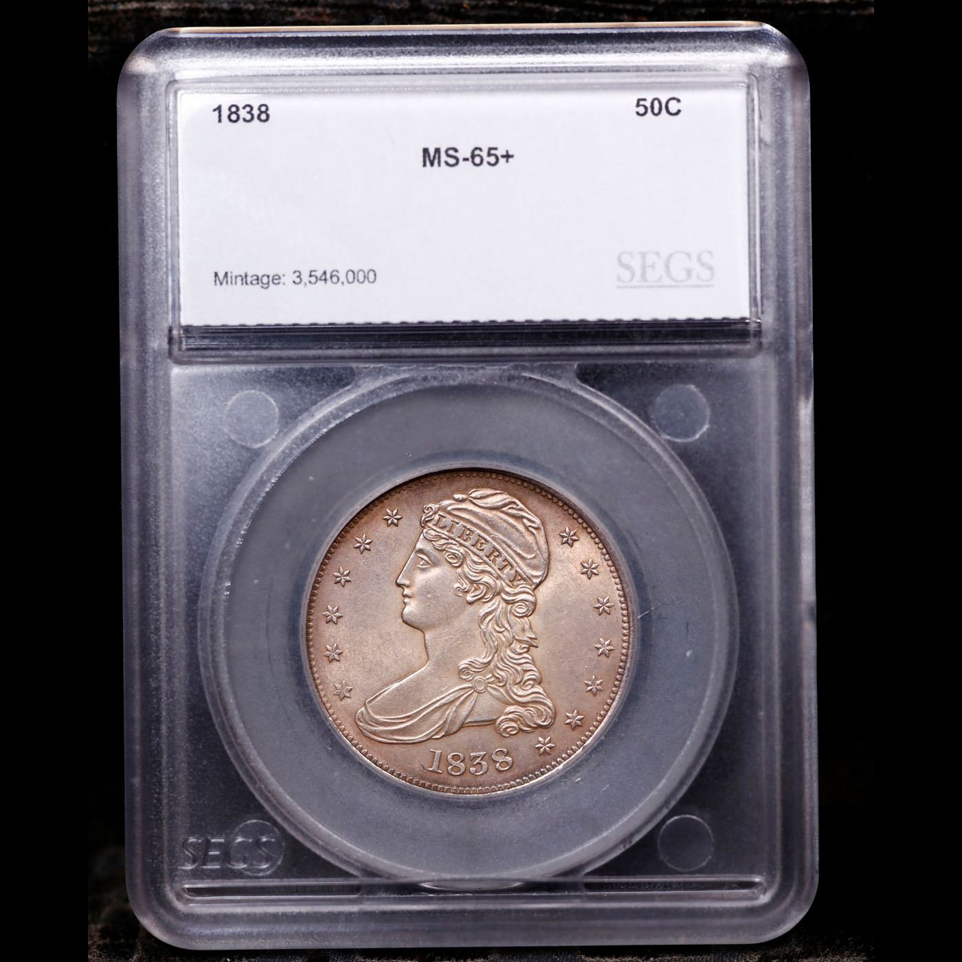 ***Auction Highlight*** 1838 Near TOP POP! Capped Bust Half Dollar 50c Graded ms65+ By SEGS. In 1838 the half dollar was subject to additional design modifications. This time the denomination was modified to read HALF DOL. on the reverse, likely to bring it more in line with the quarter dollar. This, too, ended up being a short-lived transitional type replaced in 1839 by the highly successful Liberty Seated design. This series is notable as being the first coins ever struck at a branch mint when 20 Proof half dollars rolled off the presses at the newly opened New Orleans Mint, creating one of the most desirable rarities in American numismatics. At the Philadelphia Mint, 3,546,000 half dollars were struck in 1838 and additional examples were produced in 1839. Since silver dollars were practically unknown in everyday commerce aside from Spanish-American dollars, the half dollar was one of the preferred silver coins for banks to hold in vaults, usually in large bags, resulting in coins that have bag marks and scuffs. As with many of the half dollars from the period, the 1838 is available with relative ease through the lower end of the Mint State scale, but is seldom found above MS-63. Due to the brevity of the design, both half dollar enthusiasts and type collectors seek out particularly nice examples, creating continual pressure for the few remaining Gems. An assemblage of Gem Mint State half dollars from 1836 to 1839 showing the transition from the Capped Bust to the Liberty Seated design would be most impressive and a worthy challenge for the advanced numismatist. A Key Date's Pick, Bid to Win, Don't let it get Away, you might not find its equal Coin. I give this coin my highest recommendation