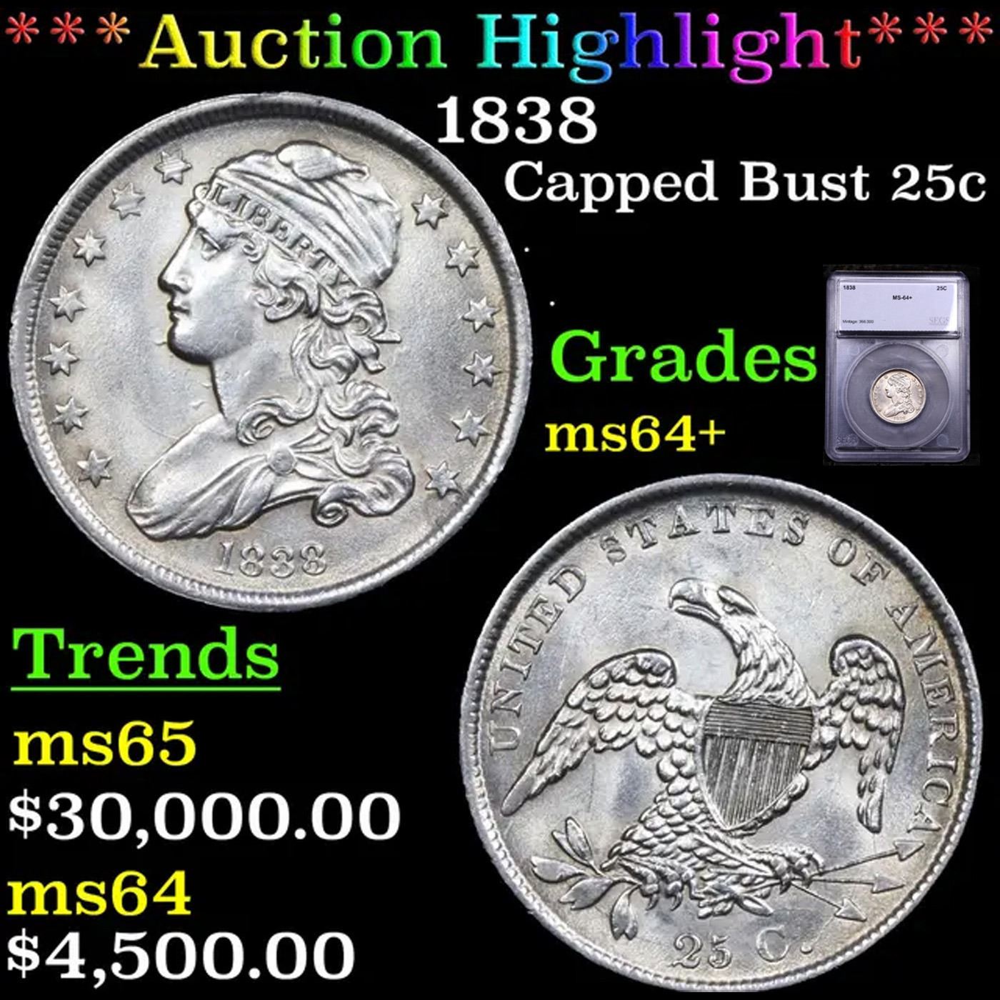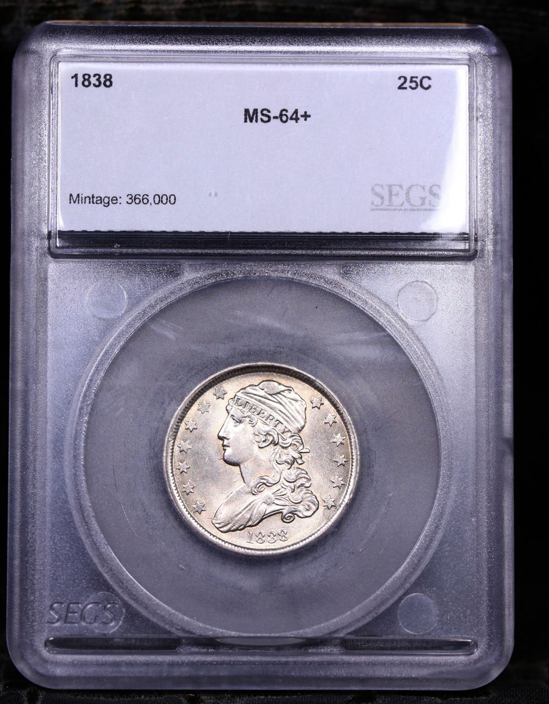 ***Auction Highlight*** 1838 Capped Bust Quarter 25c Graded ms64+ By SEGS. A Key Date's Pick, Bid to Win, Don't let it get Away, you might not find its equal Coin. I give this coin my highest recommendation