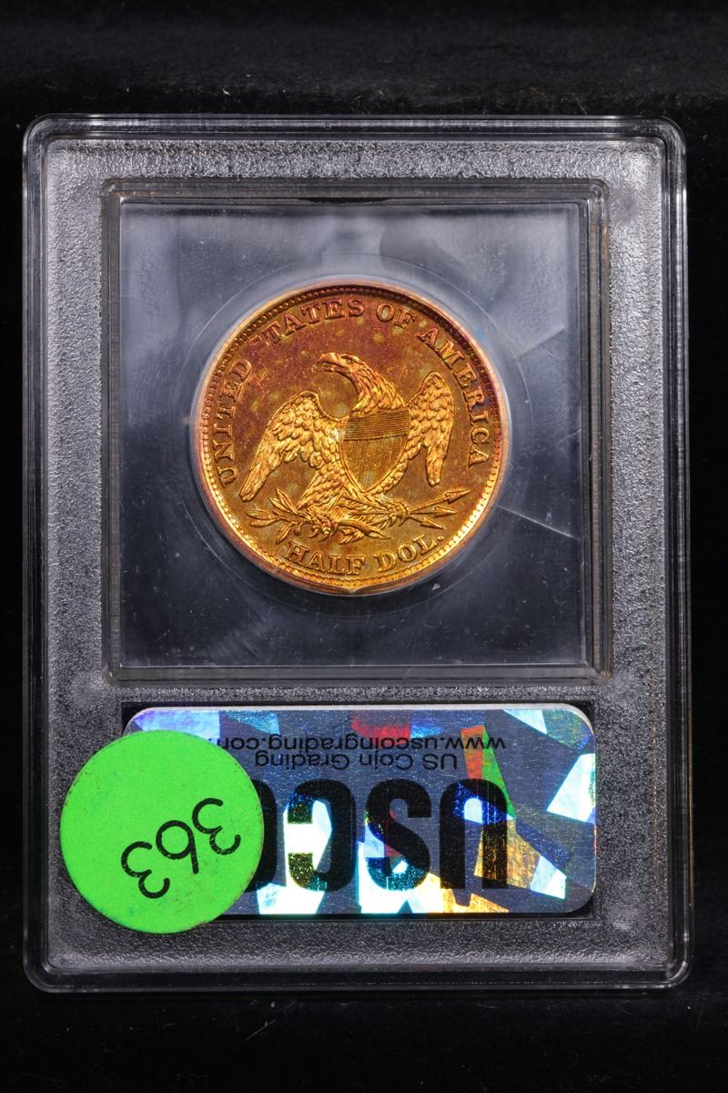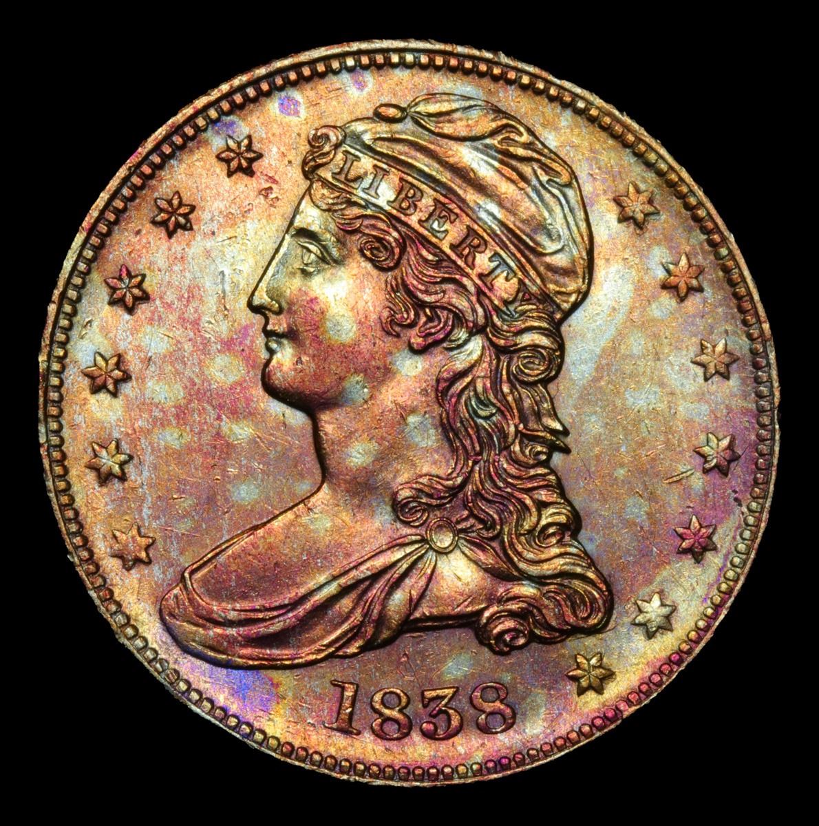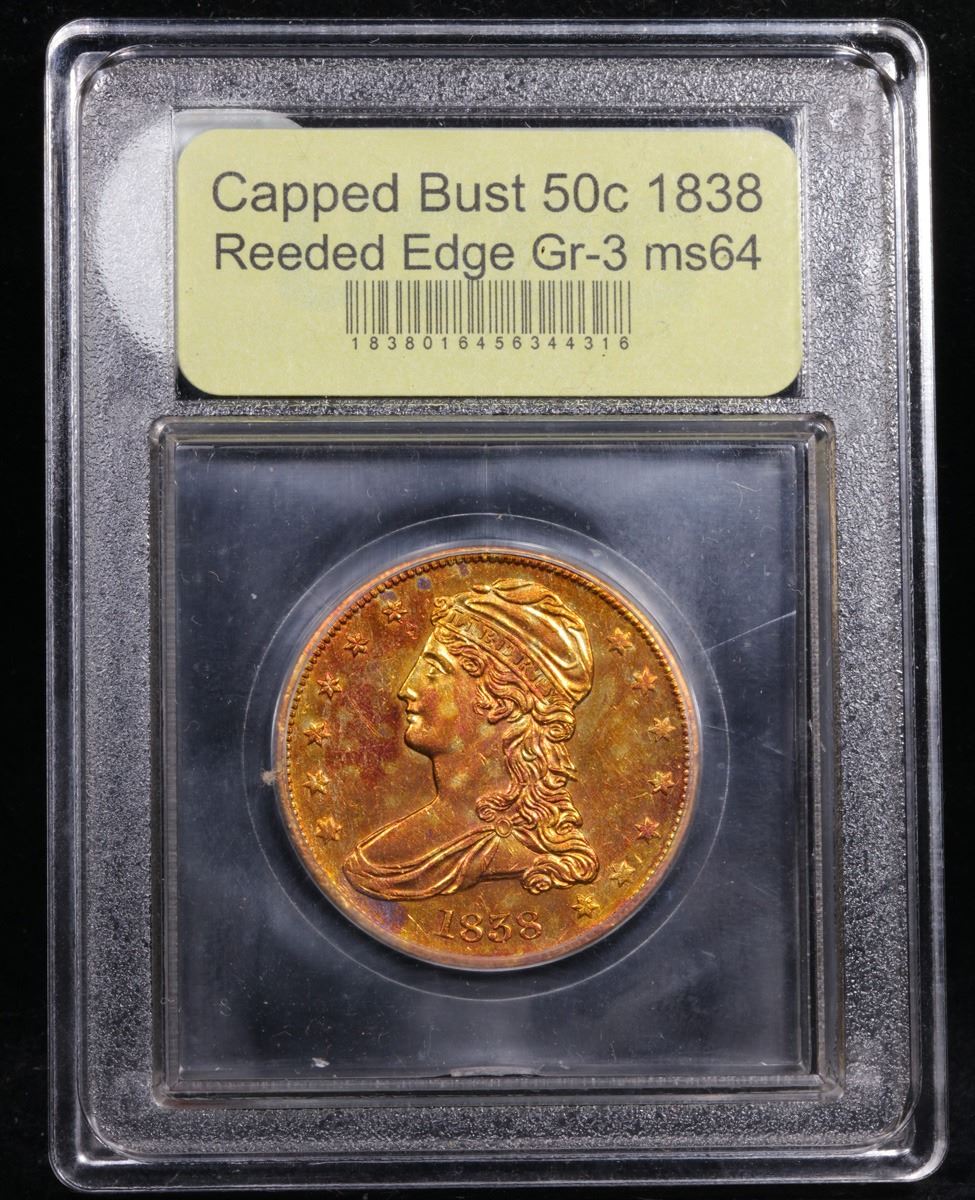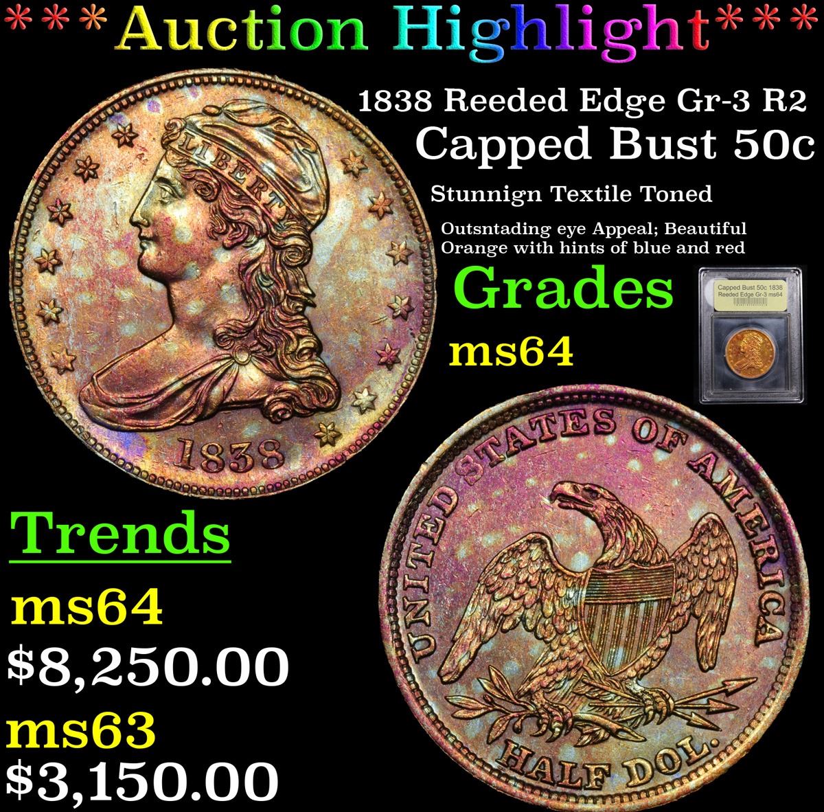 ***Auction Highlight*** 1838 Reeded Edge Gr-3 R2 Capped Bust 50c Graded Choice Unc By USCG. Stunning Textile Toned 1838 Reeded Edge Capped Bust Half. Outstanding Eye Appeal. Incredible Textile Toning throughout the Obverse and Reverse. Beautiful orange with some hints of blues and reds throughout, But the textile toning is absolutely Rare and sought. Trends ms64 $8,250 A Corey's Pick, Bid to Win, Don't let it get Away, you might not find its equal Coin