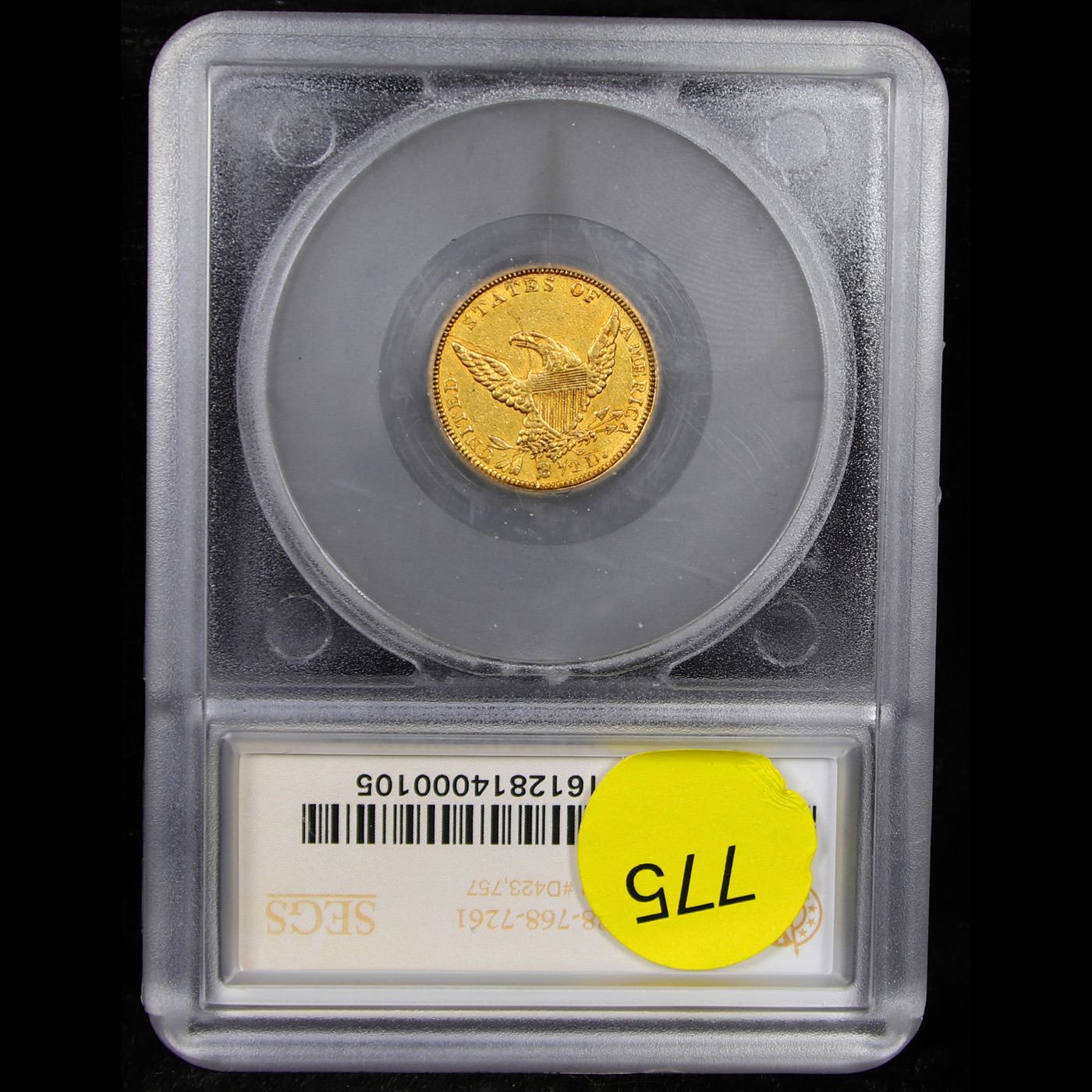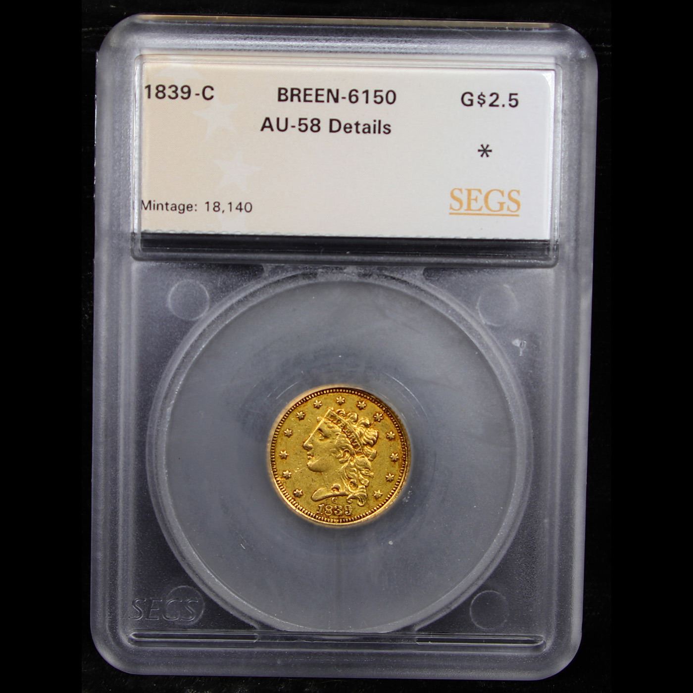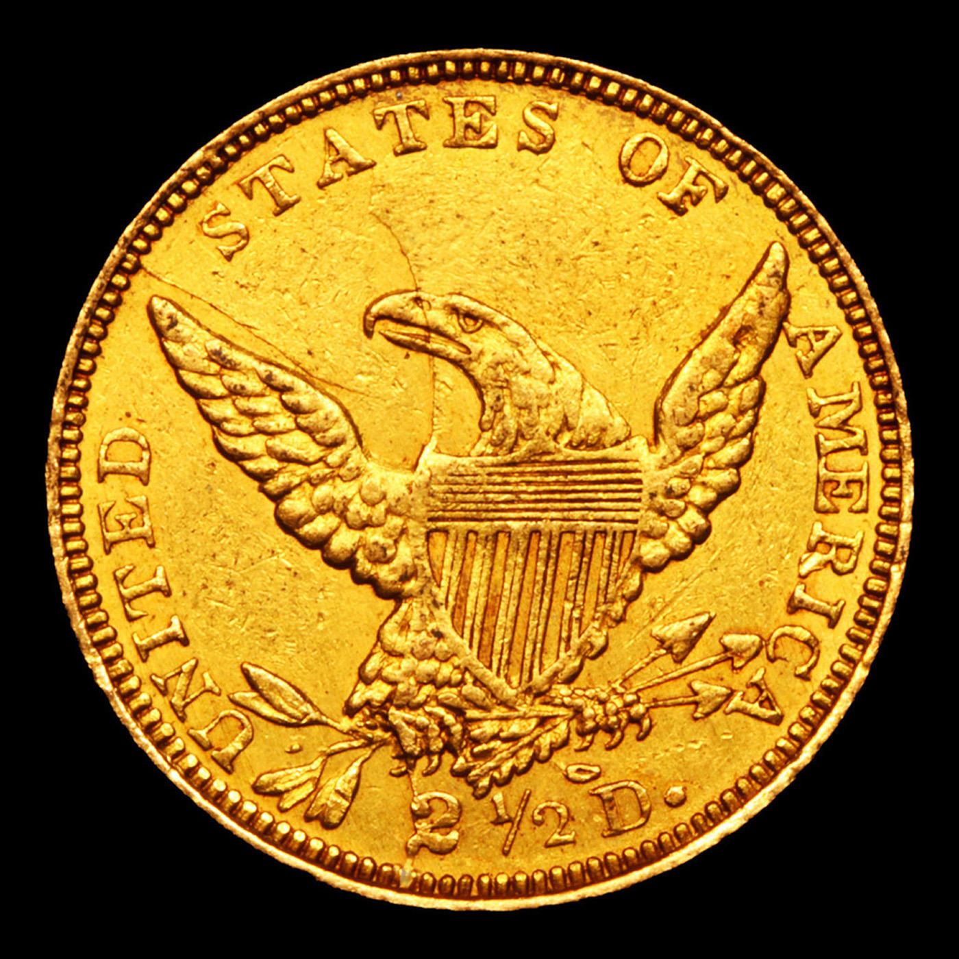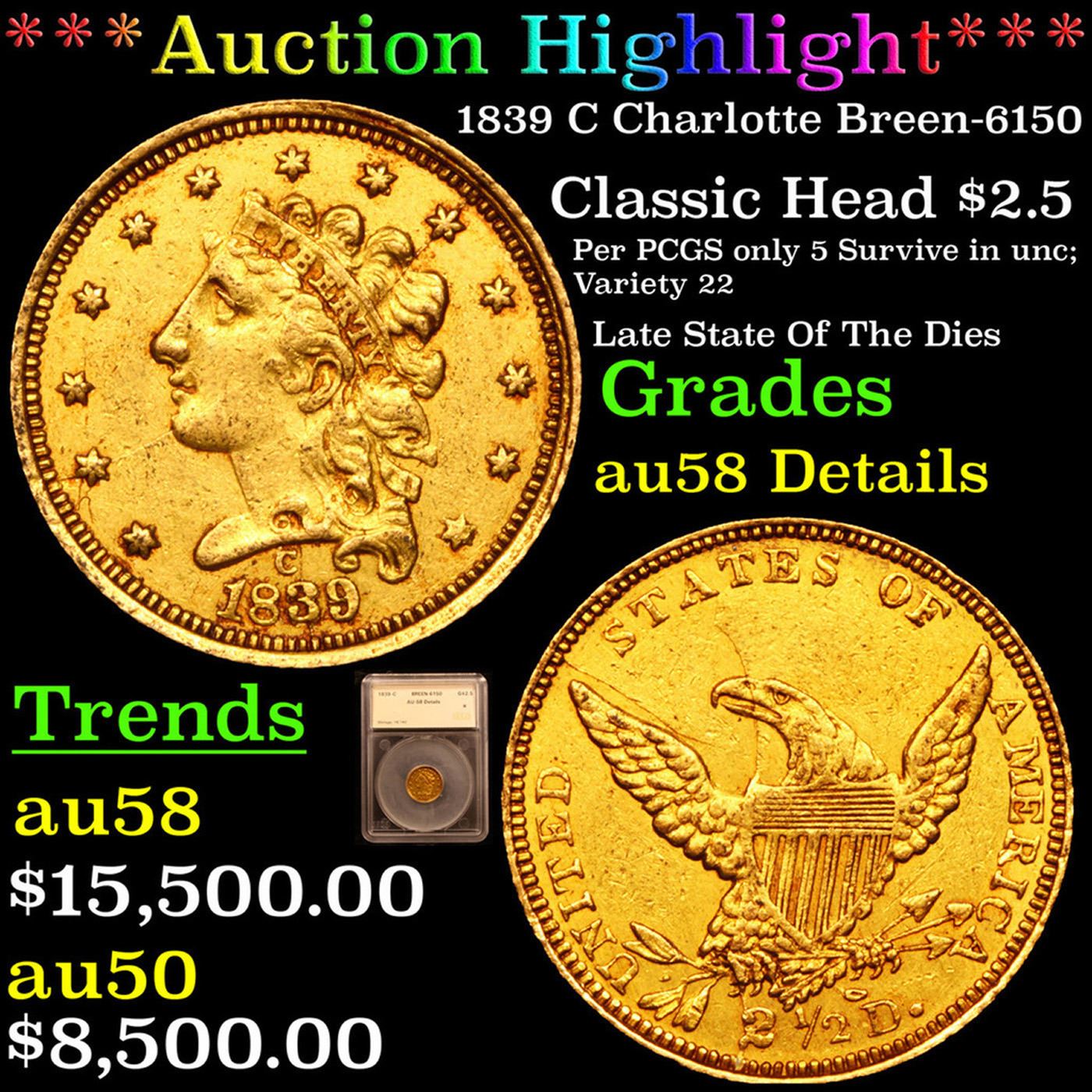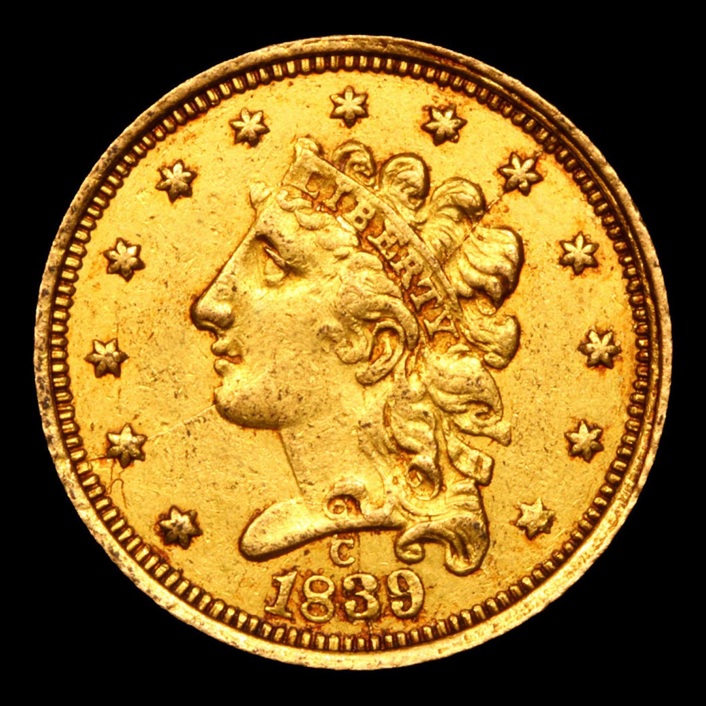 ***Auction Highlight*** 1839 C Charlotte Breen-6150 Gold Classic Head Quearter Eagle $2 1/2 Graded au58 Details By SEGS. Up for Auction is one of the few surviving near mint state examples of the 1839-c $2 ½ Classic Head Gold. Second and final year of the Obverse Mintmark subtype, here from the Charlotte Mint which, like New Orleans and Dahlonega, had opened the previous year, 1838. The 3 in the date is recut to the north of the original digit, while the 9 in the date is recut to the east. Both sides have a series of interesting die cracks. The obverse has a crack that runs through the left side of the original low 3 in the date, through the later 3, upward onto the face to the earlobe. A second crack, from a late state where the die may be close to shattering, runs from the obverse centering dot through the cheek and to star 2. Yet another runs from the top of the T in LIBERTY to star 9. On the reverse, one crack runs from under the beak to near the top of the eagle's wing and onward to the rim. A second crosses from the left (facing) top shield point, through the beak and to the lower right corner of the A in STATES. A final crack runs from the eagle's claws down through the large 2 and thence to the rim. Both sides are orange-gold with glints of hazel. Minor field chatter and a few light abrasions are grade-consistent, although mentionable marks are few save for scattered tiny carbon spots. This piece is a rarity, as both the issue and the variety are seldom seen in near-Mint State. A Corey's Pick, Bid to Win, Don't let it get Away, you might not find its equal Coin