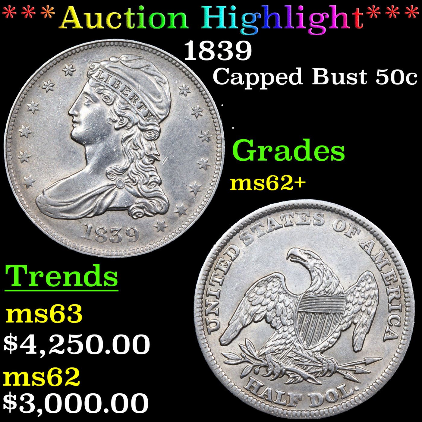 ***Auction Highlight*** 1839 Capped Bust Half Dollar 50c Graded Select Unc BY USCG (fc)